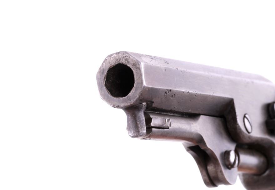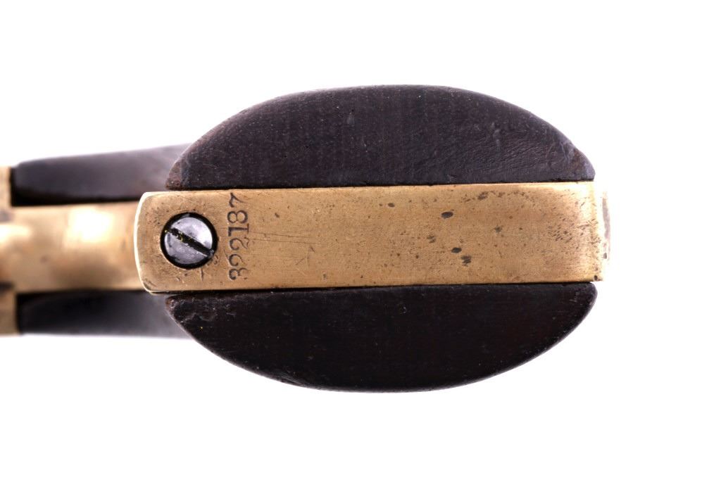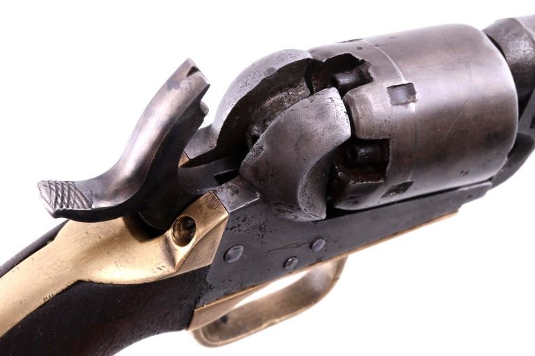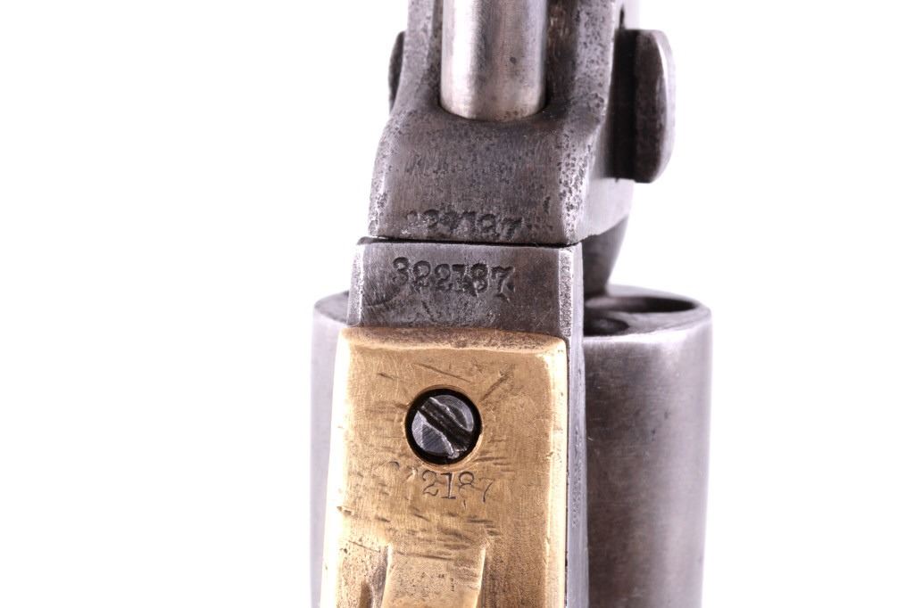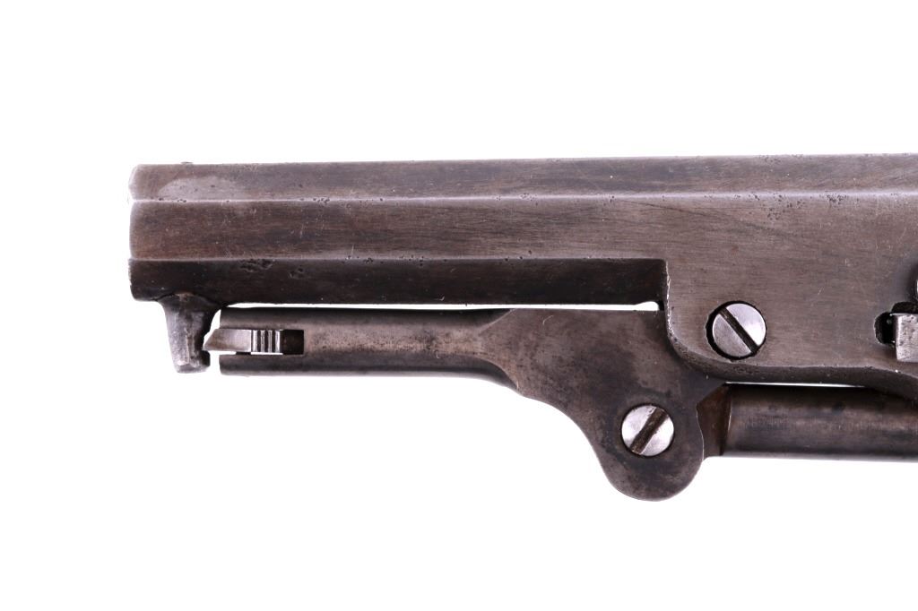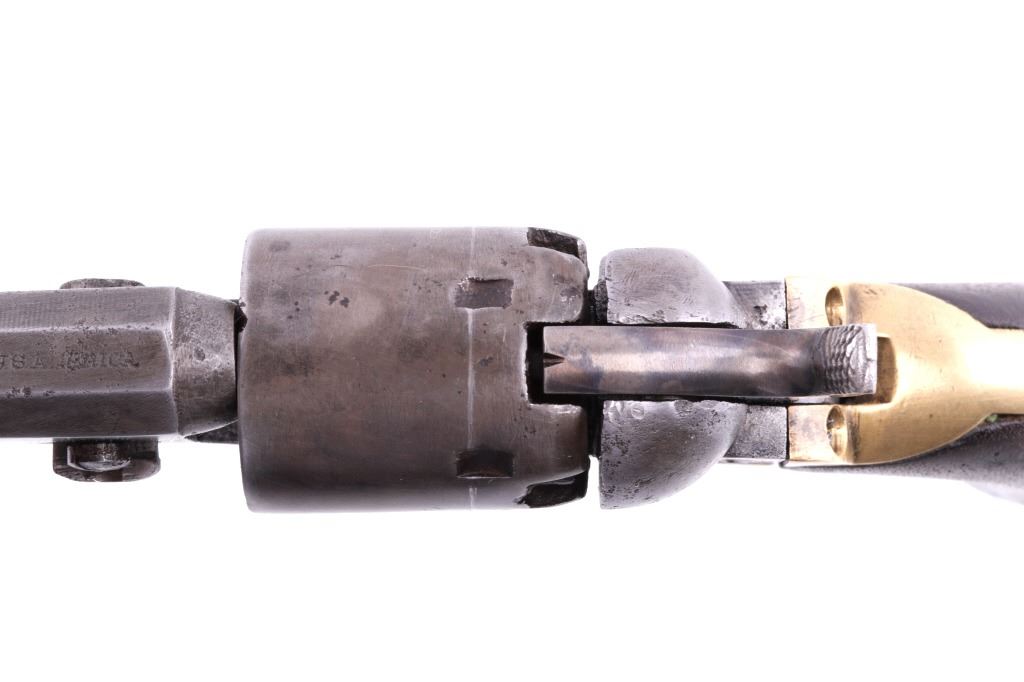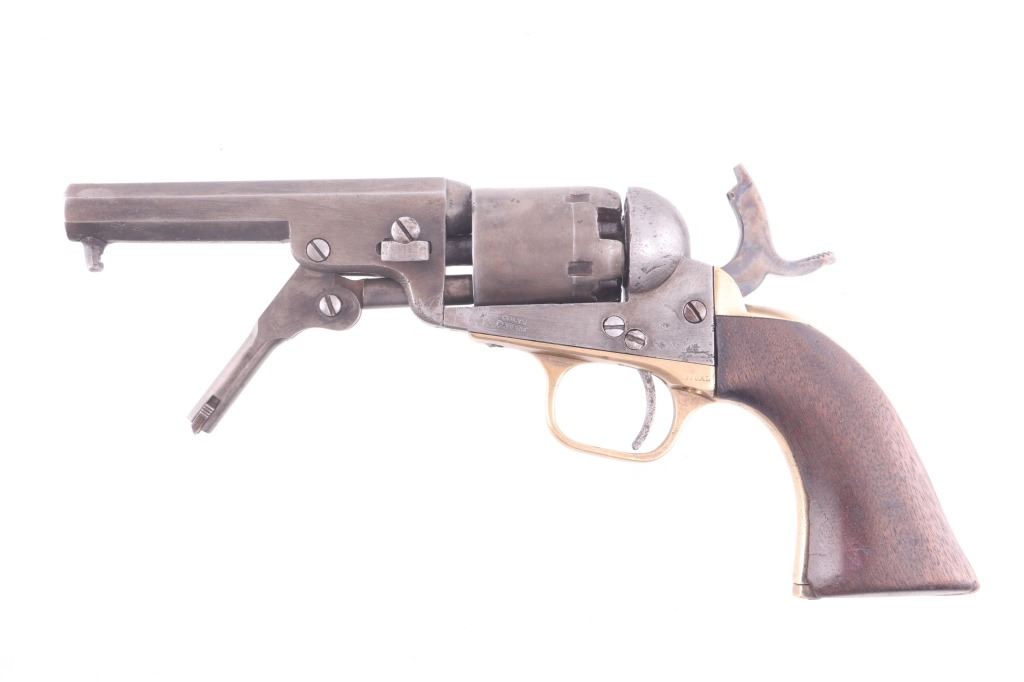 Colt Model 1849 Pocket Revolver with 4” octagon barrel and serial number 322187, indicating a scarce Post-Civil War manufacture date of 1870. This is a fine, original example .31 caliber, five-shot revolver that found favor with officers and enlisted men as personal weapons during the Indian Wars of the period. Many of these also saw service in the gold fields of California, the settling West, and in about all urban areas during this very turbulent time of Post-Civil War Reconstruction. The 1849 was one of Colt’s most popular designs that was large enough for aimed fire, but small enough to conceal in a waste band or unobtrusive holster. They also found favor with gamblers and “ladies of the evening.” The barrel is correctly marked “ADDRESS SAM’L COLT NEW-YORK US AMERICA”, along with “COLT’S PATENT” on the left side of the frame and “31 CAL.” on the side of the trigger guard. The revolver features nice, overall aged patina metal. Fine walnut grips show only normal light wear. This example also shows a mellow, uncleaned brass back strap and trigger guard. This revolver, with very attractive overall appearance, has all sharp markings, matching serial numbers, fine screws, and original loading lever. This is one of the most popular and successful of the Colt percussion revolvers and a key model for any Colt or Old West collection. Serial Number: 322187. This firearm qualifies as an Antique and does not require FFL Transfer or NICS Background Check.