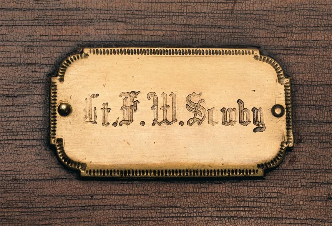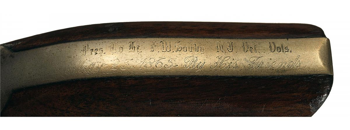 Manufactured in 1859. The top barrel flat is marked with the two line New York City address inside brackets. The left side of the frame is stamped "COLTS/PATENT." The cylinder has the stagecoach hold up scene. The upper front left side of the trigger guard is marked "V". The back strap is inscribed "Pres To Lt. F.W. Sowby N.J. Vet. Vols./May 25 1865 By His Friends". Matching serial numbers are found on the barrel, frame, trigger guard, back strap and cylinder with the wedge having the matching partial serial number "55090" and "5090" on the loading lever and cylinder pin. Fitted with a smooth varnished one piece walnut grip. Comes with a period wooden case/lap desk with a brass plaque on the lid inscribed "LT. F.W. Sowby" and decorative scroll and shield and star motif brass corner adornment. There is a compartment in the lid with a fold down door which can be used to write on. The body of the case has a large compartment divided into 2 compartments and covered by a hinged lid. In the front of the case are three compartments that can be used for writing utensils and accessories. The lids are partially covered with blue felt. An internet check for Lt. Sowby met with negative results.