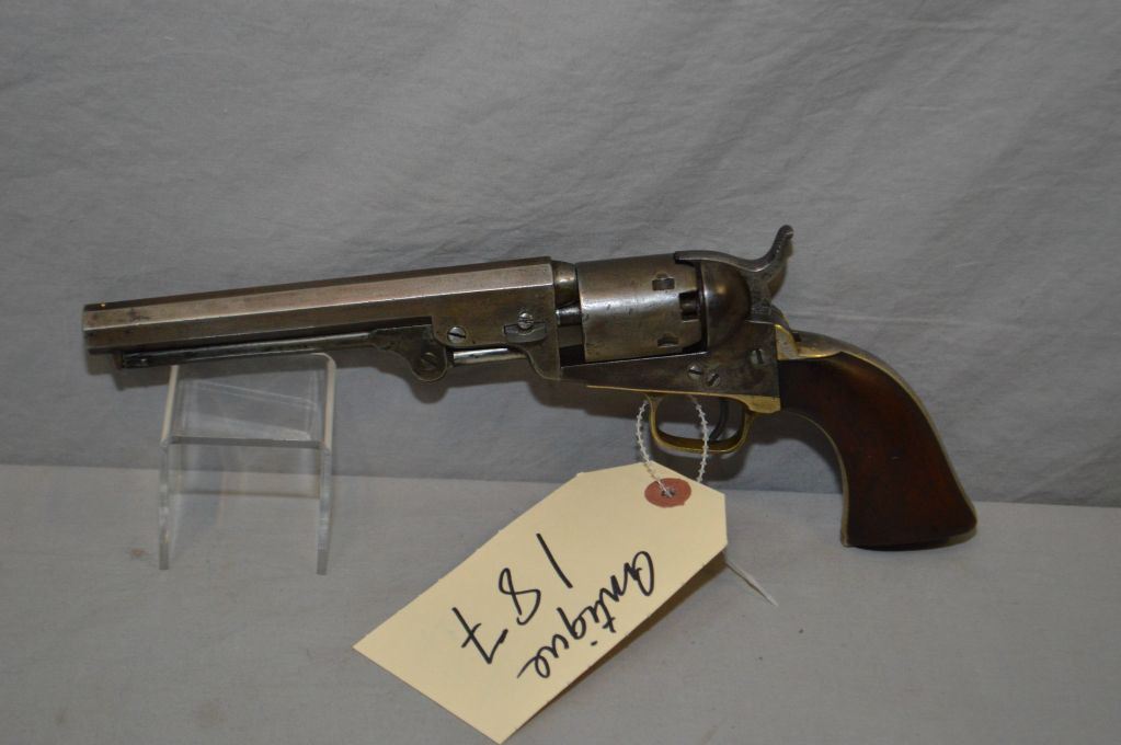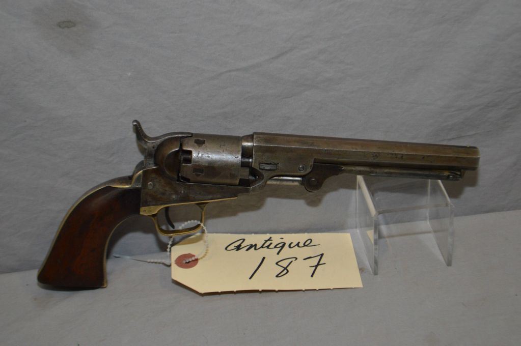 Colt Model 1849 Pocket .31 Perc Cal 5 Shot Revolver w/6"octagon bbl [ barrel # 261091 ( mis-matched to the gun ) patchy faded blue finish turning brown, faint cylinder scene, cannot see cylinder number, case hardened hammer, and frame is stamped "Colt's Patent", brass trigger guard & grip strap, showing some silver plate, one piece walnut grip with some wear and old small chips, barrel marked "ADDRESS COL.SAML COLT NEW - YORK US AMERICA ", Circa 1852 , Pre Civil War, frame & grip straps all marked Ser # 23199 ] Ser # 23199 ANTIQUE NO PAL REQ