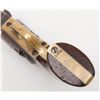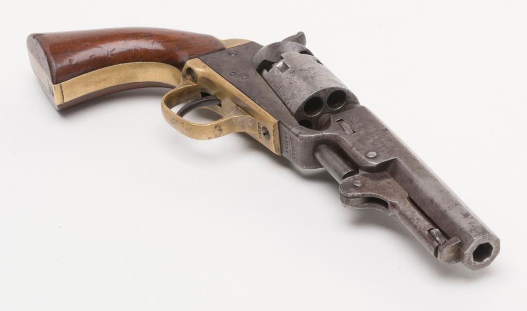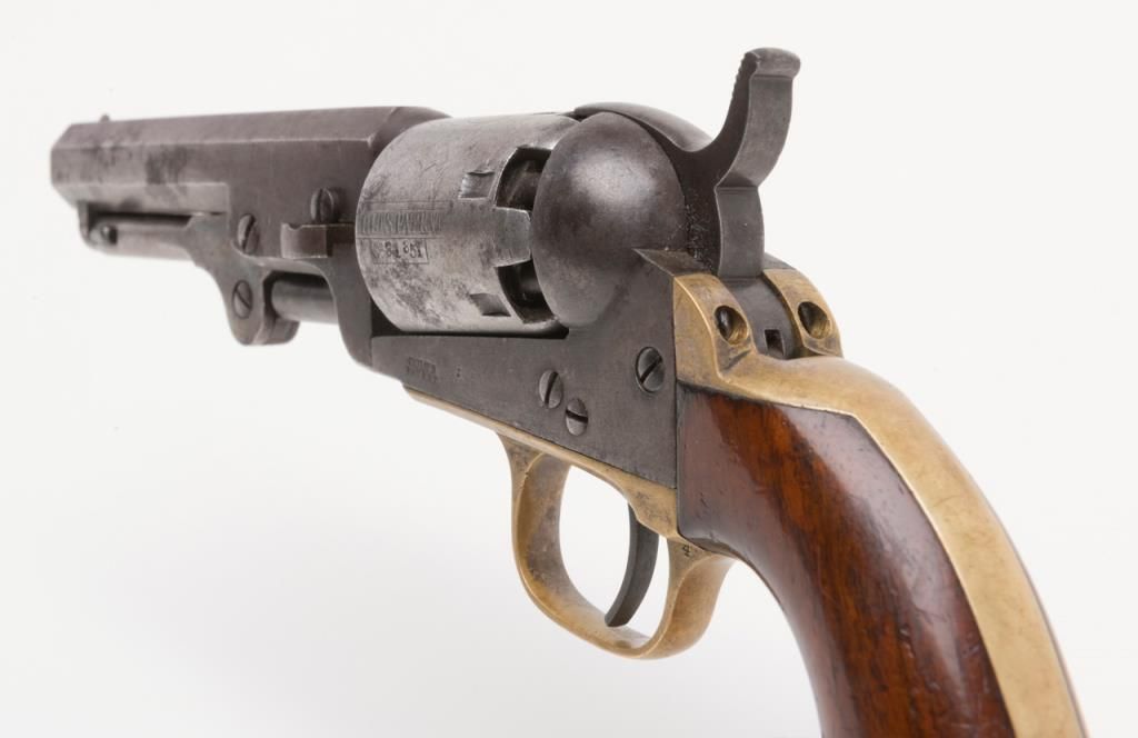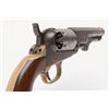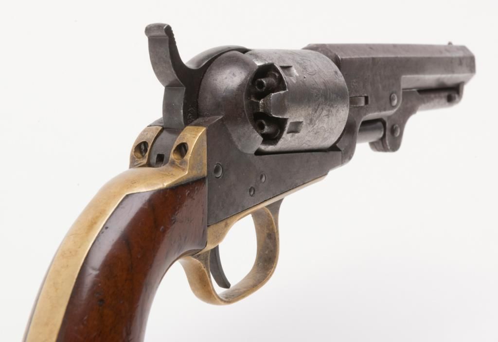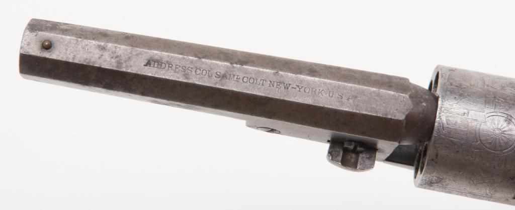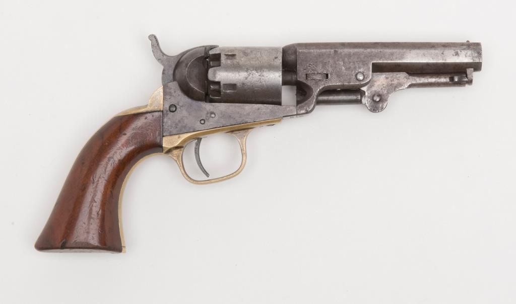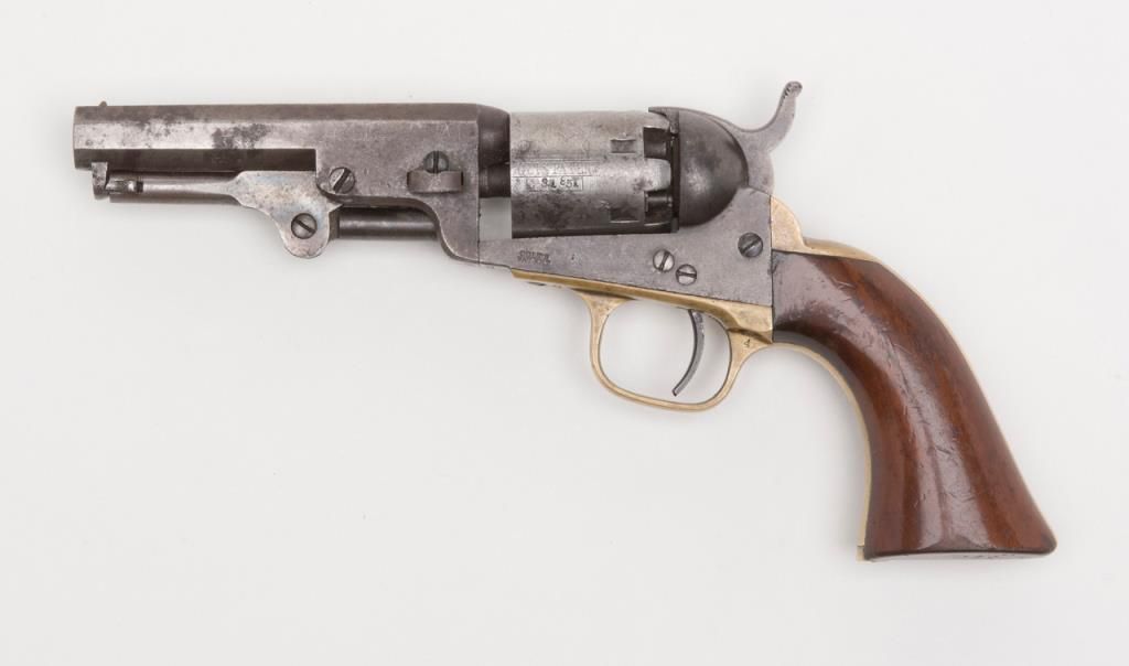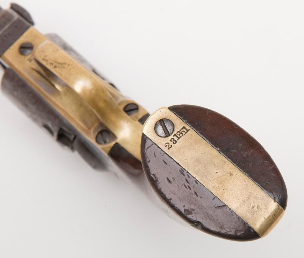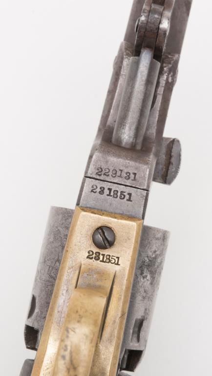Colt Model 1849 Pocket Model percussion revolver, .31 cal., 4” octagon barrel, blue and case hardened finish, wood grips, #231851 in overall very good condition showing all matching visible numbers except loading lever that is un-numbered;brown and grey patina on metal surfaces of barrel and cylinder with several areas of erosion; considerable original cylinder scene remaining, also considerable visible original case colors on frame, hammer and loading lever; good action andmarkings, fair to good bore, very good + grips with majority of original finish remaining; brass straps show pleasing patina. From the estate of Joe Kiser. (Antique). Est.: $700-$1,400.