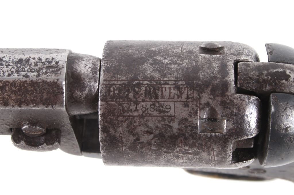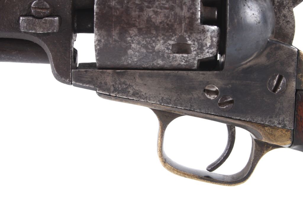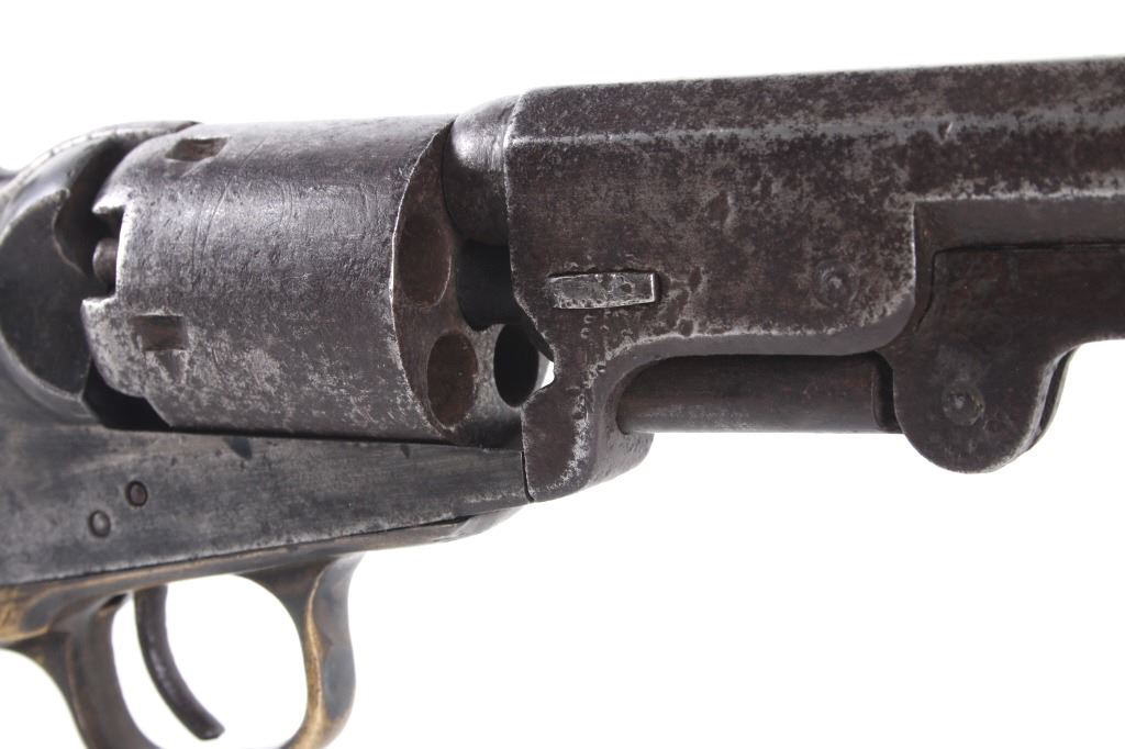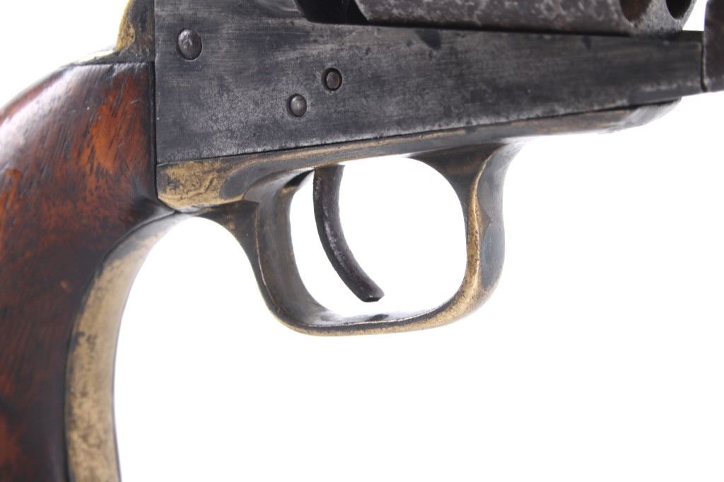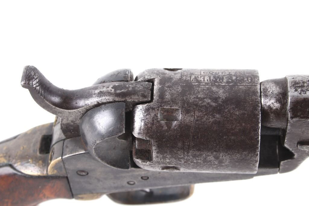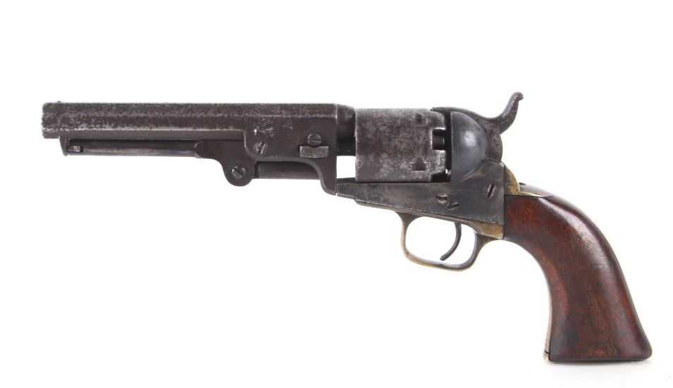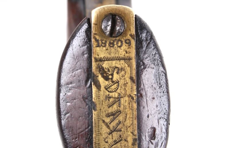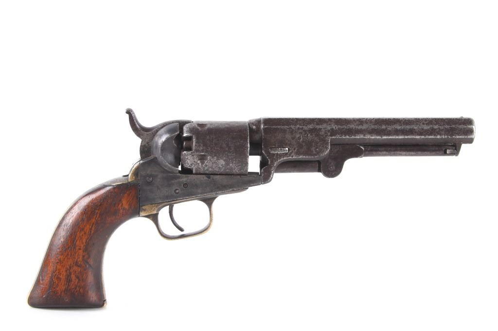 Featured in this lot we have a Colt model 1849 pocket percussion cap revolver chambered in .31 caliber. This is a fine, original example .31 caliber, five-shot revolver that found favor with officers and enlisted men as personal weapons during the Indian Wars of the period. Many of these also saw service in the gold fields of California, the settling West, and in about all urban areas during this very turbulent time of Post-Civil War Reconstruction. The 1849 was one of Colt’s most popular designs that was large enough for aimed fire, but small enough to conceal in a waste band or unobtrusive holster. They also found favor with gamblers and “ladies of the evening.” The original barrel markings have faded and barely visible along with a faded “COLT’S PATENT” on the left side of the frame. Fine walnut grips show only normal light wear. This example also shows a mellow, uncleaned brass back strap and trigger guard. The pistol shows a dark patina and pitting across the exterior due to age and use. Serial Number: 18809. This firearm qualifies as an Antique, and does not require FFL Transfer or NICS Background Check.