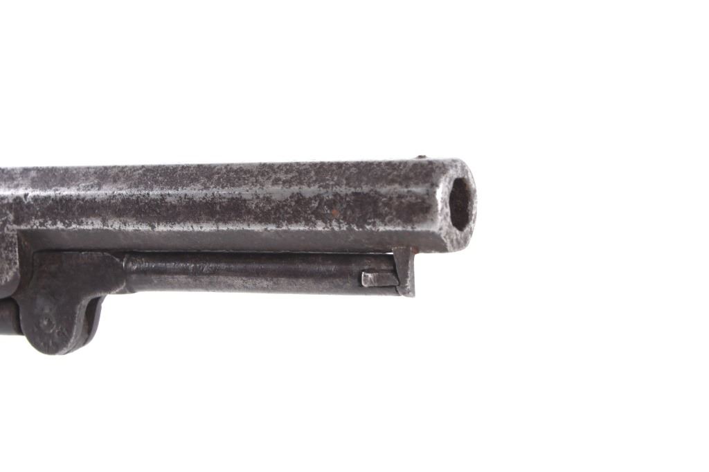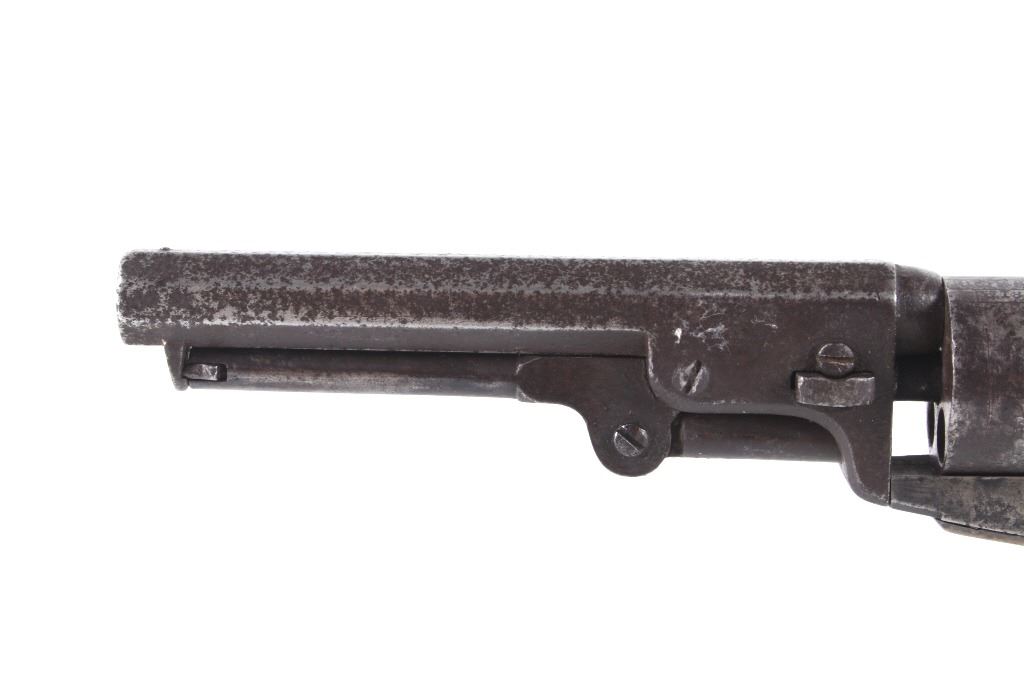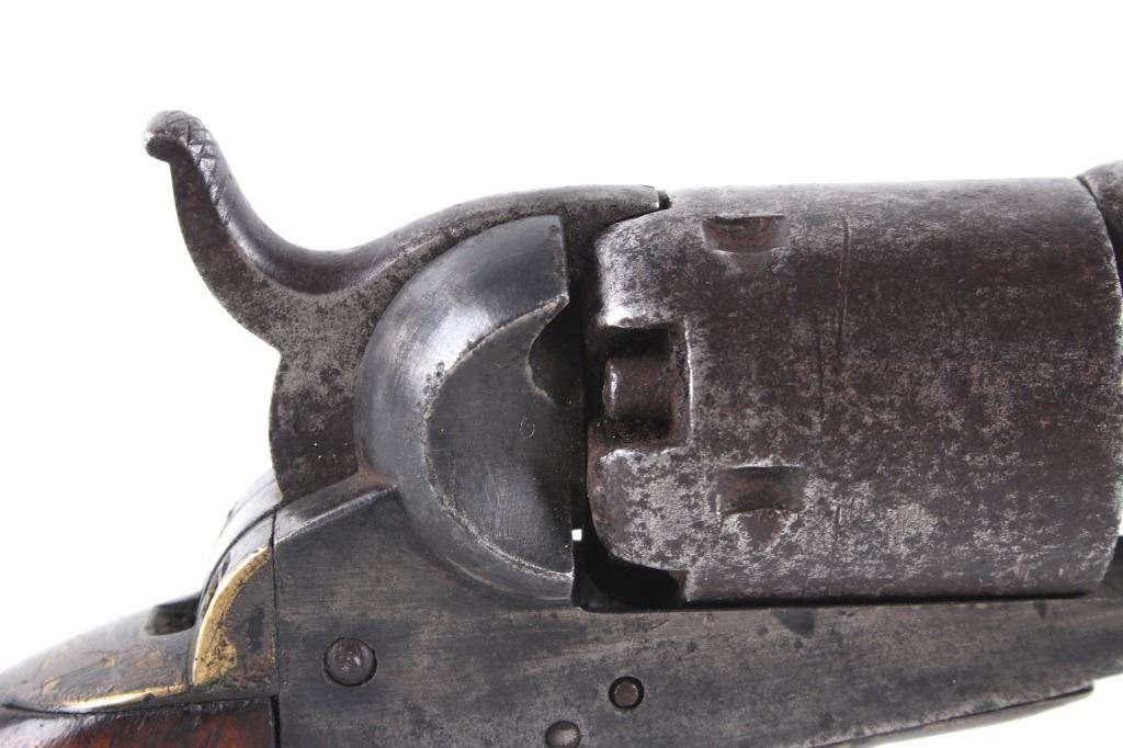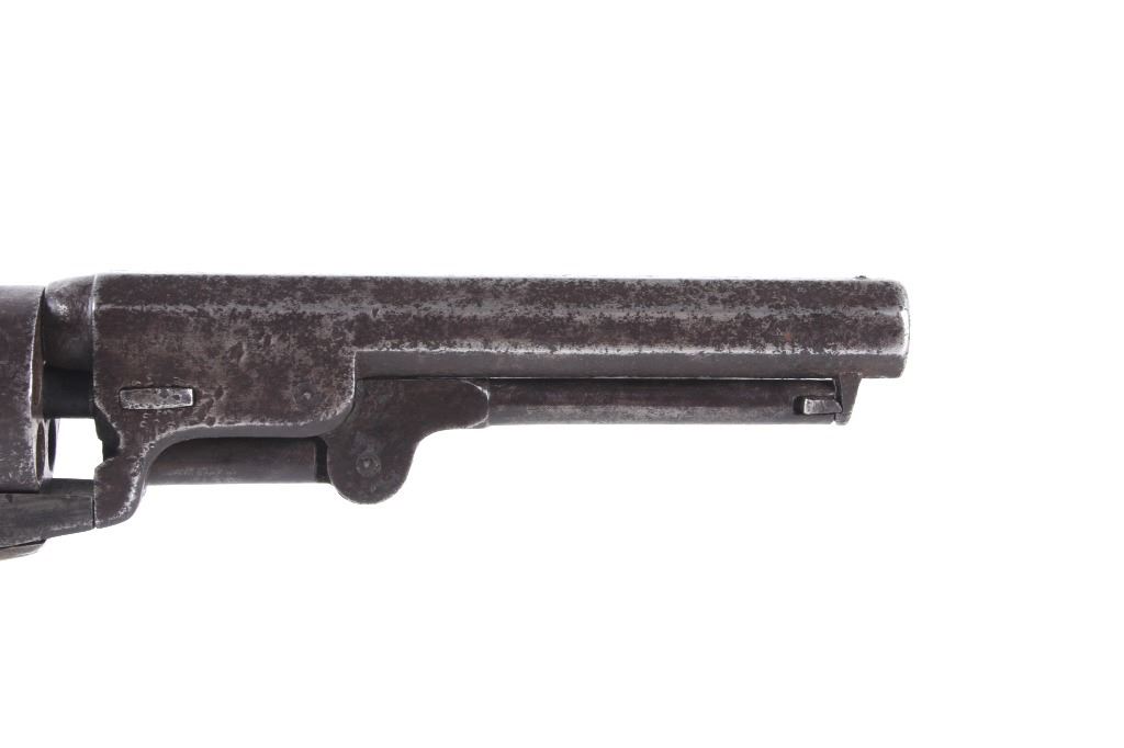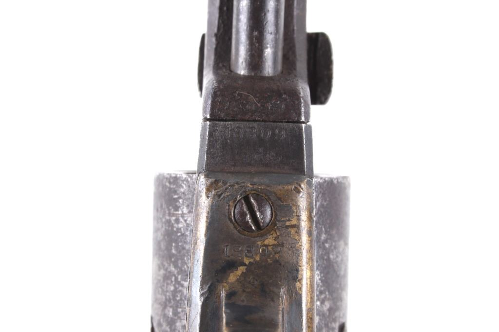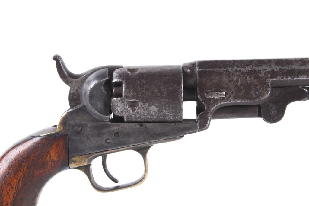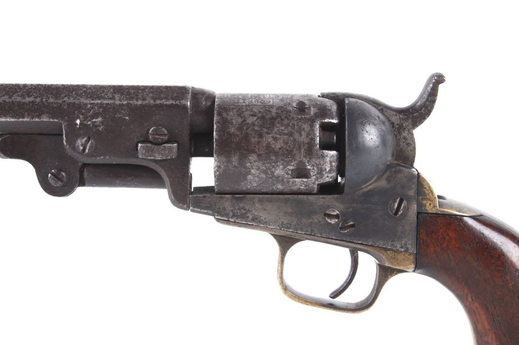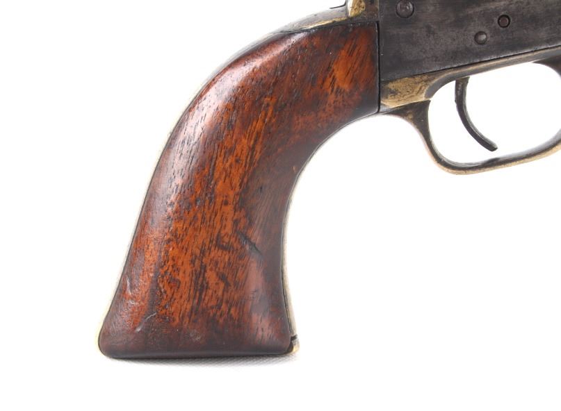 Featured in this lot we have a Colt model 1849 pocket percussion cap revolver chambered in .31 caliber. This is a fine, original example .31 caliber, five-shot revolver that found favor with officers and enlisted men as personal weapons during the Indian Wars of the period. Many of these also saw service in the gold fields of California, the settling West, and in about all urban areas during this very turbulent time of Post-Civil War Reconstruction. The 1849 was one of Colt’s most popular designs that was large enough for aimed fire, but small enough to conceal in a waste band or unobtrusive holster. They also found favor with gamblers and “ladies of the evening.” The original barrel markings have faded and barely visible along with a faded “COLT’S PATENT” on the left side of the frame. Fine walnut grips show only normal light wear. This example also shows a mellow, uncleaned brass back strap and trigger guard. The pistol shows a dark patina and pitting across the exterior due to age and use. Serial Number: 18809. This firearm qualifies as an Antique, and does not require FFL Transfer or NICS Background Check.