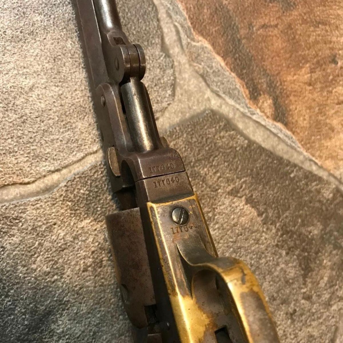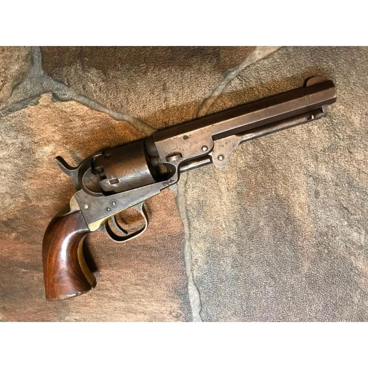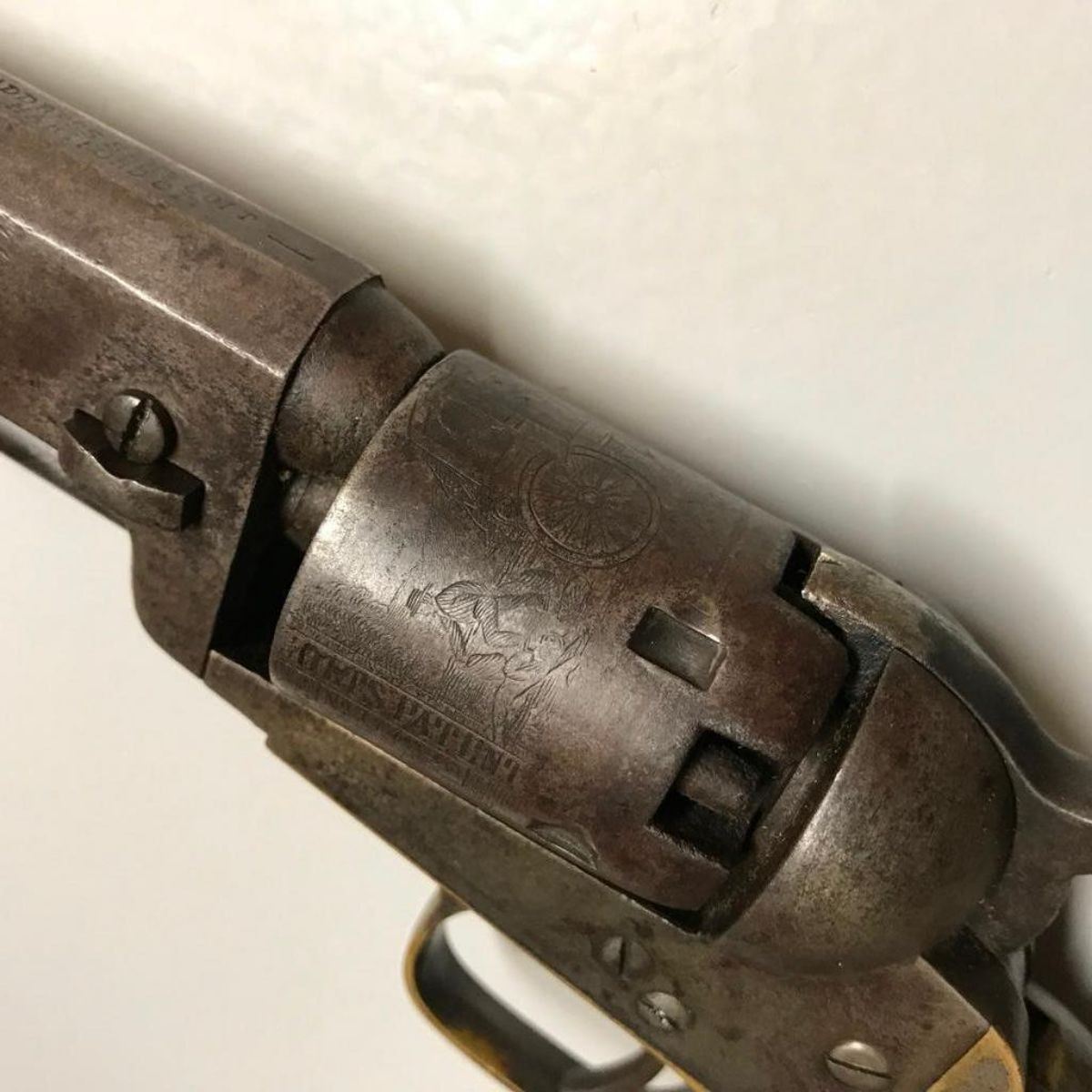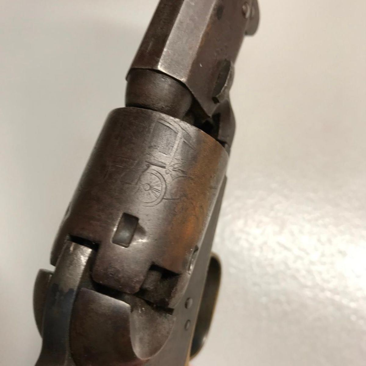 Colt Model 1849 Pocket Percussion Revolver. Serial #177640, .31 cal, 5" barrel professionally shortened during the period of use, with an oxidized bore. The metal surfaces are an overall dull pewter gunmetal gray with an overall smattering of plum, some very lightly scattered oxidation, a few light pits and some minor impact marks near the wedge. The two-line barrel address is evident as is the entire cylinder scene. The loading lever actually shows some nice smoky gray color case-hardening with a bit on the right side of the frame. The trigger guard retains strong trace silver plate, perhaps 30%, the back-strap with a bit less, perhaps 15%. There has been a nice half-moon iron sight fitted at the time of the barrel work. The one piece walnut grip rates otherwise very good, missing a 1/4' chip on its rear right edge. It shows very good original varnish which is only wearing slightly and fits perfectly and is doubtless original to the gun. The gun seems to function loosely mechanically with quite a bit of end shake in the cylinder, all the numbers however are matching including the wedge. Etched on the cylinder, a signature Colt scene, version of a stagecoach holdup, portraying revolver-armed passengers dispatching highwaymen. ** these scenes were added for the sake of decoration & customer appeal, but also as tributes to people & events of historical significance.Â