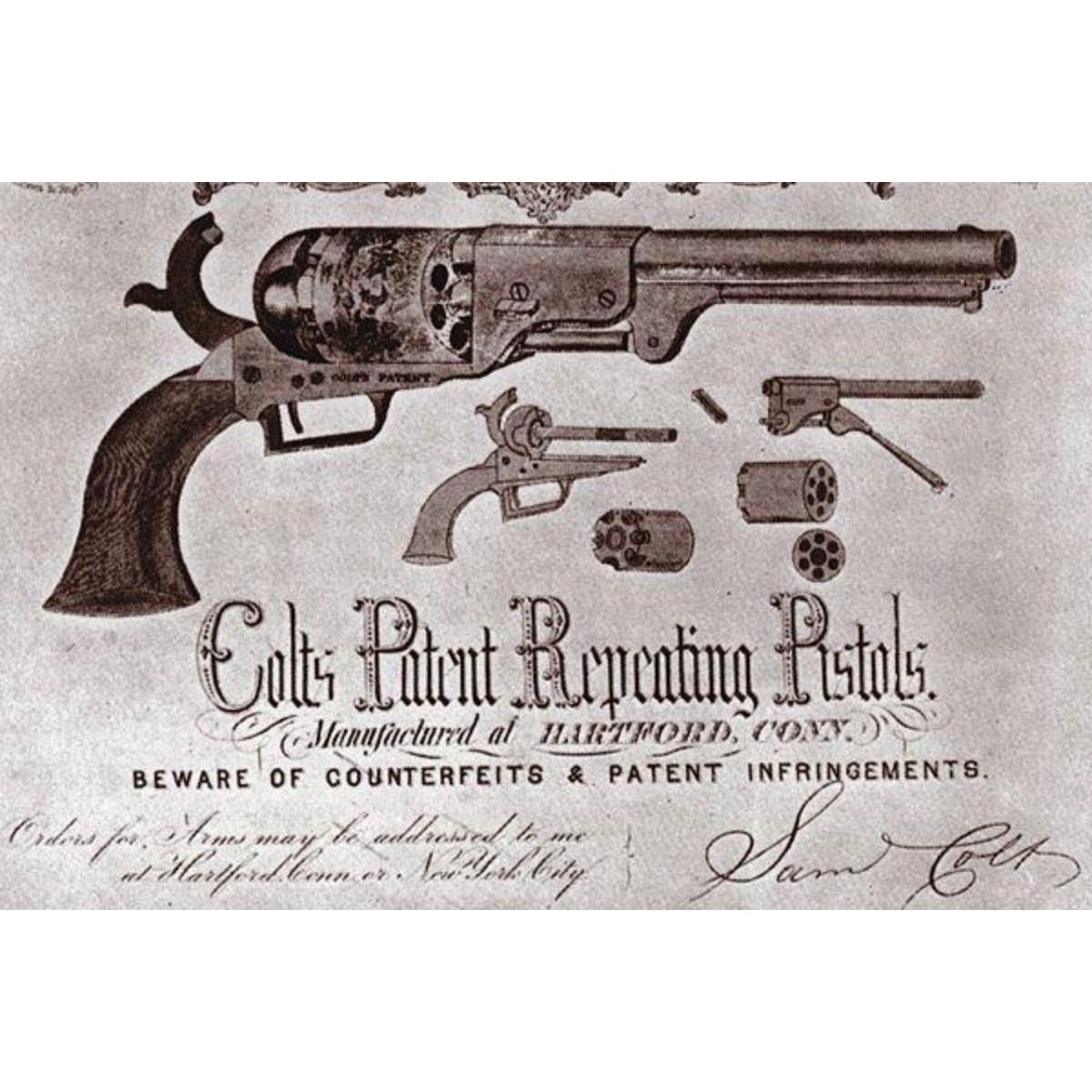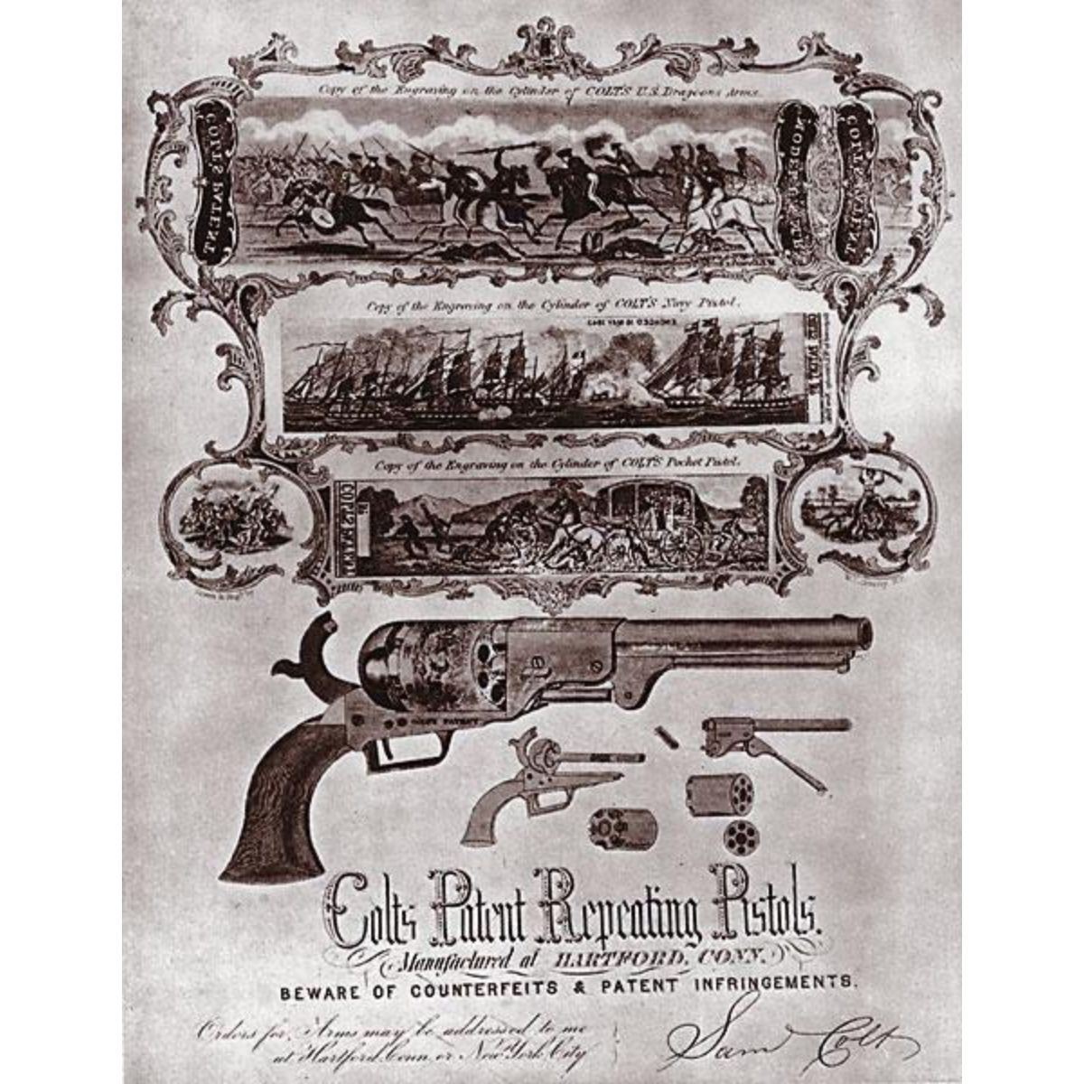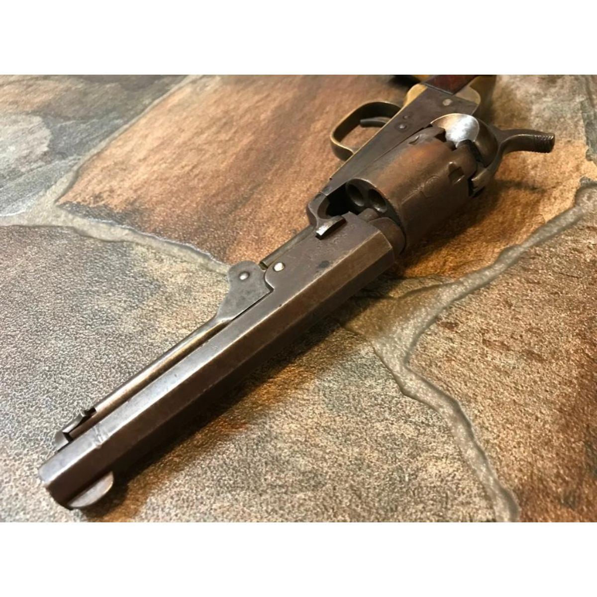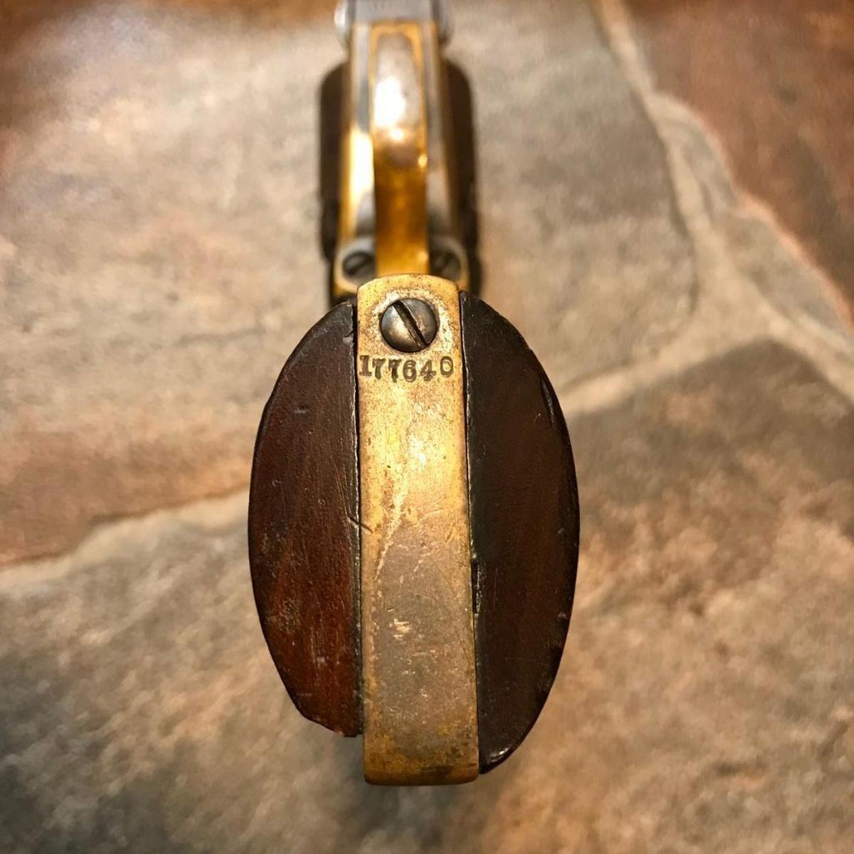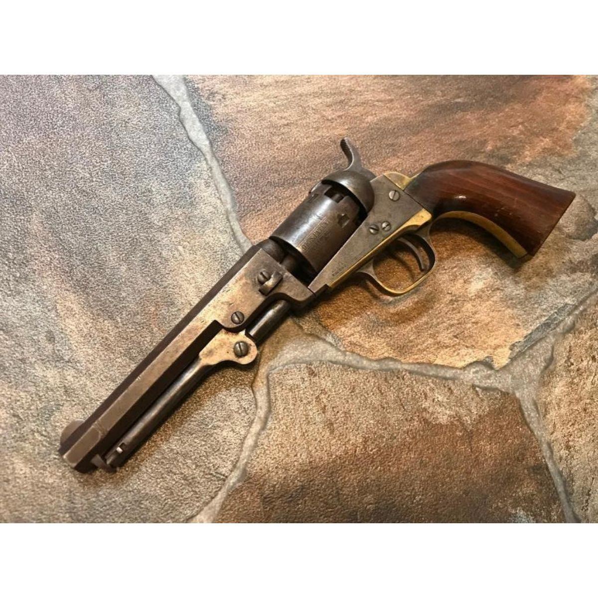 Colt Model 1849 Pocket Percussion Revolver. Serial #177640, .31 cal, 5" barrel professionally shortened during the period of use, with an oxidized bore. The metal surfaces are an overall dull pewter gunmetal gray with an overall smattering of plum, some very lightly scattered oxidation, a few light pits and some minor impact marks near the wedge. The two-line barrel address is evident as is the entire cylinder scene. The loading lever actually shows some nice smoky gray color case-hardening with a bit on the right side of the frame. The trigger guard retains strong trace silver plate, perhaps 30%, the back-strap with a bit less, perhaps 15%. There has been a nice half-moon iron sight fitted at the time of the barrel work. The one piece walnut grip rates otherwise very good, missing a 1/4' chip on its rear right edge. It shows very good original varnish which is only wearing slightly and fits perfectly and is doubtless original to the gun. The gun seems to function loosely mechanically with quite a bit of end shake in the cylinder, all the numbers however are matching including the wedge. Etched on the cylinder, a signature Colt scene, version of a stagecoach holdup, portraying revolver-armed passengers dispatching highwaymen. ** these scenes were added for the sake of decoration & customer appeal, but also as tributes to people & events of historical significance.Â
