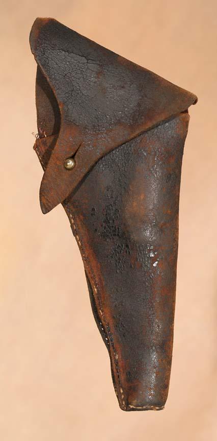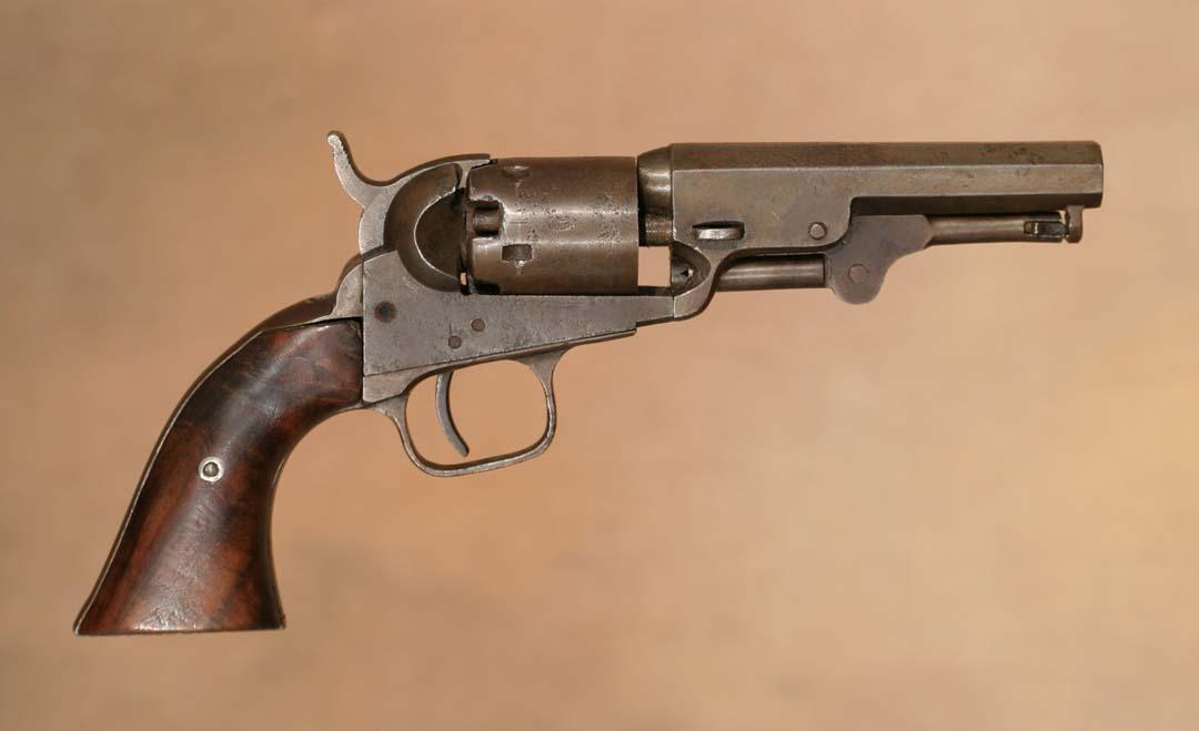 Colt Model 1849 Pocket Pistol With Original Holster. 3 ¾" barrel, 9" overall.36 calibre, serial #185852. Circa 1850s. (est $1,200-1,500). For condition reports please visit: www.auctioninsantafe.com/cr2011.pdf