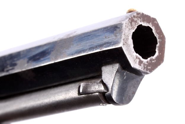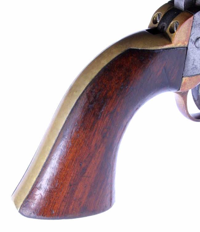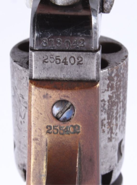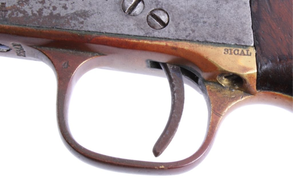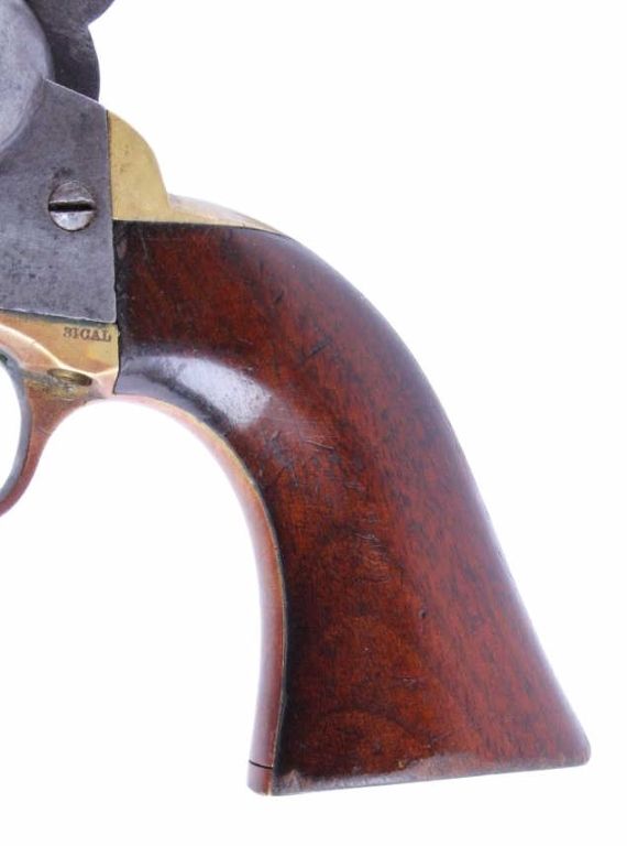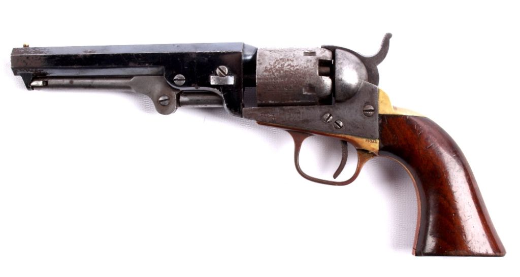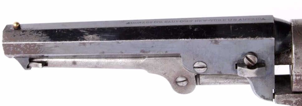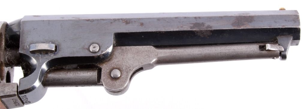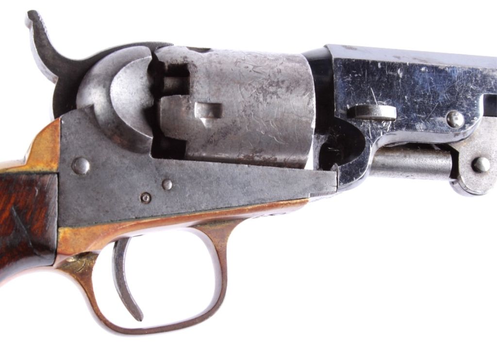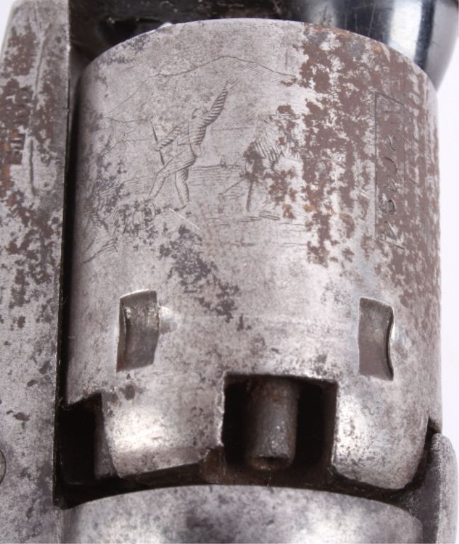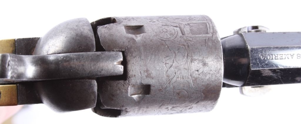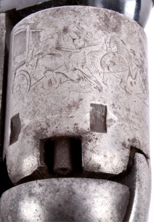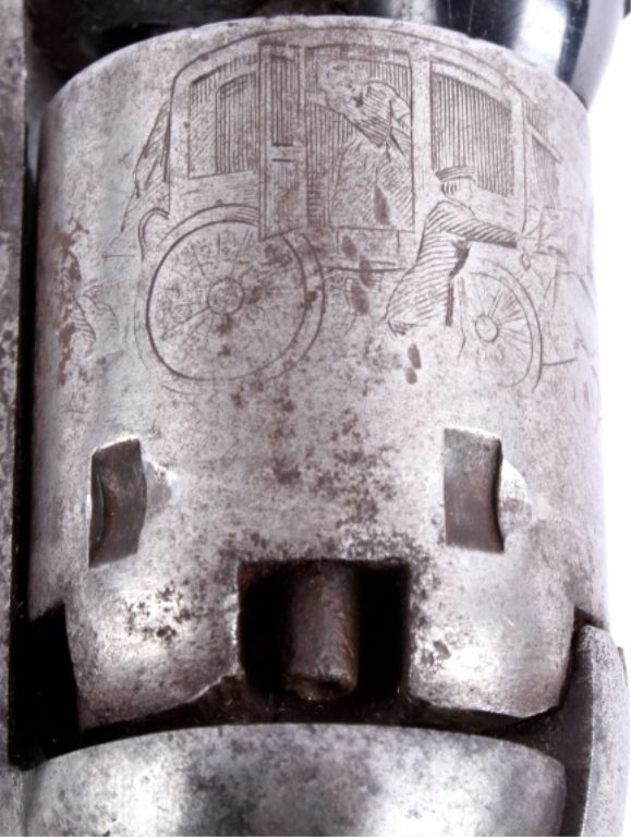 This is an original Colt Model 1849 Pocket Percussion Revolver in a .31 caliber. This shows all matching numbers and was manufactured in 1864 during the Civil War. The barrel was replaced in 1869. The revolverwas most likely carried through the entirety of the Civil War and then brought to Montana.This shows 70% of the bluing across the barrel, good condition wood and brass, and overall good condition cylinder. Thisrare revolver has a hand etched scene across the entire cylinder showing a stage coach.
