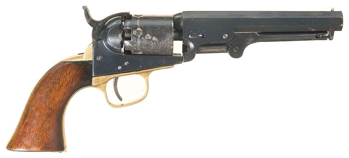 Manufactured in 1863. Standard markings and features. All numbers match including partial serial numbers on the arbor pin, wedge and loading lever. Some pitting on the cylinder and barrel.