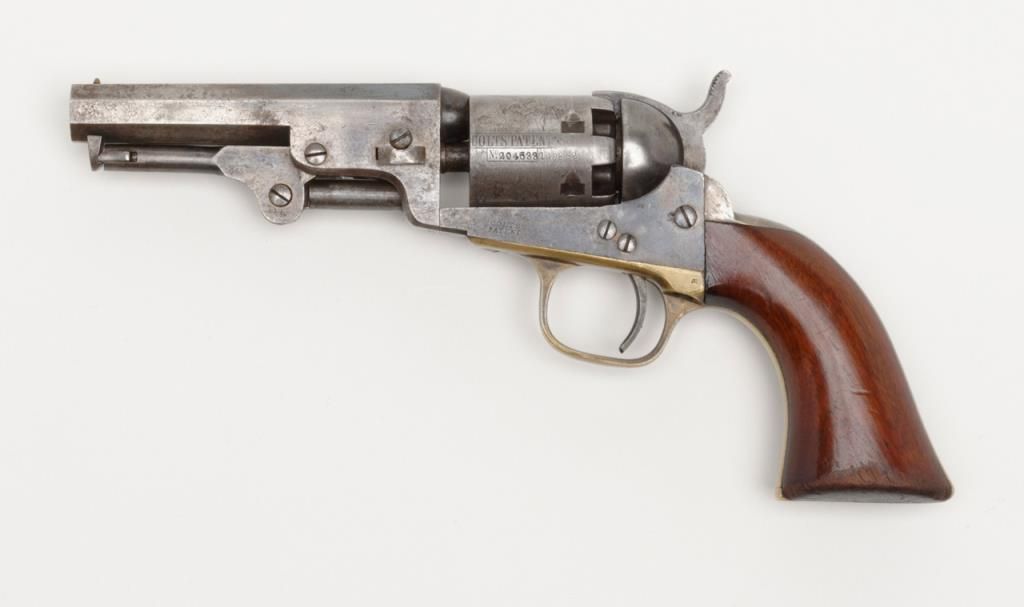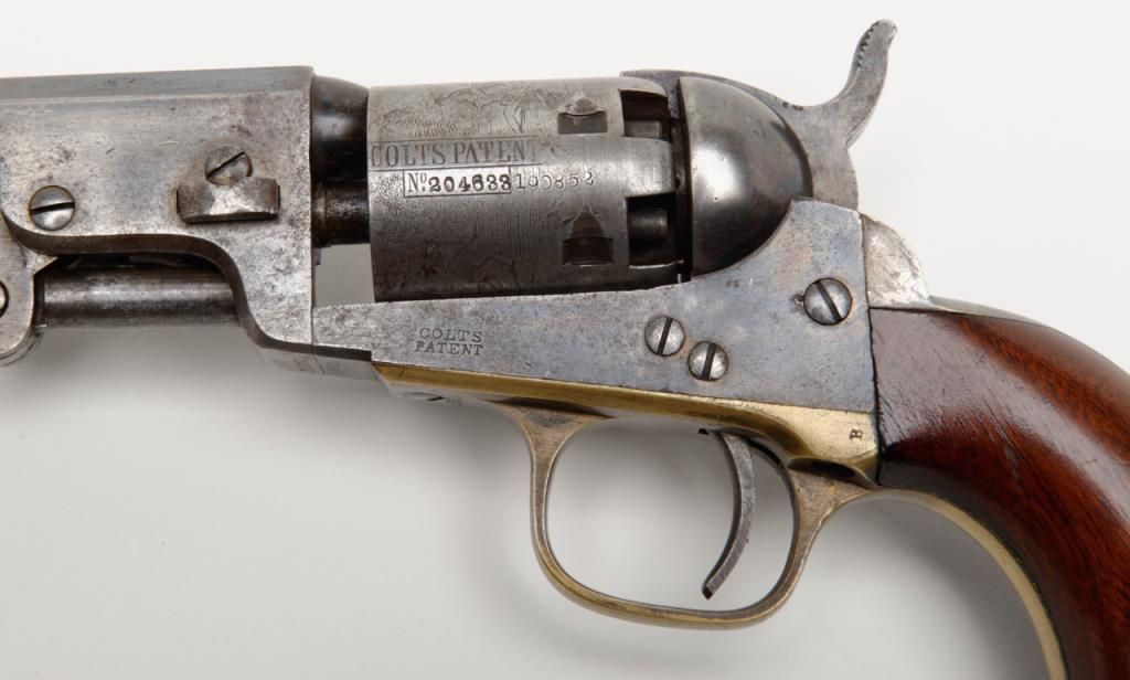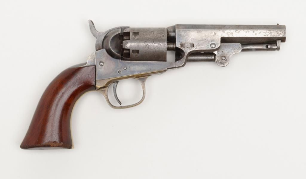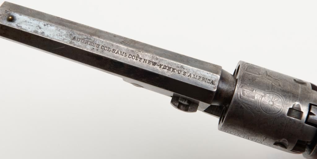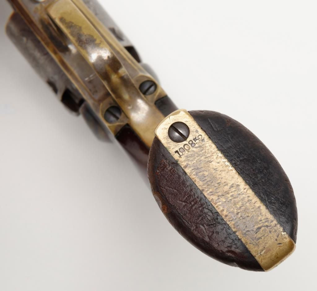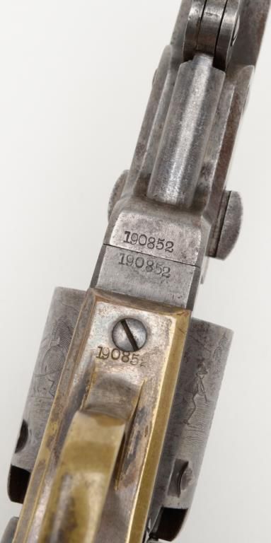Colt Model 1849 Pocket percussion revolver, .31 cal., 4” octagon barrel, blue and case hardened finish, wood grips, #190852 in overall very good + condition showing areas of original blue on the top flats of the barrel, considerable originalcase colors on the frame, rammer and hammer, some original silver wash on the brass trigger guard and backstrap, all matching visible serial numbers including the wedge (although interestingly, the cylinder shows #204633 and then is followed by190852 in what appears to be period factory stamping), cylinder displays majority of original stagecoach hold-up roll die scene; bore is good, action crisp, markings sharp and grips are very good +. (Antique). Est.: $1,000-$2,000