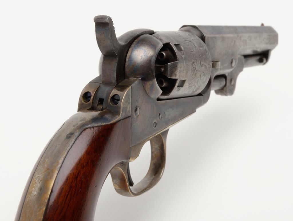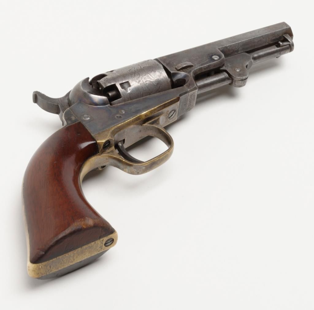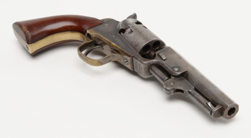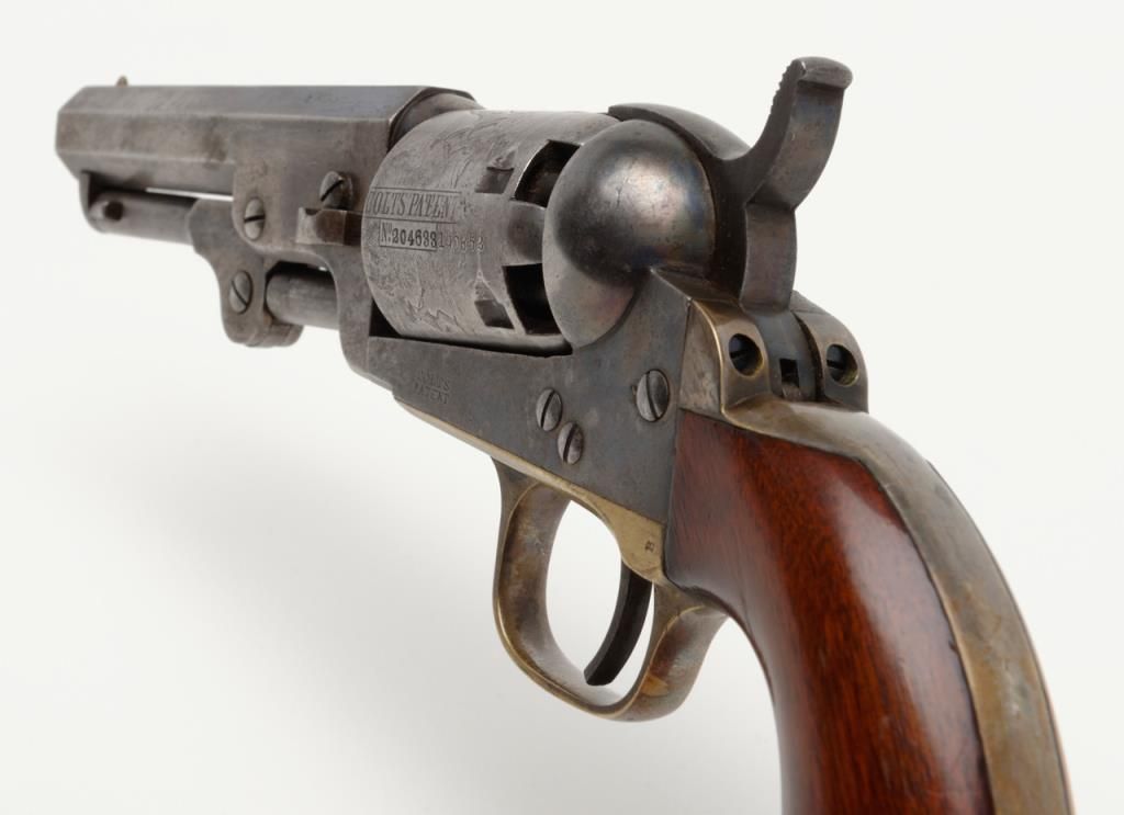 Colt Model 1849 Pocket percussion revolver, .31 cal., 4” octagon barrel, blue and case hardened finish, wood grips, #190852 in overall very good + condition showing areas of original blue on the top flats of the barrel, considerable originalcase colors on the frame, rammer and hammer, some original silver wash on the brass trigger guard and backstrap, all matching visible serial numbers including the wedge (although interestingly, the cylinder shows #204633 and then is followed by190852 in what appears to be period factory stamping), cylinder displays majority of original stagecoach hold-up roll die scene; bore is good, action crisp, markings sharp and grips are very good +. (Antique). Est.: $1,000-$2,000