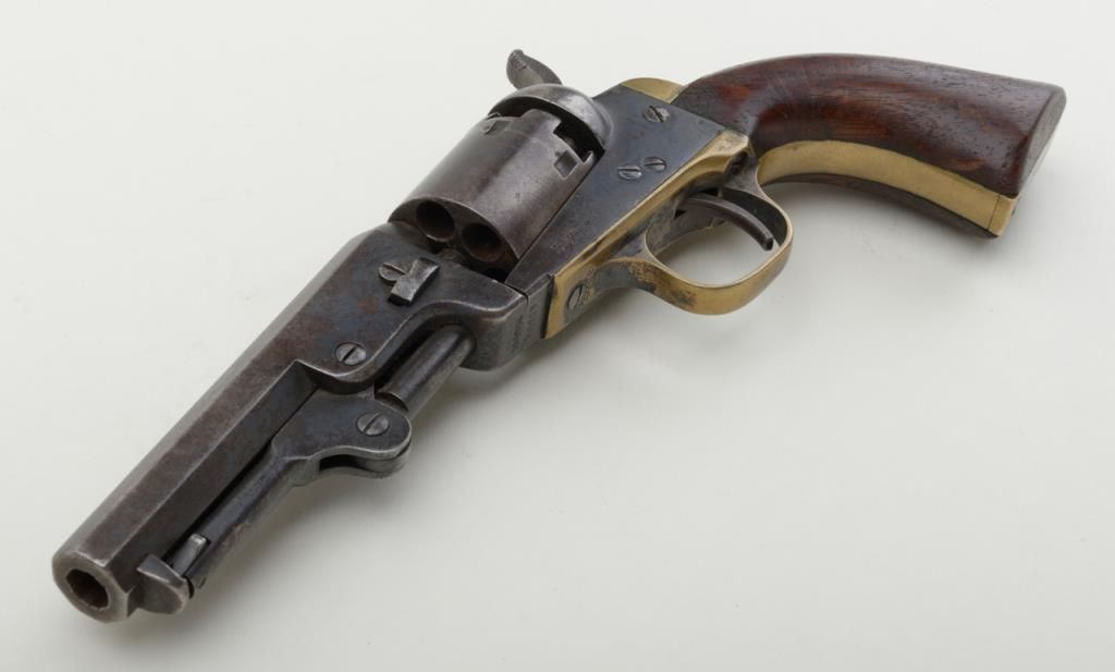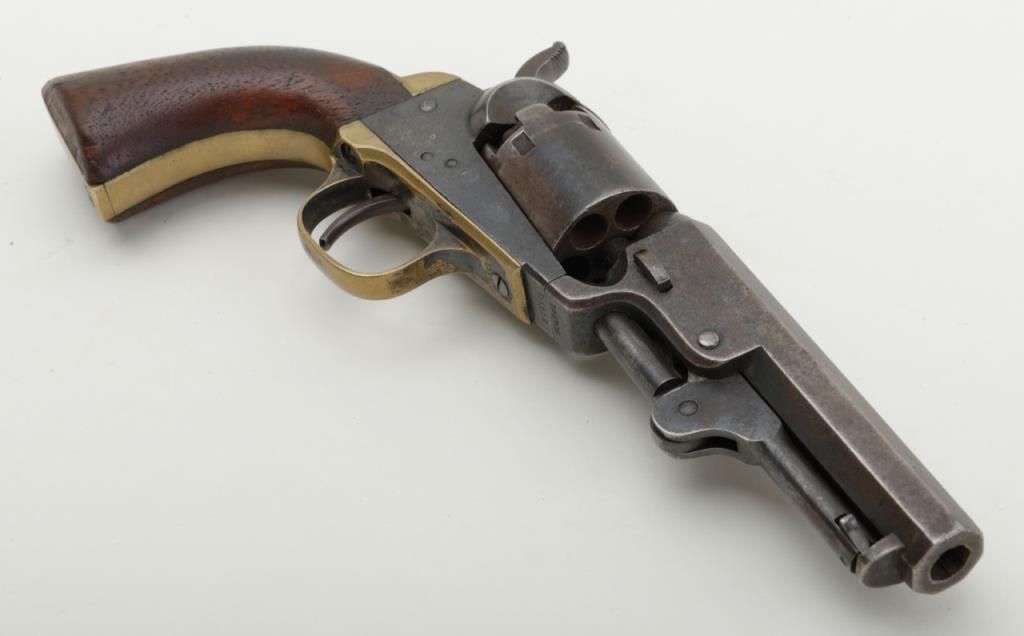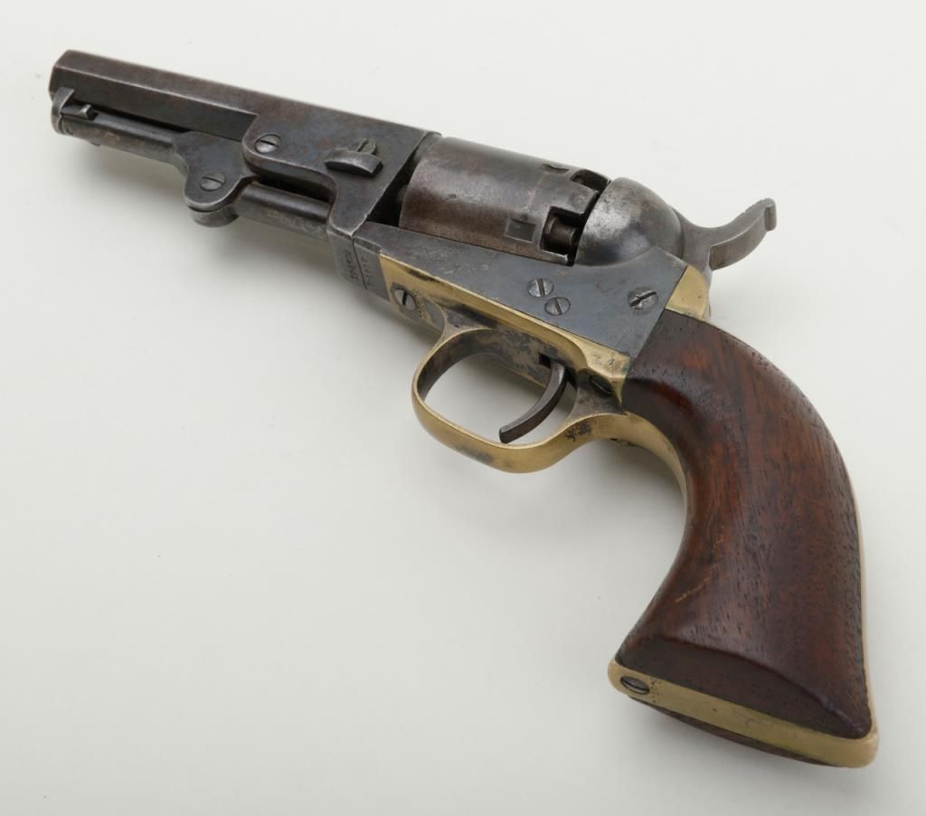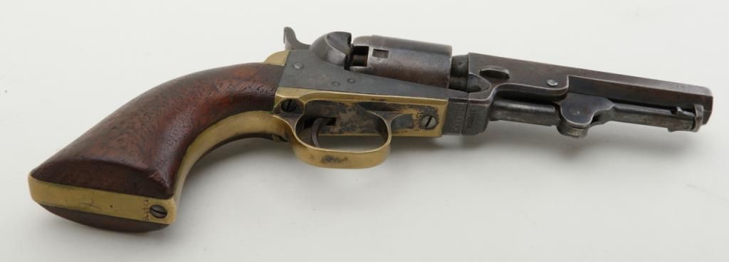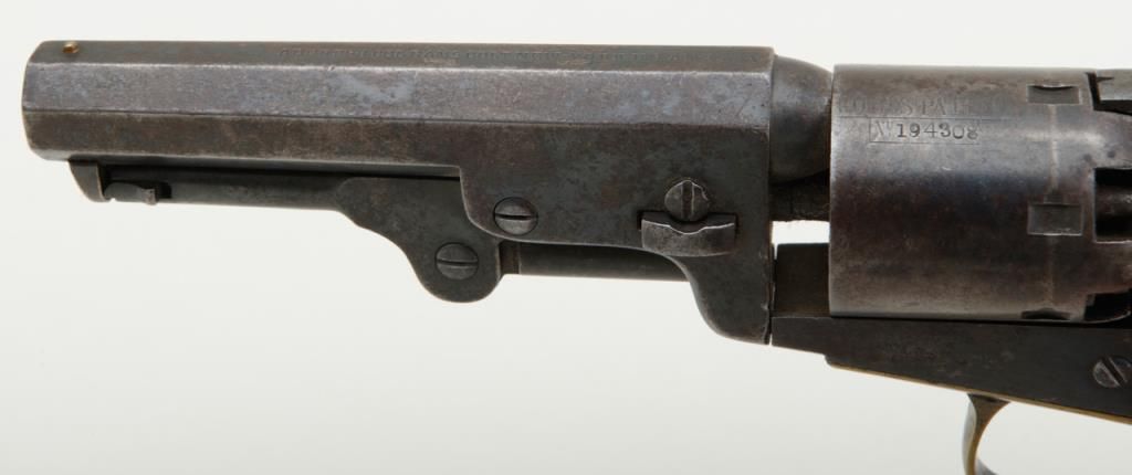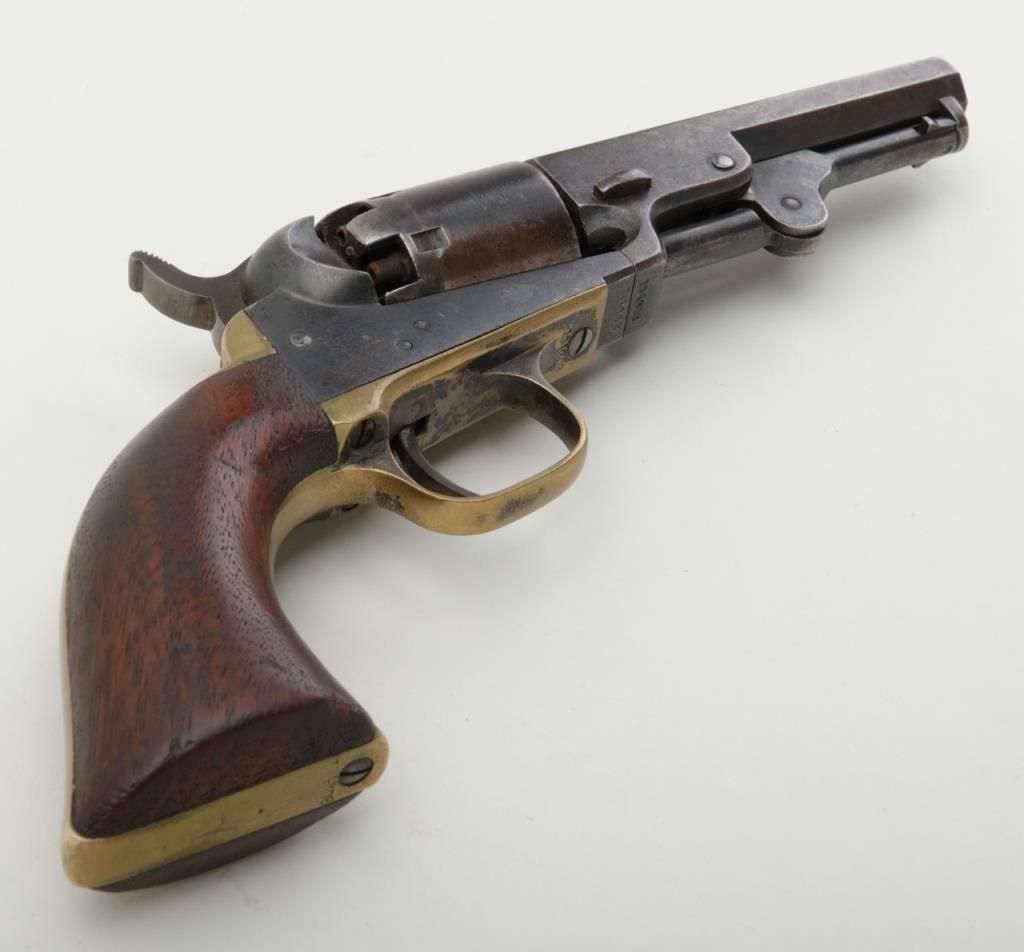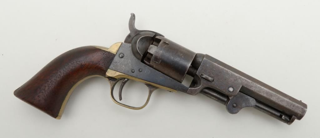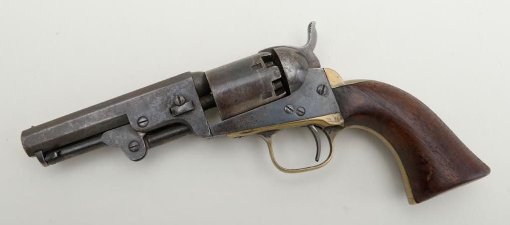 Colt Model 1849 Pocket percussion revolver, .31 cal., 4” octagon barrel, blue and case hardened finish, brass straps, wood grips, #194308 (all matching visible numbers including the wedge). This gun is in overall good condition showing scattered traces of finish mixed with a blue/brown patina; good action, dark bore, good grips with some scattered mars from storage; traces of original tarnished silver wash in the protected areas of the trigger guard. Est.: $400-$800.