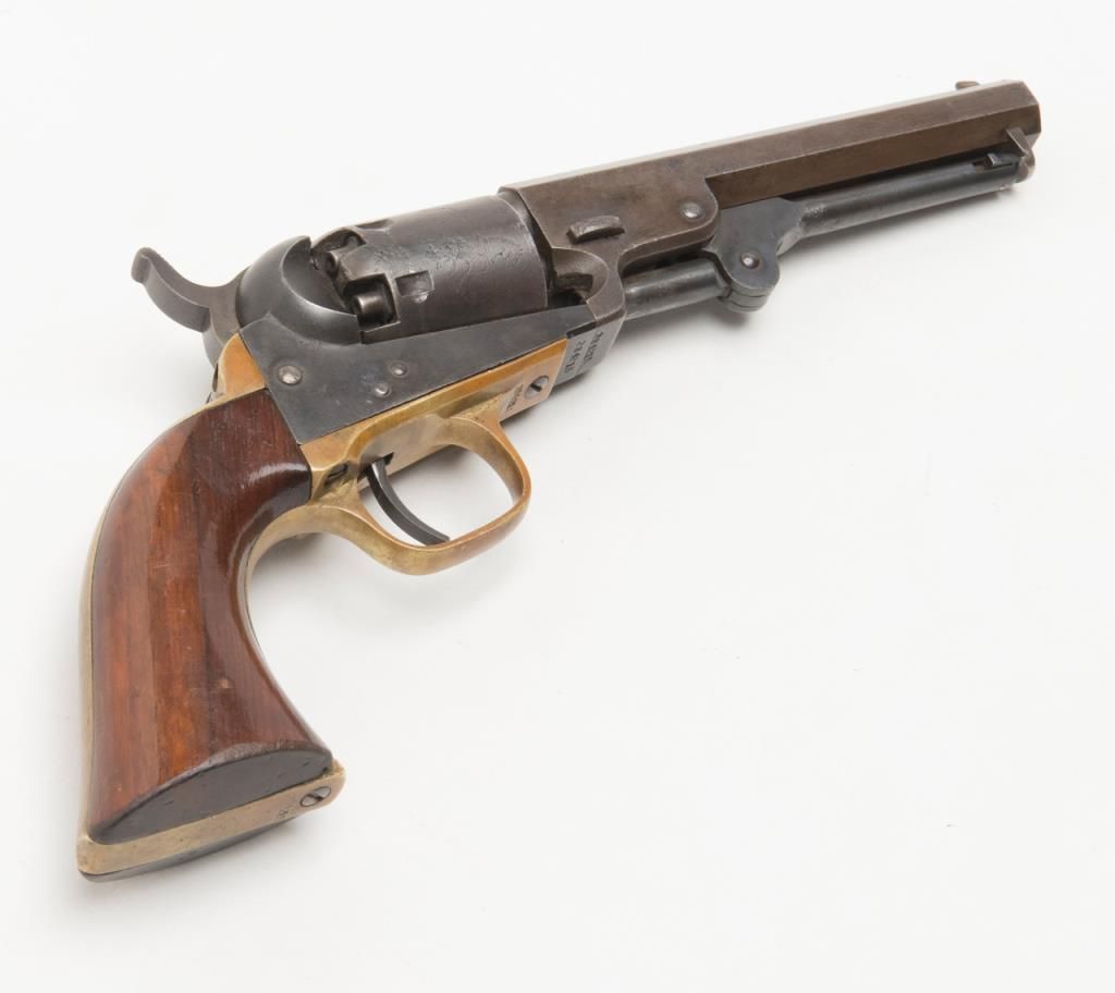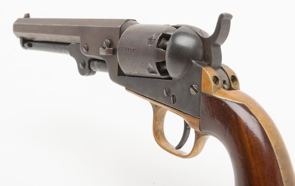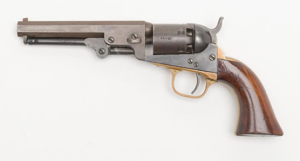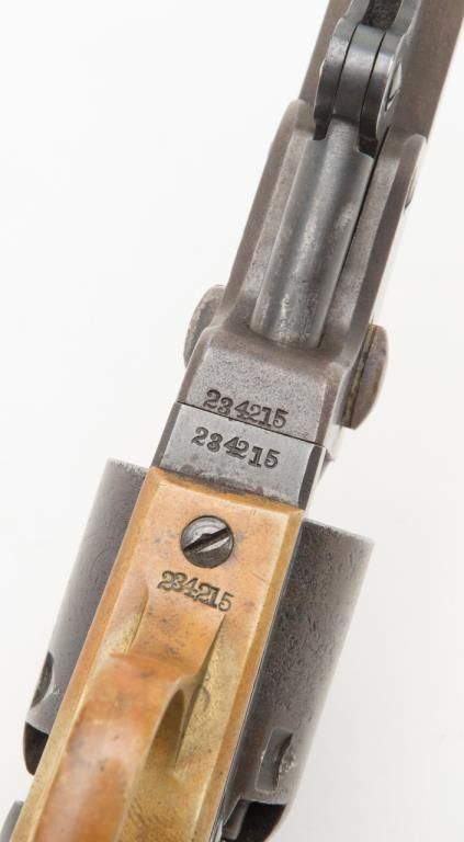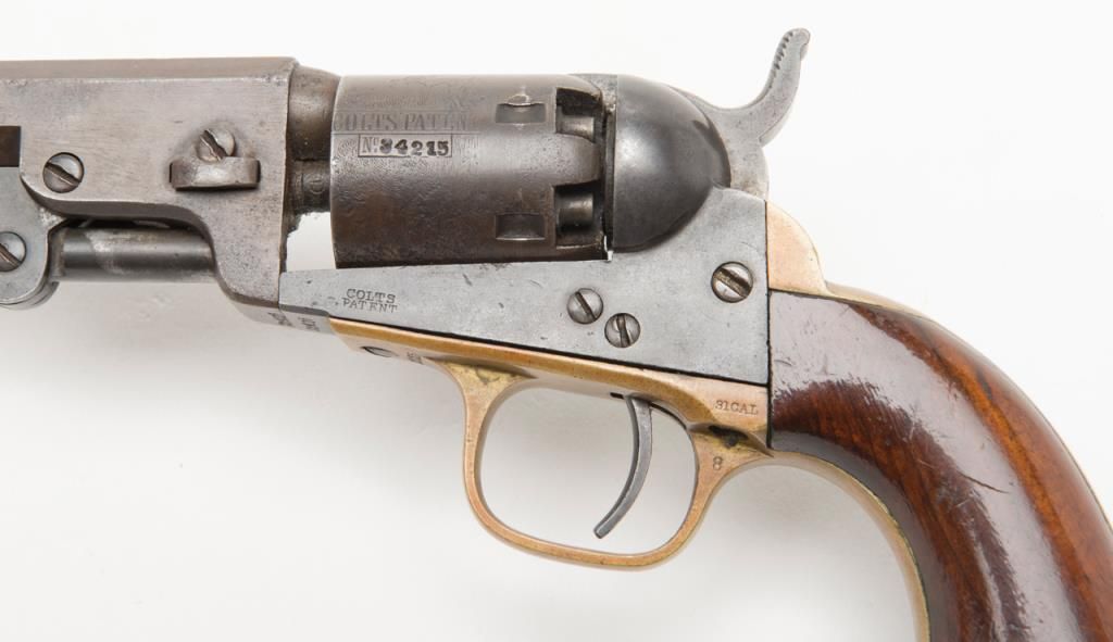 Colt Model 1849 Pocket percussion revolver, .31 cal., 5” octagon barrel, blue and case hardened finish, wood grips, #234215 in overall very good condition showing a blue/brown patina on metal surfaces with some spots of pitting on thecylinder and rammer, crisp action and markings, good bore, matching visible numbers, replaced front sight pin, very good grips; great taffy colored patina to brass trigger guard and backstrap. (Antique). Est.: $500-$1,000.