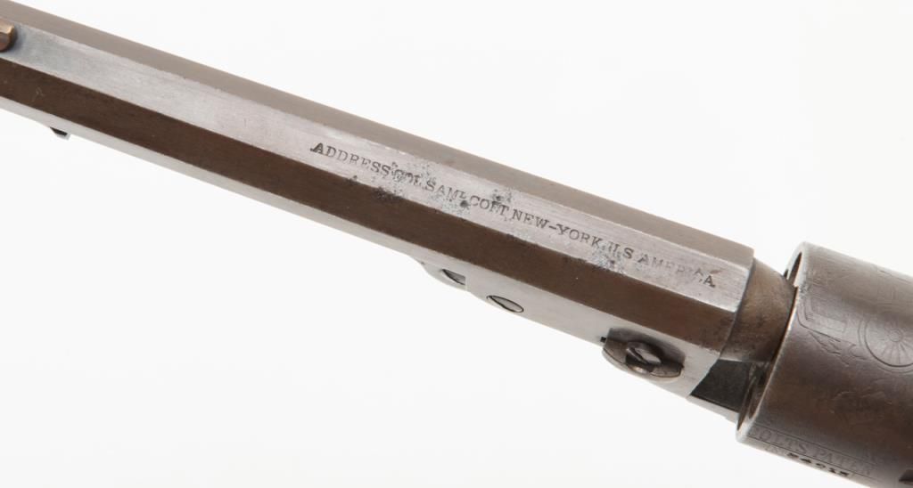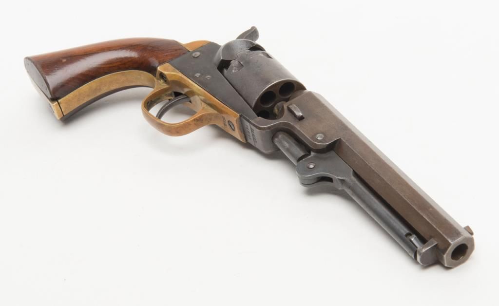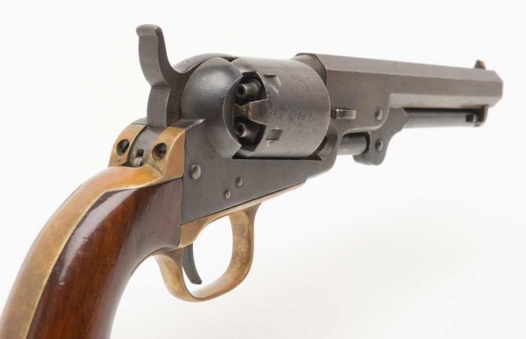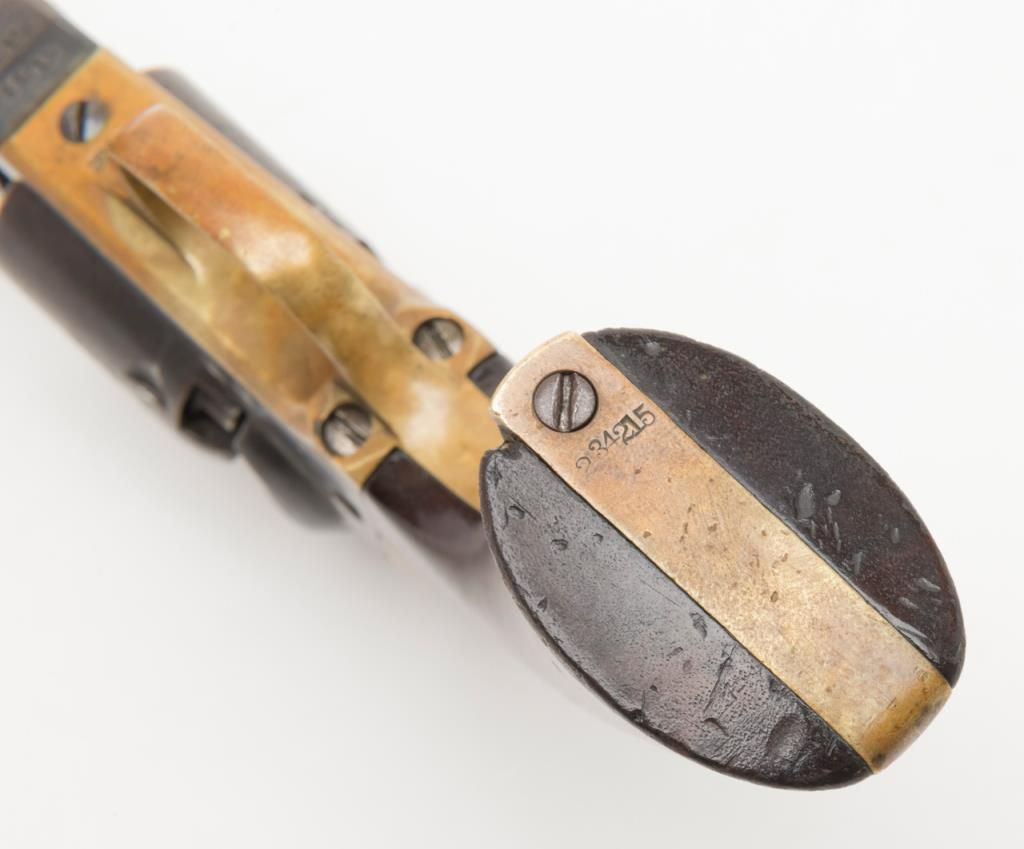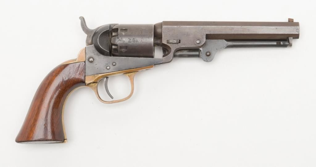 Colt Model 1849 Pocket percussion revolver, .31 cal., 5” octagon barrel, blue and case hardened finish, wood grips, #234215 in overall very good condition showing a blue/brown patina on metal surfaces with some spots of pitting on thecylinder and rammer, crisp action and markings, good bore, matching visible numbers, replaced front sight pin, very good grips; great taffy colored patina to brass trigger guard and backstrap. (Antique). Est.: $500-$1,000.
