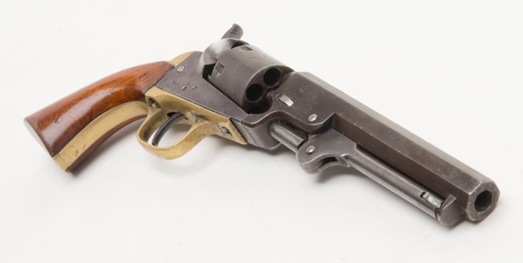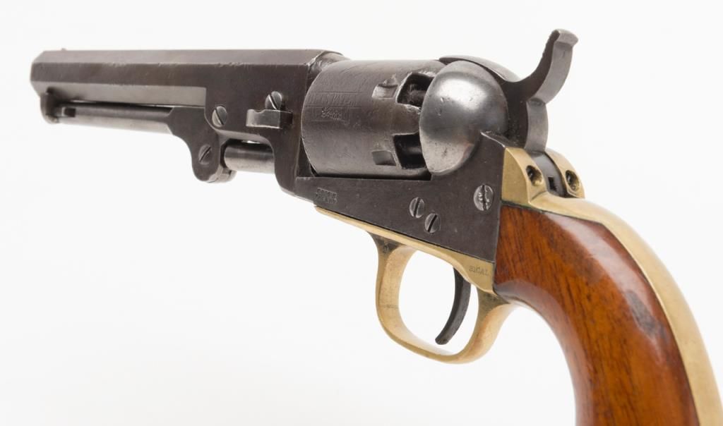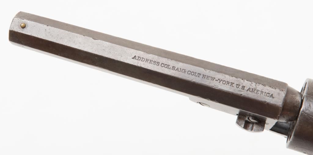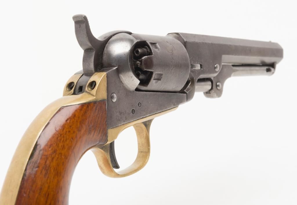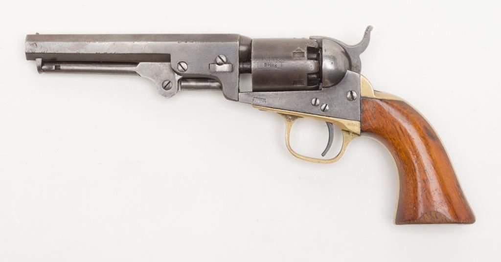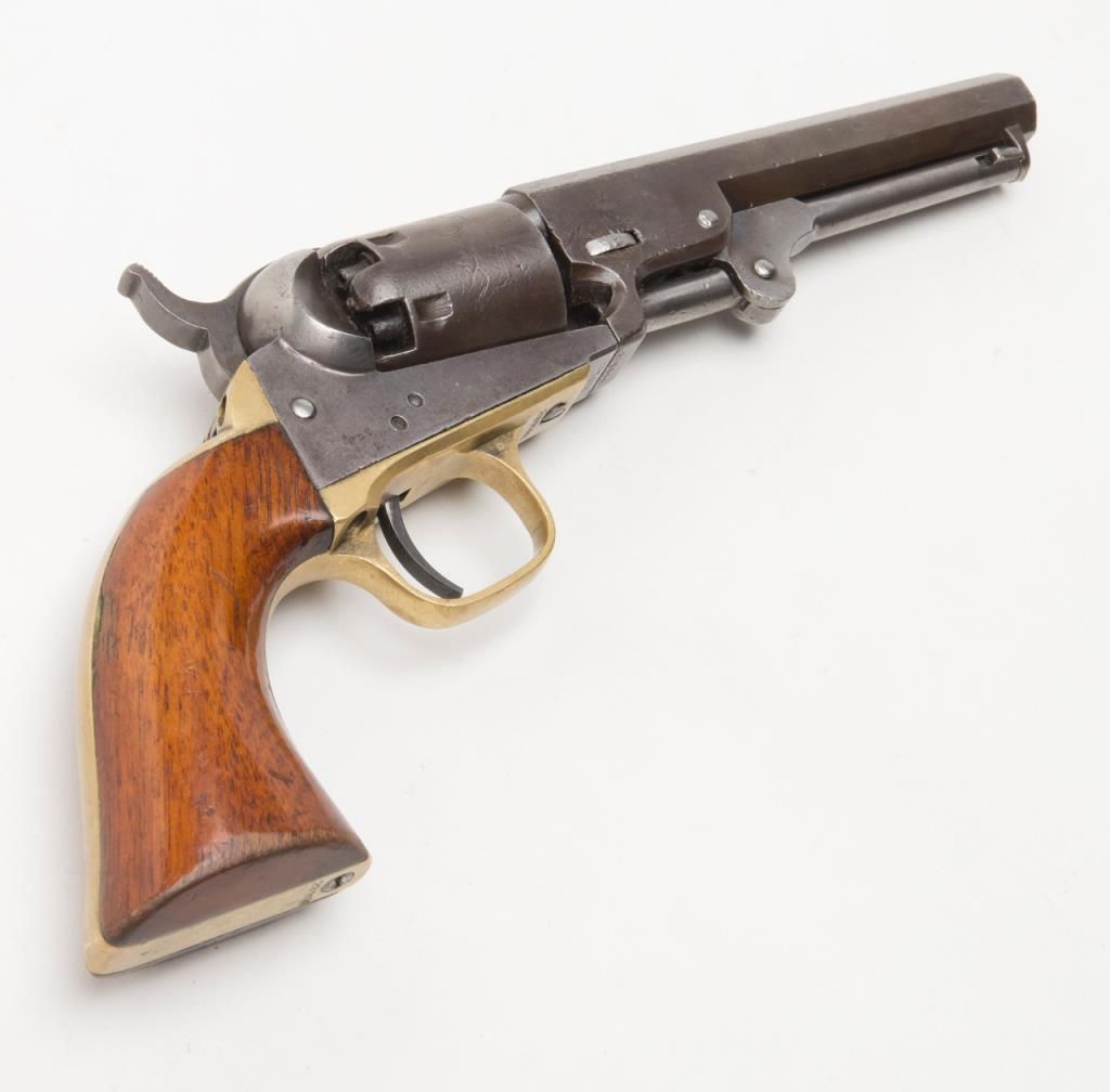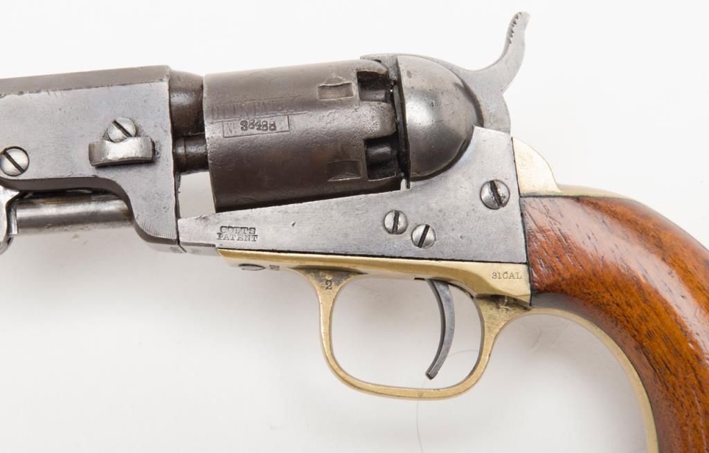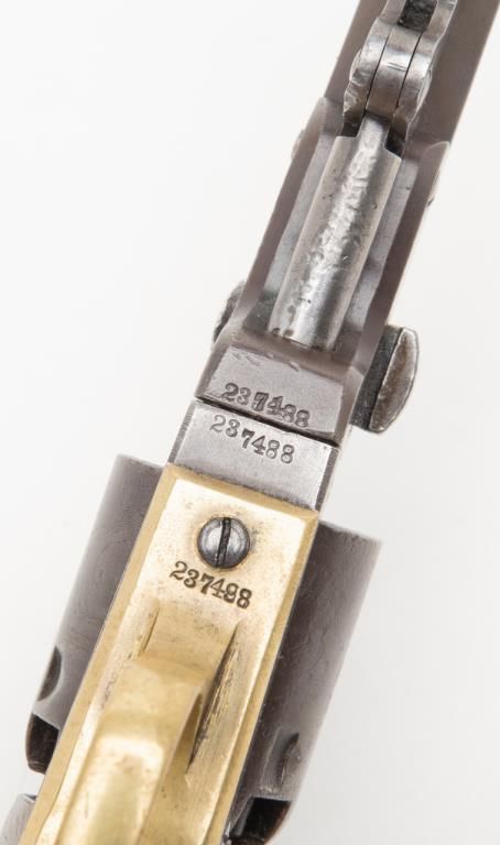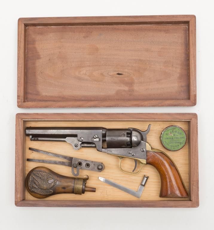 Colt Model 1849 Pocket percussion revolver, .31 cal., 5” octagon barrel, blue & case hardened finish, wood grips, #237488 in overall good + condition showing a dark patina to metal surfaces, cylinder marked 38488, rammer 4870, considerablecylinder scene, action working, traces of original case colors on frame and loading lever, very good grips with considerable original varnish; accompanied by a well-made modern case that has yet to be completed; the base and lid have beenfinely made and finished; a brass eagle flask is included along with a Colt’s Patent iron bullet mold, an F. Joyce cap tin and a reproduction combination nipple wrench/screwdriver. Also included are brass hinges and screws and somemisc. parts for the casing. A project to complete for the collector who is handy at the workbench. (Antique). Est.: $900-$1,800.