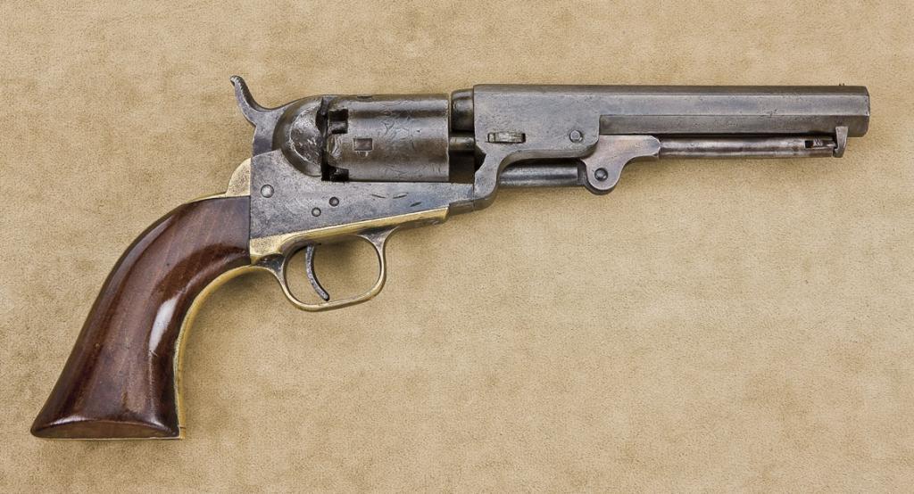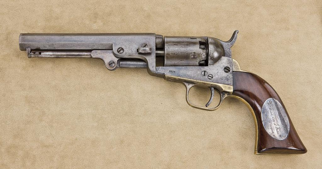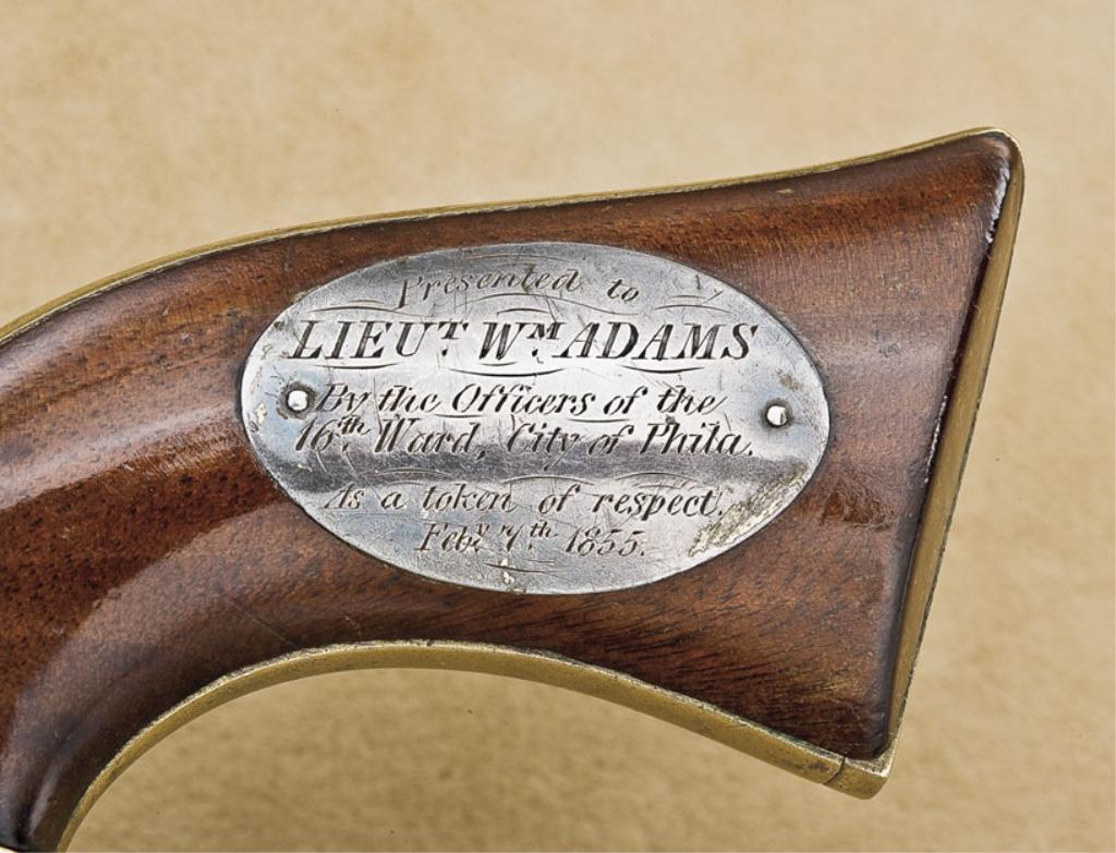 Colt Model 1849 Pocket percussion revolver, .31 cal., 5 shot, 5” octagon barrel, blue finish, varnished wood grips with inscribed oval silver plaque in left grip “Presented to Lieut. Wm. Adams By the Officers of the 16th Ward, City of Phila. As a token of respect Feby 7th 1855”. This gun is in overall good condition showing an even brown patina over metal surfaces; the cylinder shows much of its scene although there are many scattered nicks and mars on it; a casting flaw on the left side of the loading lever; fair bore, good markings; fair + action, good grips with period accomplished presentation plaque. This lot is accompanied by a letter from the City of Philadelphia dated October 11, 1974 which states that a William Adams was a Lieutenant of Police with an address of Leopard Street above Otter in the years 1855 and 1856, signed by City Archivist Ward J. Childs. Also included is some research concerning a William K. Adams who was with the First Regiment of the North Carolina Infantry during the Civil War but only appears to be the start of pursuing further, the potential later history of Police Lt. William Adams. Est.: $1,000-$2,000.