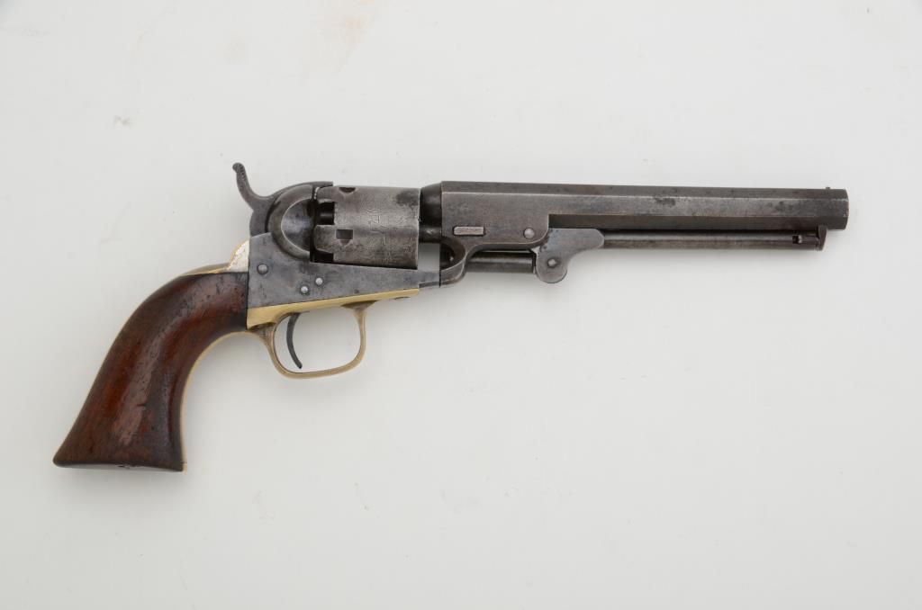 Colt Model 1849 Pocket percussion revolver, .31 cal., 6” octagon barrel, blue and case hardened finish, wood grips, #157315. This gun is in overall very good + condition showing a plum brown patina with traces oforiginal case colors on the loading lever and frame, some areas of erosion at front of cylinder and muzzle, good action, majority of original cylinder scene remaining, all matching visible serial numbers, replacedwedge, good wood grips showing wear; a very presentable Pocket Model with a good look and desirable in the 6” barrel length. Est.: $600-$1,200.