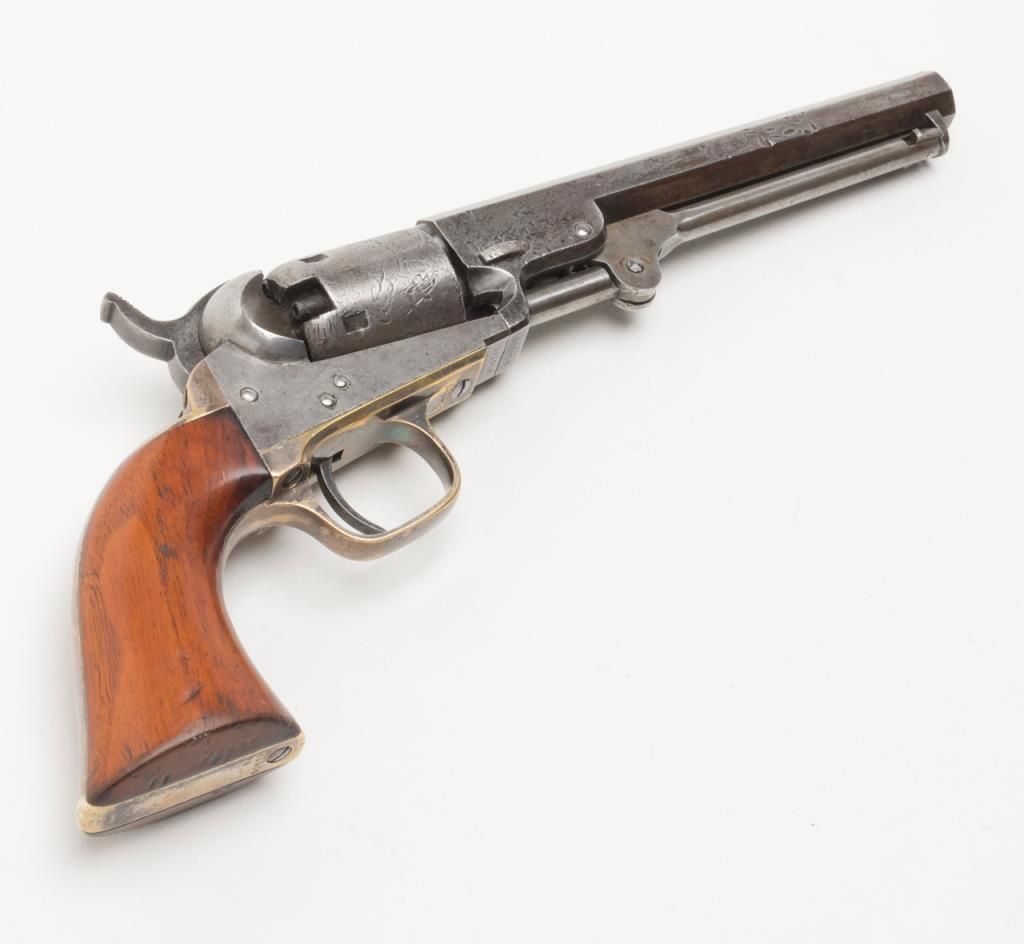 Colt Model 1849 Pocket percussion revolver, .31 cal., 6” octagon barrel, blue and case hardened finish, wood grips, #181456 in overall very good condition showing a grey/brown patina, matching visible numbers, considerable original cylinderscene, crisp action, good markings, traces of original silver wash in protected areas of straps, very good grips. (Antique). Est.: $750-$1,500.