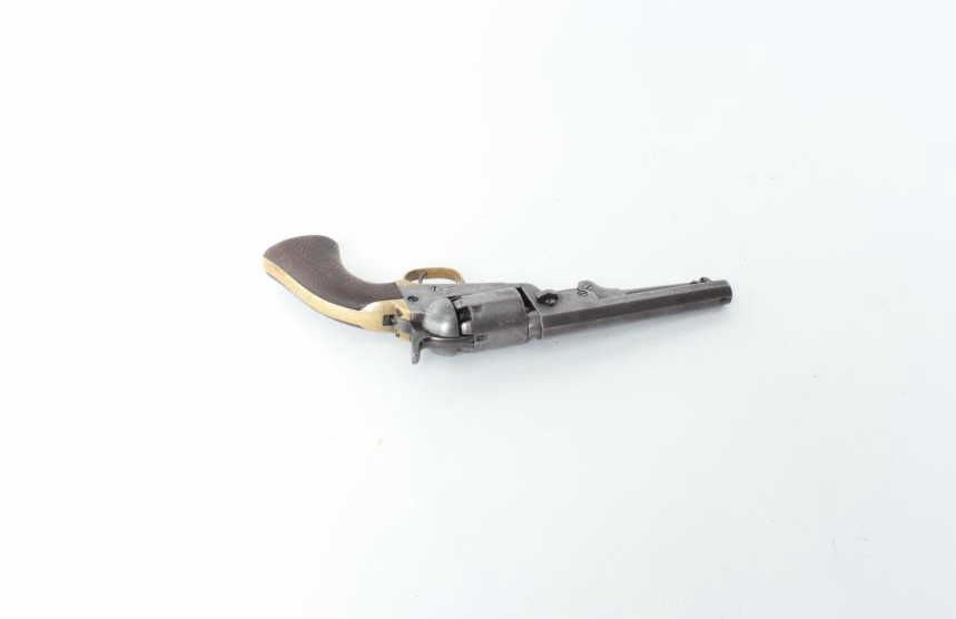 5” octagon barrel, brass straps, wood grips, S/N 225527, all matching visible numbers, overall good condition with a light grey patina, remnants of original cylinder scene, working action, good markings and overall good grips that show some weathering and several “kill” notches on the back of the right side of grips. (Antique). Est.: $600-$1,200.