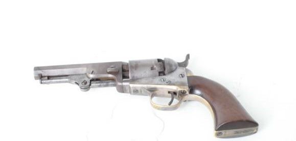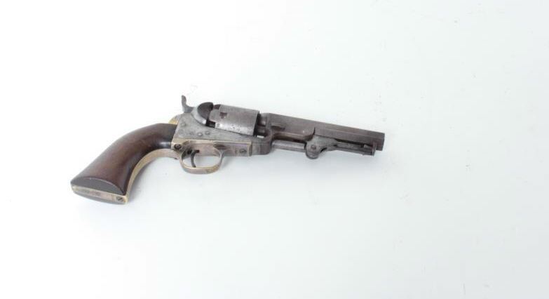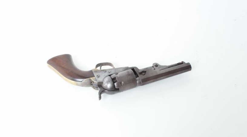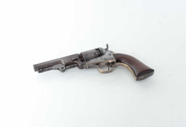 4” octagon barrel, brass straps, wood grips, S/N 133946, in overall very good condition showing matching visible numbers, majority of original cylinder scene, grey patina, crisp action, sharp markings and very good wood grips; areas of original silver was on straps in protected areas. (Antique). Est.: $700-$1,400.