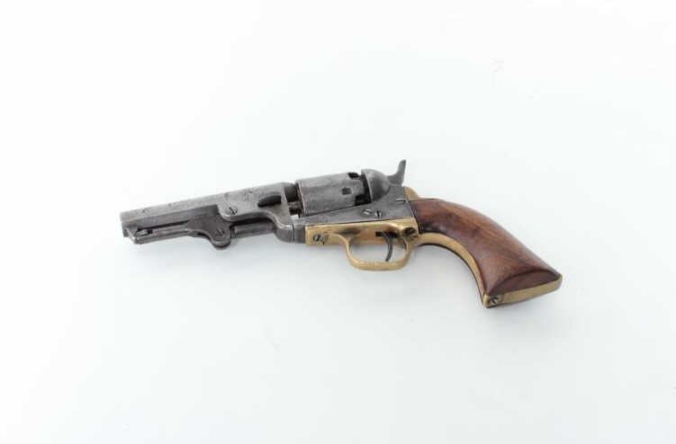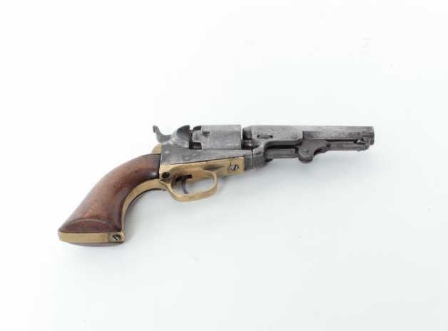 4” octagon barrel, brass straps, wood grips, S/N 275212, matching visible numbers (rammer un-numbered); grey patina, faint traces of original cylinder scene, good action, replacement wedge, small crack to brass trigger guard at front screw, very good grips. (Antique). Est.: $500-$1,000.