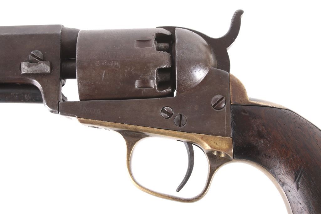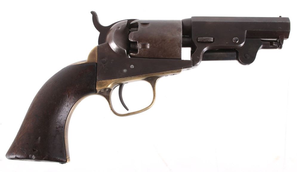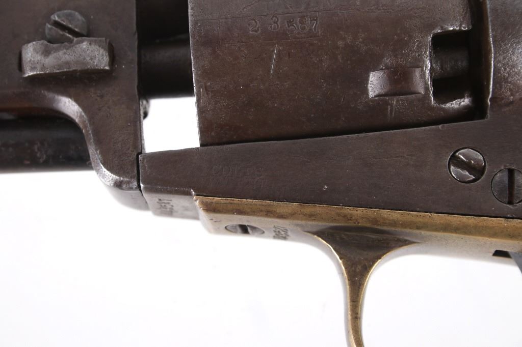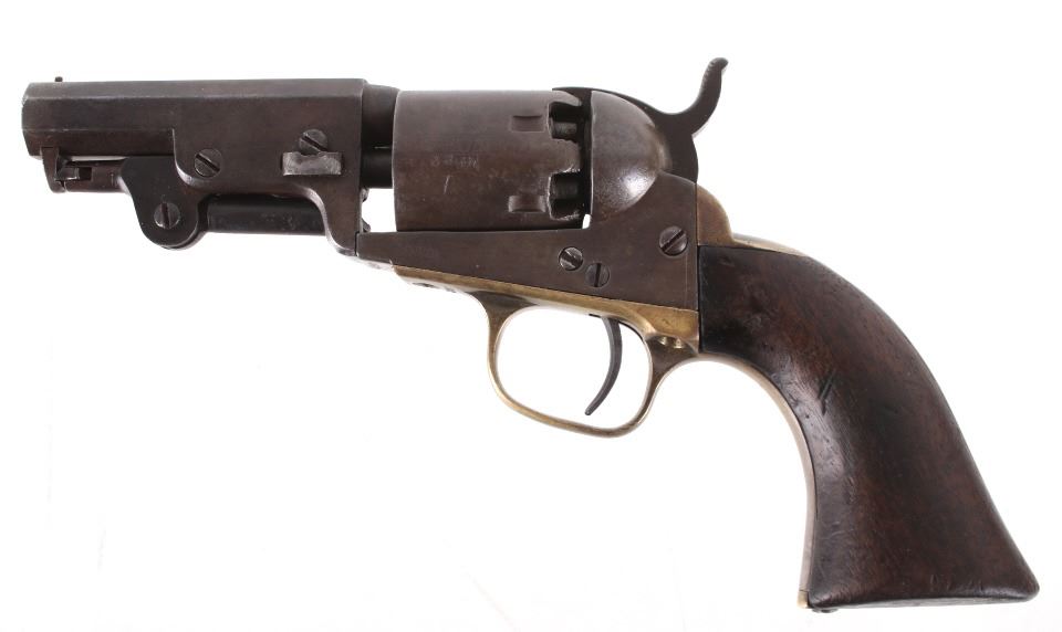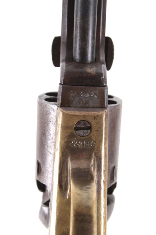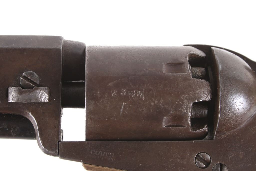 Included in this lot we have a Colt Model 1849 single action percussion cap pocket revolver chambered in .31 caliber. This is a fine, original example .31 caliber, five-shot revolver that found favor with officers and enlisted men as personal weapons during the Indian Wars of the period. Many of these also saw service in the gold fields of California, the settling West, and in about all urban areas during this very turbulent time of Post-Civil War Reconstruction. The 1849 was one of Colt’s most popular designs that was large enough for aimed fire, but small enough to conceal in a waste band or unobtrusive holster. They also found favor with gamblers and “ladies of the evening.” The revolver displays a 3" barrel, walnut grips, brass trigger guard, six shot cylinder, and warm patina. The top of the barrel is marked with "ADDRESS SAM’L COLT NEW-YORK US AMERICA” in faint faded lettering with only a few letters fully visible. The left side of the frame is marked "COLT’S PATENT” with the cylinder marked with the serial number and a faded etched design. The revolver features nice, overall aged patina metal. Fine walnut grips show only normal light wear. This example also shows a mellow, uncleaned brass back strap and trigger guard. The revolver shows matching serial number across the piece with the cylinder missing the first number. This is one of the most popular and successful of the Colt percussion revolvers and a key model for any Colt or Old West collection. Serial Number: 223587. This firearm qualifies as an Antique and does not require FFL Transfer or NICS Background Check.