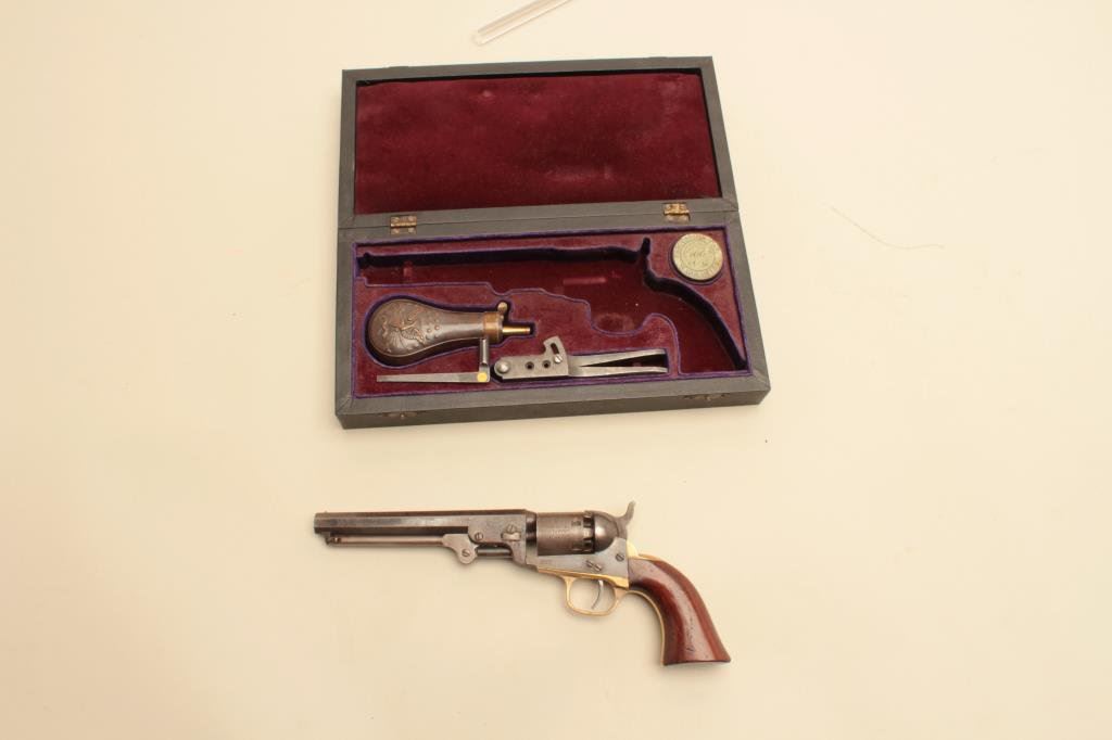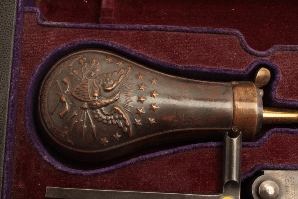 barrel, blued and case hardened finish, wood grips, S/N 267026 (all matching visible S/Ns), in overall very good condition showing traces of original blued finish on barrel, traces of muted original case colors on frame and loading lever, majority of original cylinder scene remaining, crisp action, sharp markings and very good + wood grips; accompanied by a modern (1960’s period) Pelson casing with excellent original accessories including a brass powder flask, iron bullet mold, iron combination wrench/screwdriver and percussion cap tin. (Antique). Est.: $1,750-$3,500.