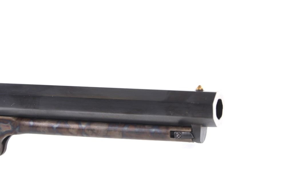 Colt Black Powder Series First Model 1851 Navy, .36 caliber percussion revolver, new condition in original Colt black box. These superb authentic Colt produced revolvers were introduced in November 1978 and produced in various models until November 1982. The square-back trigger guard Model 1851 Navy revolver is one of the most historical and desirable of the production line. This example with serial number 27946 comes complete with its original black box marked “The authentic COLT BLACK POWDER series” with end label markings of “Model F1100” and matching description and serial number. The inside lid of the box contains Colt literature etc. This magnificent revolver has a color case hardened frame and deeply blued barrel, cylinder with engraved cylinder scene, etc. and silver plated back strap, front strap and trigger guard. A truly stunning Colt that is now over 40+ years out of production. These are rapidly increasing in value, and this is one of the most desirable and attractive of the entire Black Powder series line. Serial Number: 27946. This firearm qualifies as an Antique, and does not require FFL Transfer or NICS Background Check.