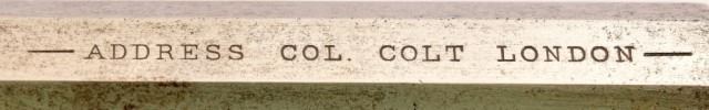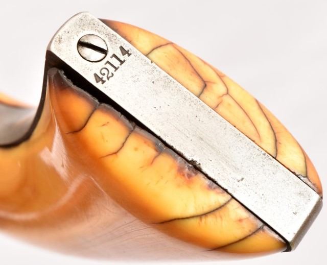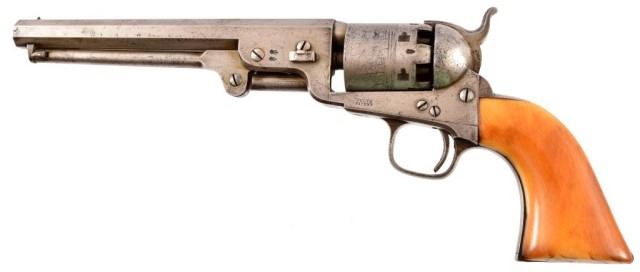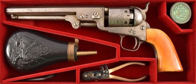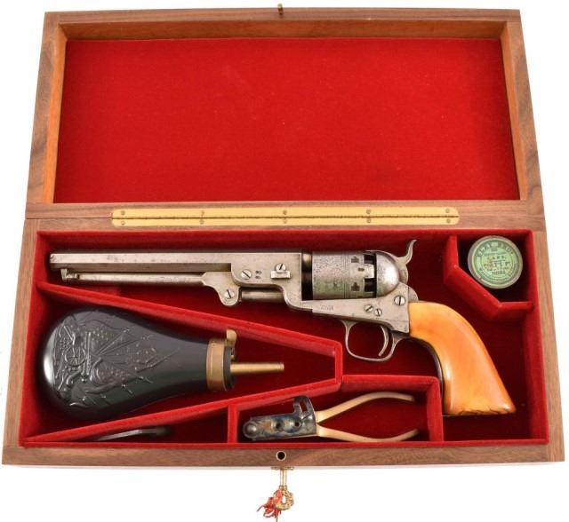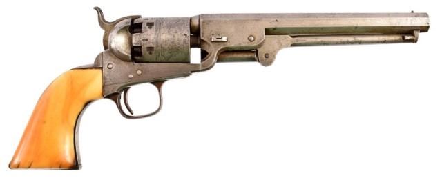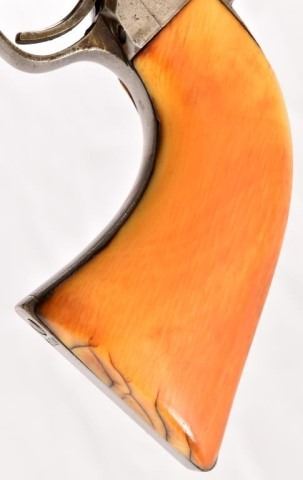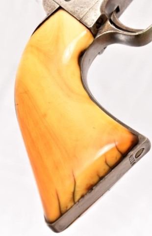 Manufactured 1851, 7.5" barrel .36 caliber, ivory grips. Case is not original. Sharp markings and cylinder engraving,