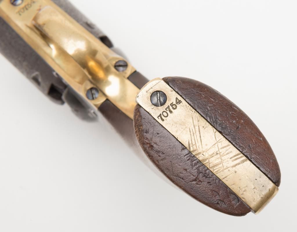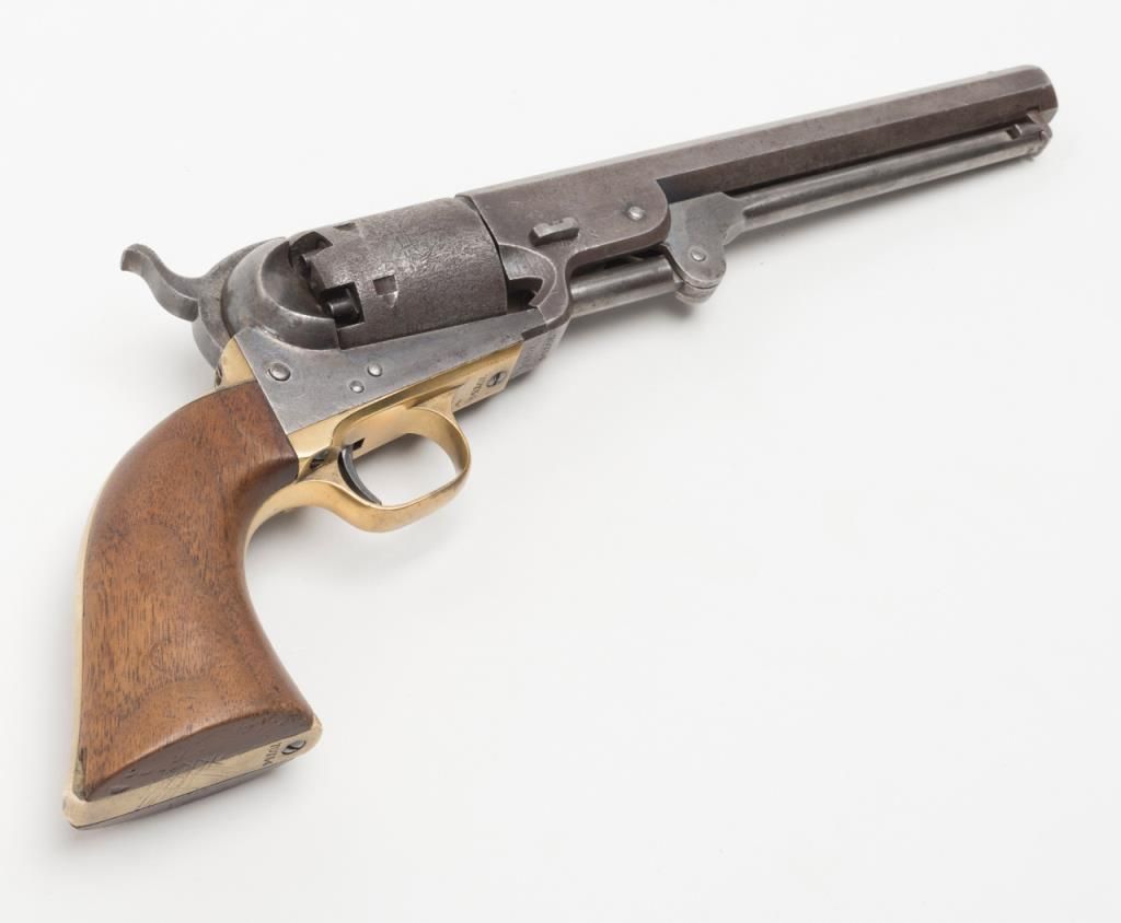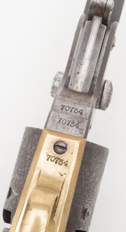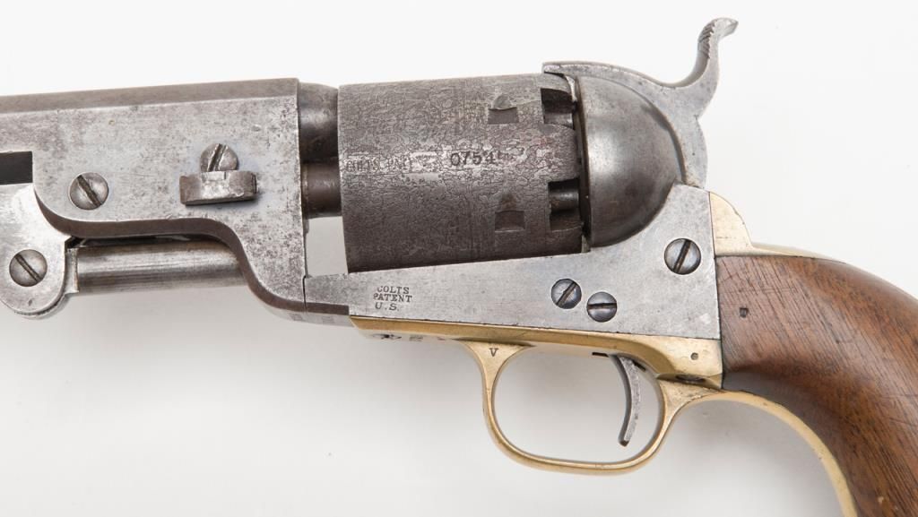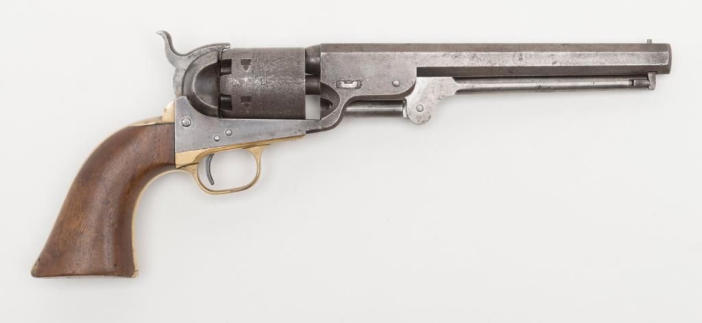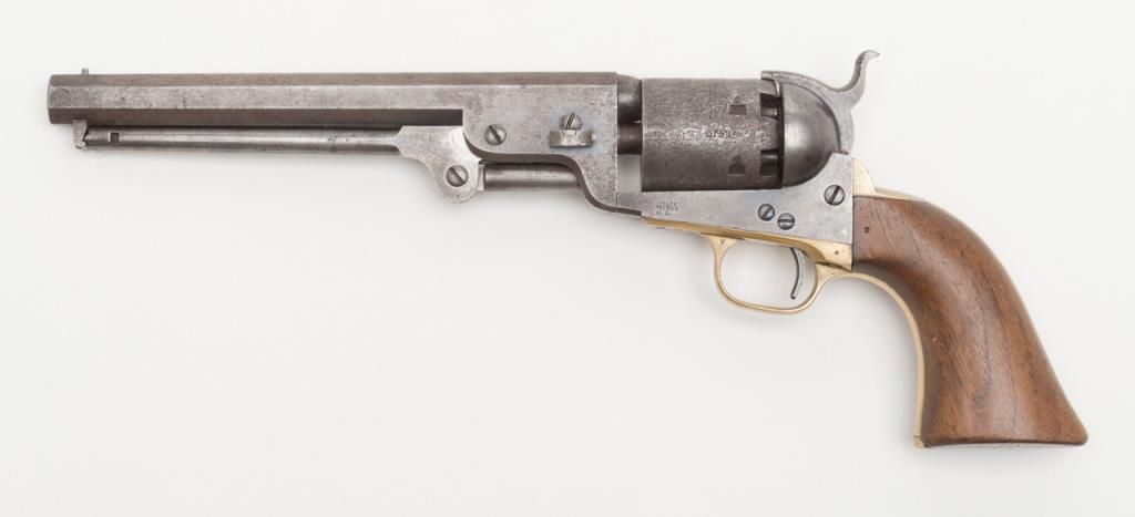 Colt Model 1851 Martial U.S. Navy percussion revolver, .36 cal., 7-1/2” octagon barrel, blue and case hardened finish, wood grips, #70754 in overall un-cleaned good to very good condition showing traces of original blue in protected areas of the barrel, some original cylinder scene showing on cylinder surface that appears generally pitted or disturbed on the surface some time ago but with considerable patina now present; all matching serial numbers including wedge andcylinder arbor except the rammer which is numbered 1989; both the frame and rammer show considerable muted original case colors; the action is crisp, the markings very good and the bore is fair +. The grips are very good the a faintly visibleinspector’s cartouche on both the left and right grips. The gun is accompanied by a modern-made wood casing with partitioned interior that is lined and containing a double cavity Colt’s Patent iron bullet mold, an Eley London cap tin, and anaged modern brass powder flask. (Antique). Est.: $2,000-$4,000.