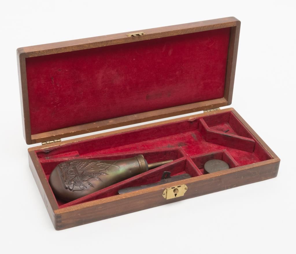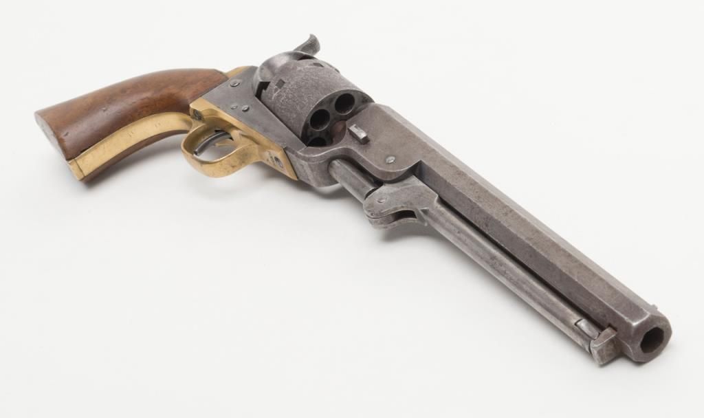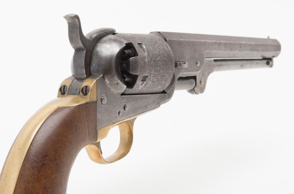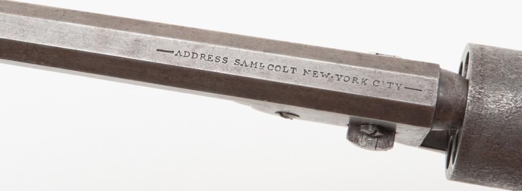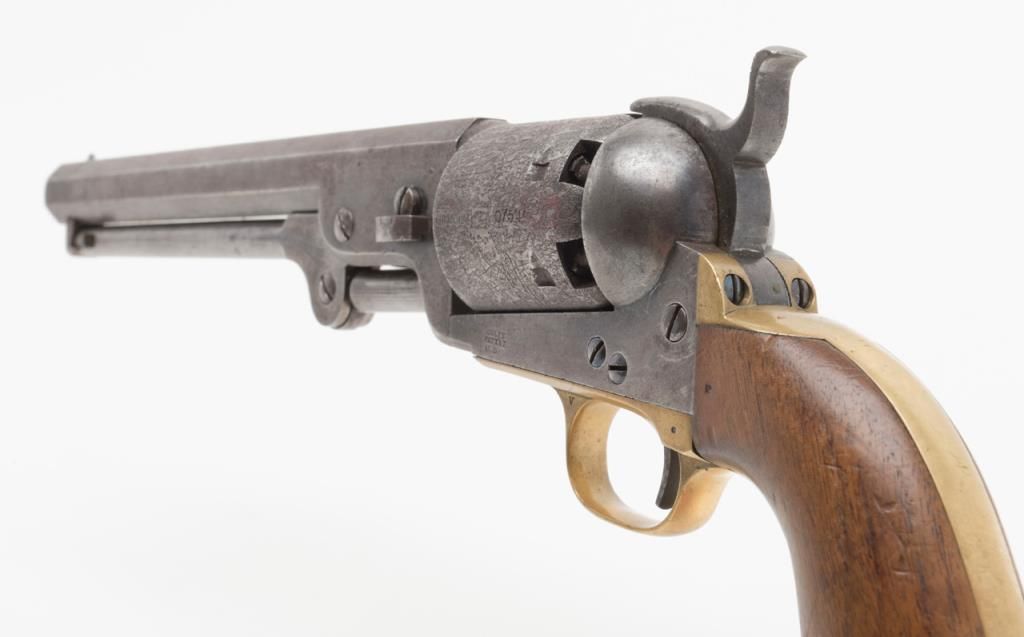 Colt Model 1851 Martial U.S. Navy percussion revolver, .36 cal., 7-1/2” octagon barrel, blue and case hardened finish, wood grips, #70754 in overall un-cleaned good to very good condition showing traces of original blue in protected areas of the barrel, some original cylinder scene showing on cylinder surface that appears generally pitted or disturbed on the surface some time ago but with considerable patina now present; all matching serial numbers including wedge andcylinder arbor except the rammer which is numbered 1989; both the frame and rammer show considerable muted original case colors; the action is crisp, the markings very good and the bore is fair +. The grips are very good the a faintly visibleinspector’s cartouche on both the left and right grips. The gun is accompanied by a modern-made wood casing with partitioned interior that is lined and containing a double cavity Colt’s Patent iron bullet mold, an Eley London cap tin, and anaged modern brass powder flask. (Antique). Est.: $2,000-$4,000.
