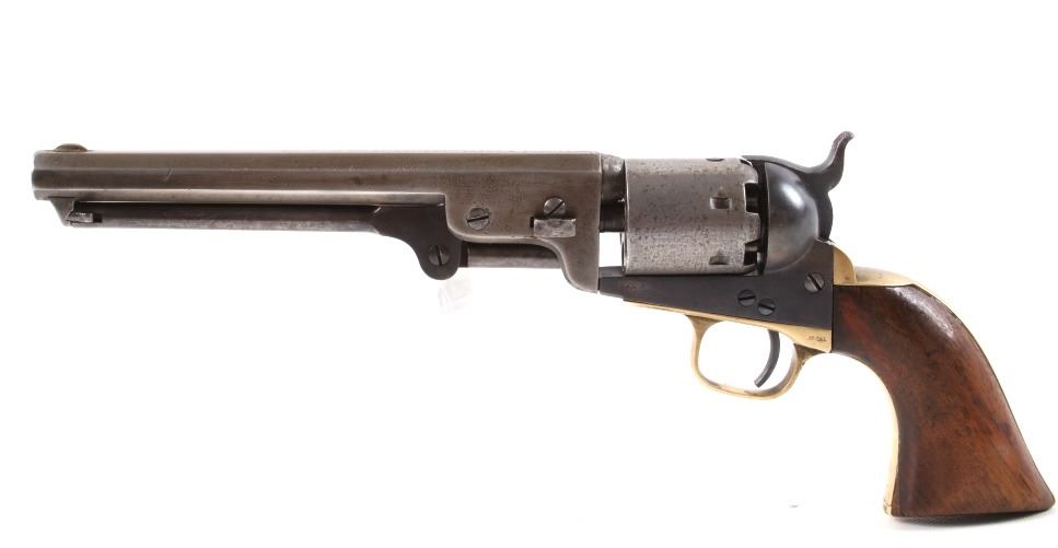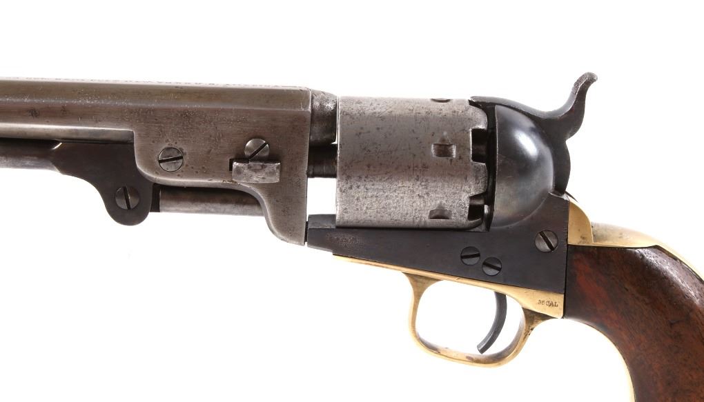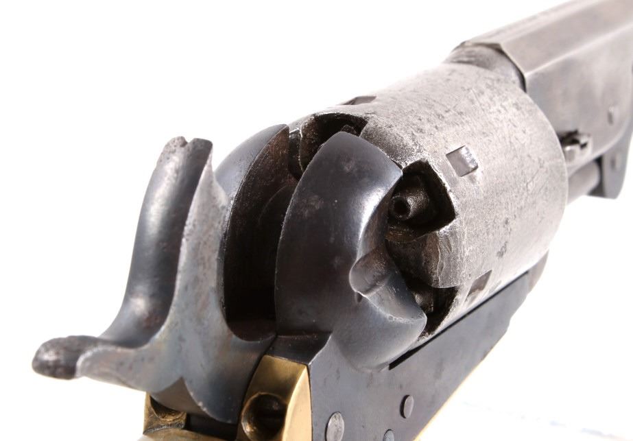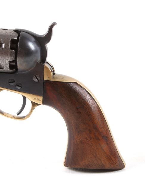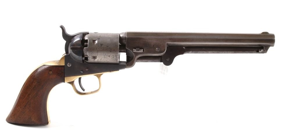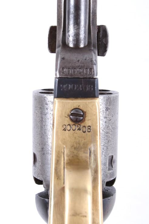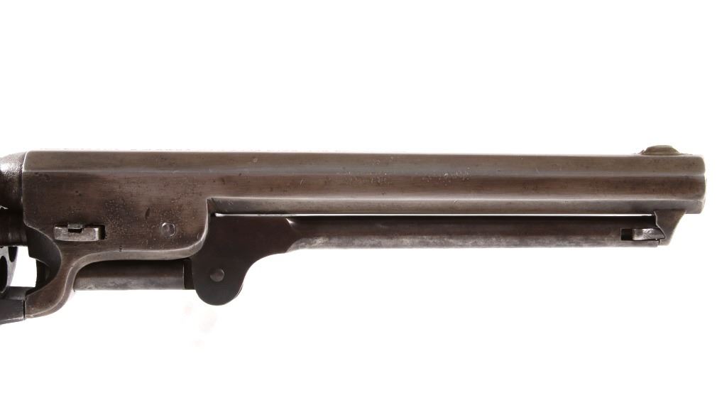 For your consideration is a beautiful, original condition Colt 1851 Navy six-shot .36 Caliber revolver. This fine example of Colt’s most famous and popular model percussion revolver shows no signs of over-cleaning and all markings are sharp and clear including the barrel stamping “ADDRESS SAML COLT NEW YORK U.S.AMERICA” and “COLTS PATENT” on the left side of the frame. Also has the correct “36 CAL” stamping on the left side of the trigger guard. This exceptional Colt has lovely uncleaned and unpolished mellow brass grip straps and trigger guard, wonderful aged blue patina on the barrel and cylinder with roll engraved cylinder scene depicting a battle between the Texas Navy and Mexico. Excellent mechanics, screws and has matching serial number 200208 (indicating a manufacture date of 1867) stamped on the barrel, trigger guard, butt, cylinder, cylinder arbor and even on the frame wedge. The factory original one piece walnut grips fit beautifully and still retain good wood finish. The Colt 1851 Navy was one of the most classic sidearms of the Civil War and later in the Old West. Wild Bill Hickock was carrying a pair of Colt 1851 Navy revolvers when he was gunned down in Deadwood, South Dakota on August 2, 1876. This historical Colt holster revolver with correct factory 7 ½” octagon barrel is a very fine example. Uncleaned and original with great appeal and appearance, this Colt would be at home in the finest firearm, Civil War or Western collection. This firearm qualifies as an Antique, and does not require FFL Transfer or NICS Background Check.