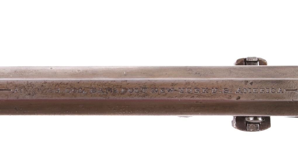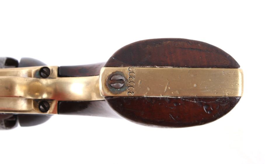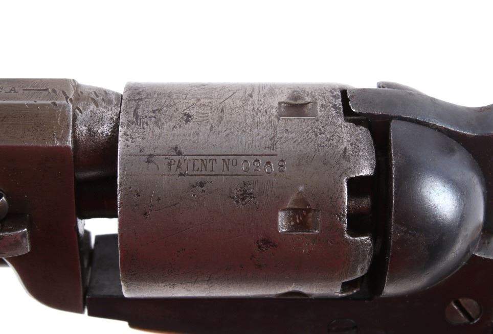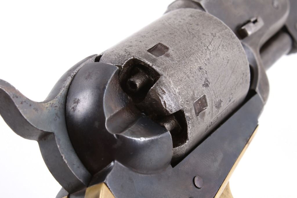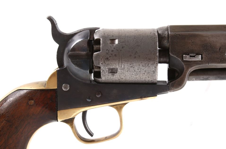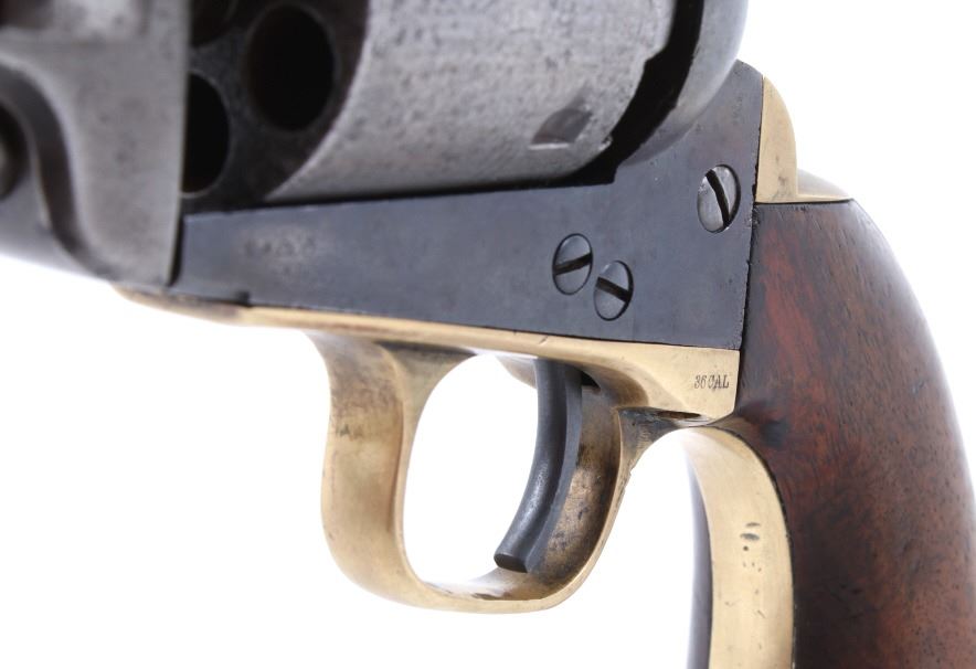 For your consideration is a beautiful, original condition Colt 1851 Navy six-shot .36 Caliber revolver. This fine example of Colt’s most famous and popular model percussion revolver shows no signs of over-cleaning and all markings are sharp and clear including the barrel stamping “ADDRESS SAML COLT NEW YORK U.S.AMERICA” and “COLTS PATENT” on the left side of the frame. Also has the correct “36 CAL” stamping on the left side of the trigger guard. This exceptional Colt has lovely uncleaned and unpolished mellow brass grip straps and trigger guard, wonderful aged blue patina on the barrel and cylinder with roll engraved cylinder scene depicting a battle between the Texas Navy and Mexico. Excellent mechanics, screws and has matching serial number 200208 (indicating a manufacture date of 1867) stamped on the barrel, trigger guard, butt, cylinder, cylinder arbor and even on the frame wedge. The factory original one piece walnut grips fit beautifully and still retain good wood finish. The Colt 1851 Navy was one of the most classic sidearms of the Civil War and later in the Old West. Wild Bill Hickock was carrying a pair of Colt 1851 Navy revolvers when he was gunned down in Deadwood, South Dakota on August 2, 1876. This historical Colt holster revolver with correct factory 7 ½” octagon barrel is a very fine example. Uncleaned and original with great appeal and appearance, this Colt would be at home in the finest firearm, Civil War or Western collection. This firearm qualifies as an Antique, and does not require FFL Transfer or NICS Background Check.