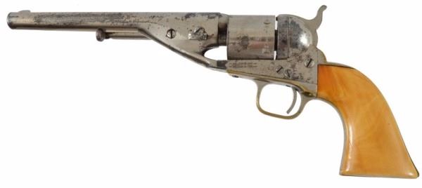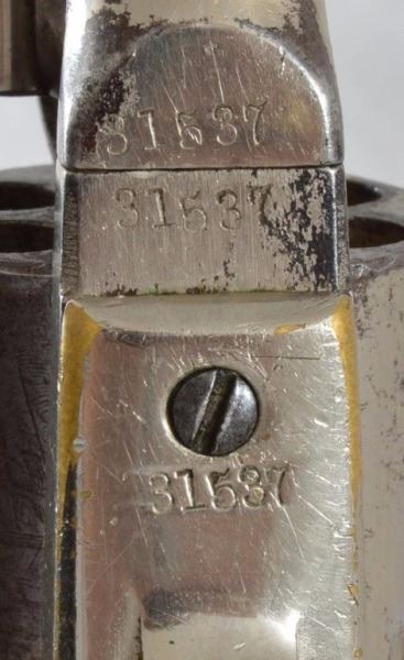 Serial no. 31537 .36 caliber. in good working condition retaining approx. 70% of original silver finish. clear barrel address & cylinder scene with finish loss on cylinder. grips are in solid condition.
