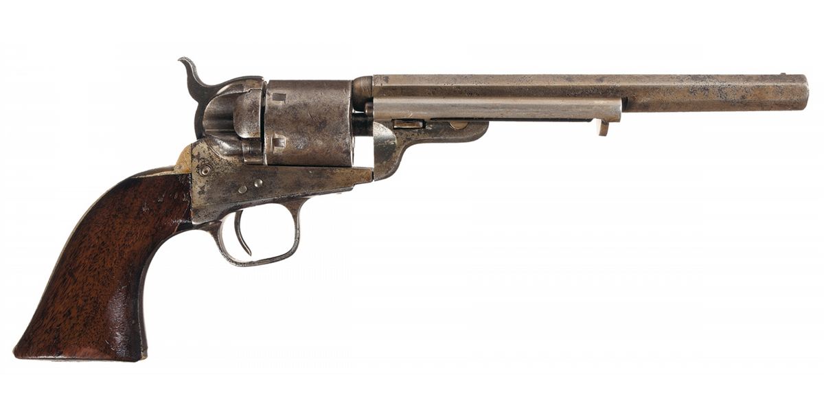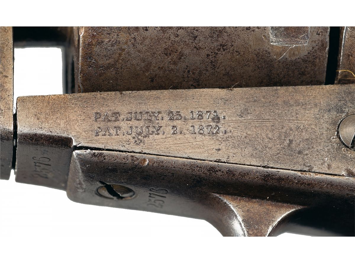 This is an example of a Colt Model 1851 Navy Revolver which was factory converted or manufactured to fire the .38 centerfire cartridge by Colt. These conversions were done in the mid-1870s and were manufactured using unassembled and unfinished Model 1851 parts. Approximately 3,800 Model 1851 Cartridge Conversion Revolvers were manufactured. The loading lever has been removed with the hole unplugged and an ejector rod with a bulls-eye type head has been added. The frame is fitted with a loading gate and a centerfire breech plate. The centerfire firing pin is attached to the hammer by two rivets. Matching numbers on the barrel, frame, grip straps and cylinder with the assembly number "71" on the loading gate. The top barrel flat has the one line New York U.S. America marking, the two line/two date patent marking on the left side of the frame and fitted with a one-piece grip.