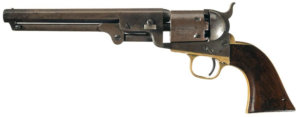 Manufactured in 1864. One-line New York barrel address, "COLTS/PATENT" on the left side of frame and navy battle scene on cylinder. The upper left front of the trigger guard is marked with the letter "S". The left trigger guard shoulder is marked "36 CAL". Complete matching serial number on the barrel, frame, trigger guard and back strap, the partial serial number "78650" is marked on the wedge, "8650" on the cylinder pin and cylinder, and the loading lever is un-numbered. Fitted with a smooth one-piece walnut grip.