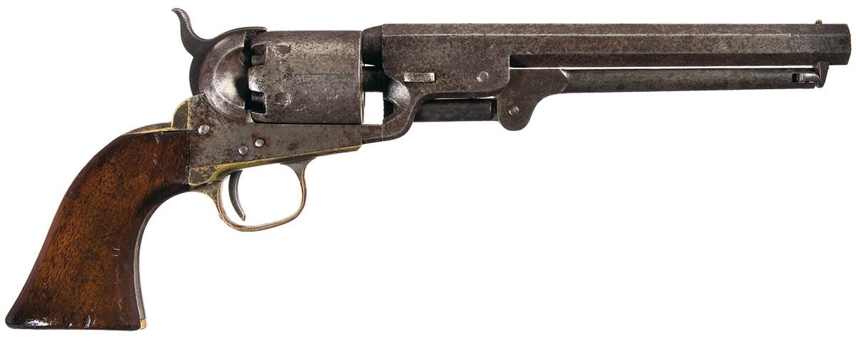 Manufactured in 1861. Standard Hartford barrel address, "COLTS / PATENT" on left side of frame, the number "2" on left side of barrel lug, and the Texas Navy scene on the cylinder. Matching number on frame, barrel, trigger guard, backstrap, wedge, loading lever, and cylinder. Modern replacement trigger. Fitted with a smooth one piece grip.