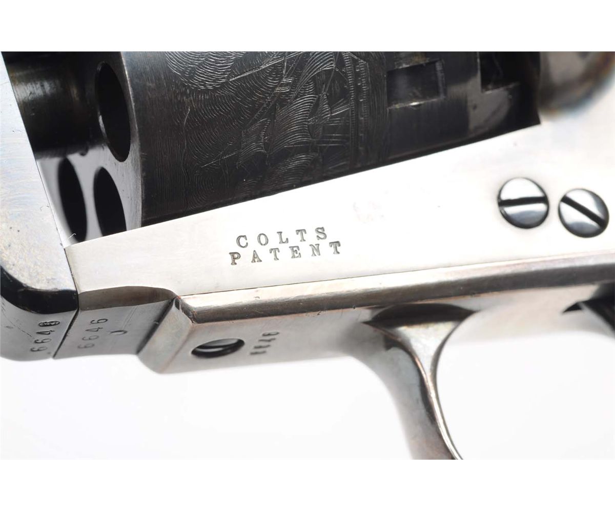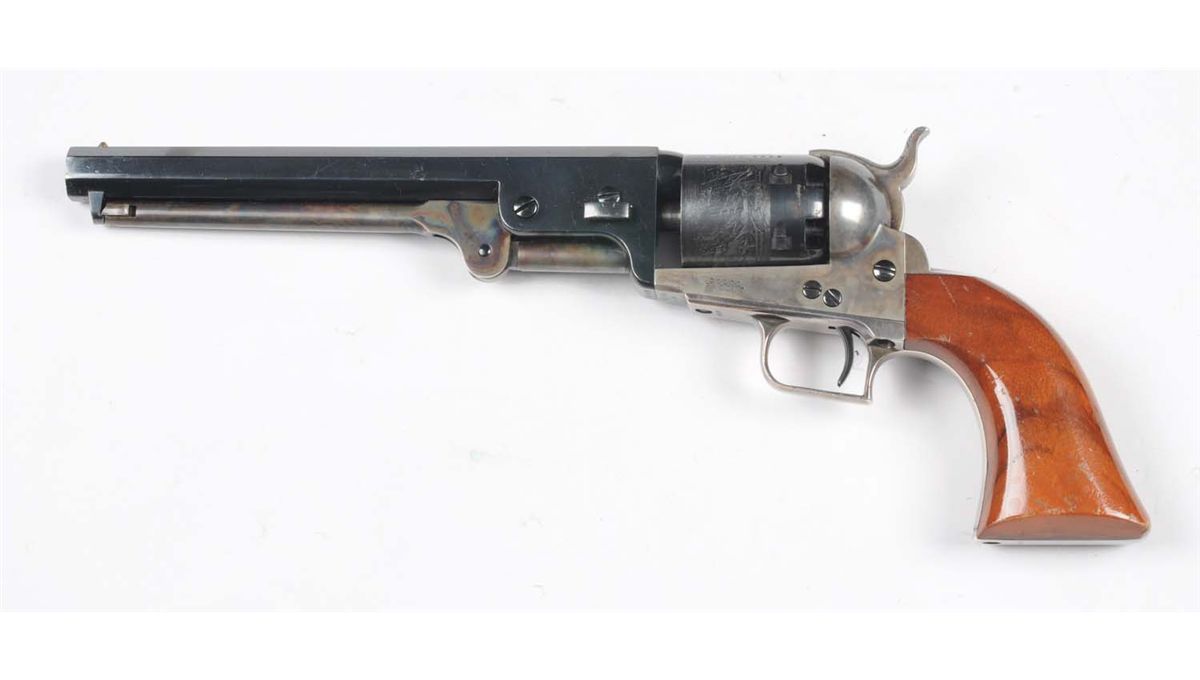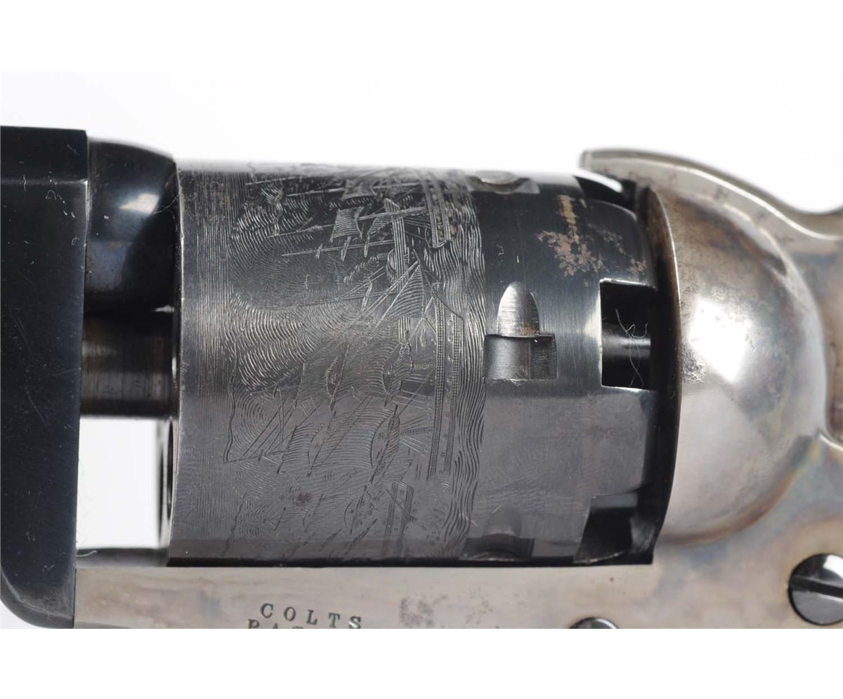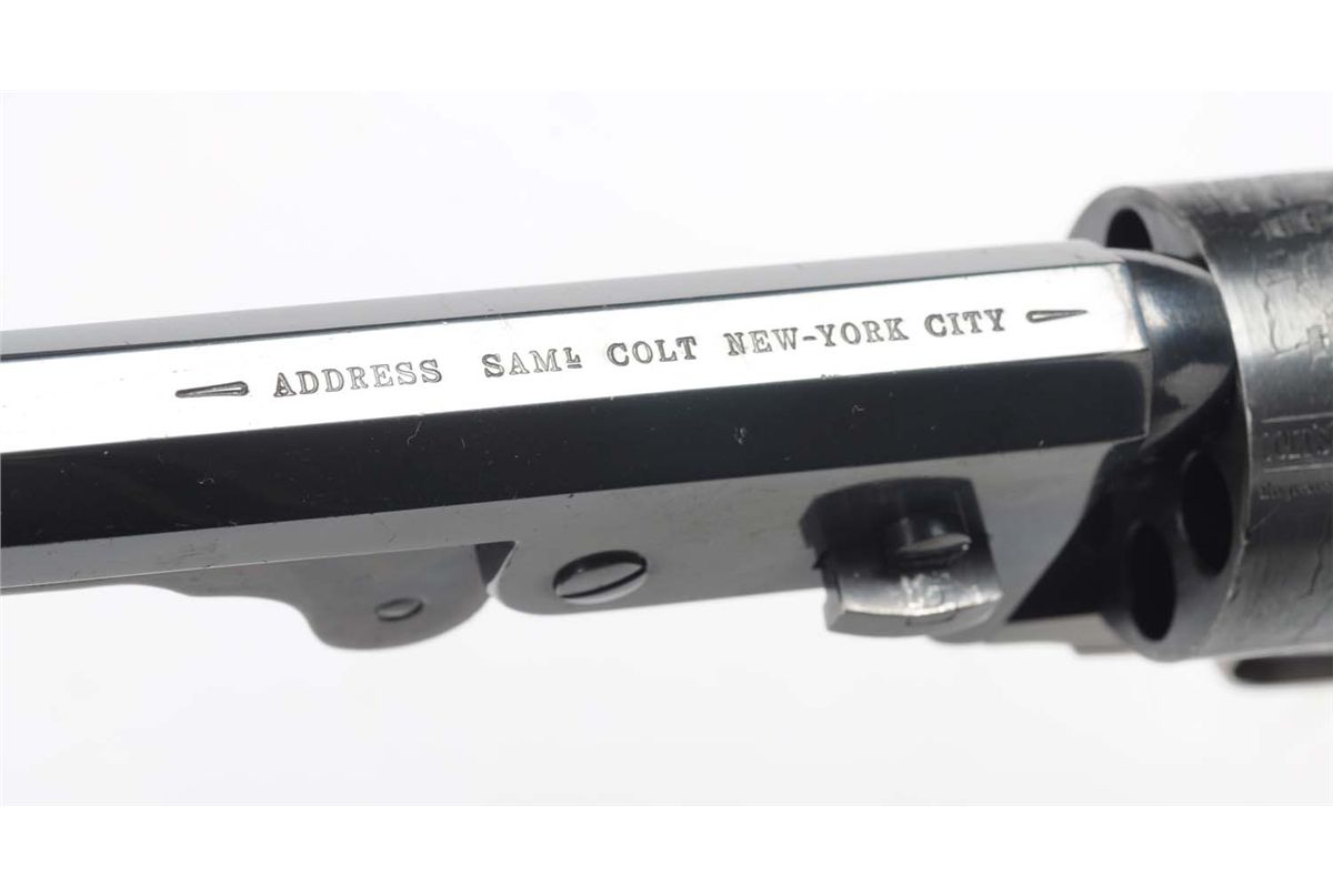 Serial # 6646 This is a standard second generation Colt Model 1851 Navy six-shot, .36 caliber percussion, with 7-1/2" blued barrel and cylinder. Case colored lever, frame, and hammer. Nickel square back trigger guard and back strap. Near mint varnished stocks. Minimal wear at muzzle. Light drag line. Near new condition overall.