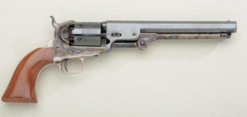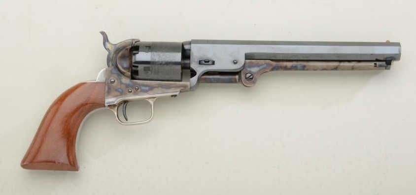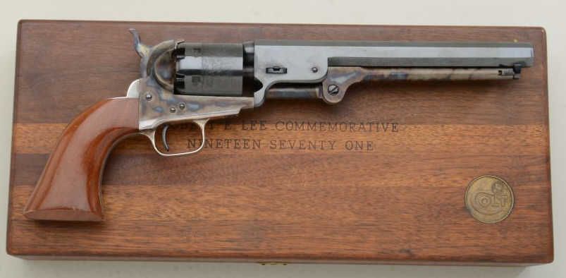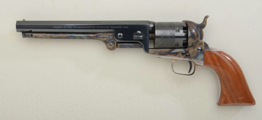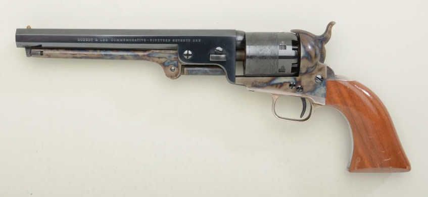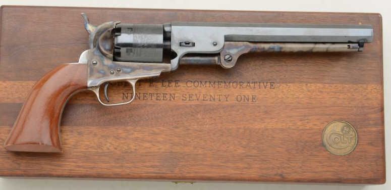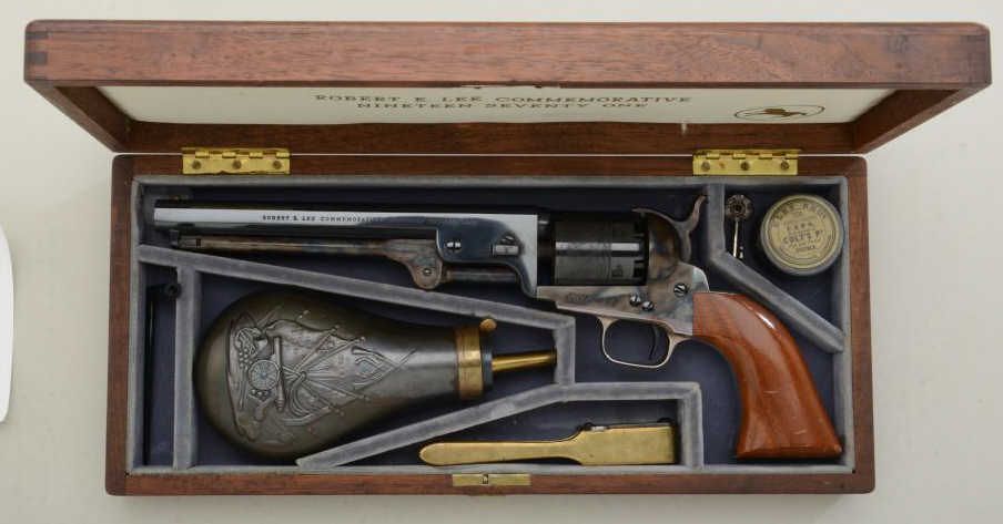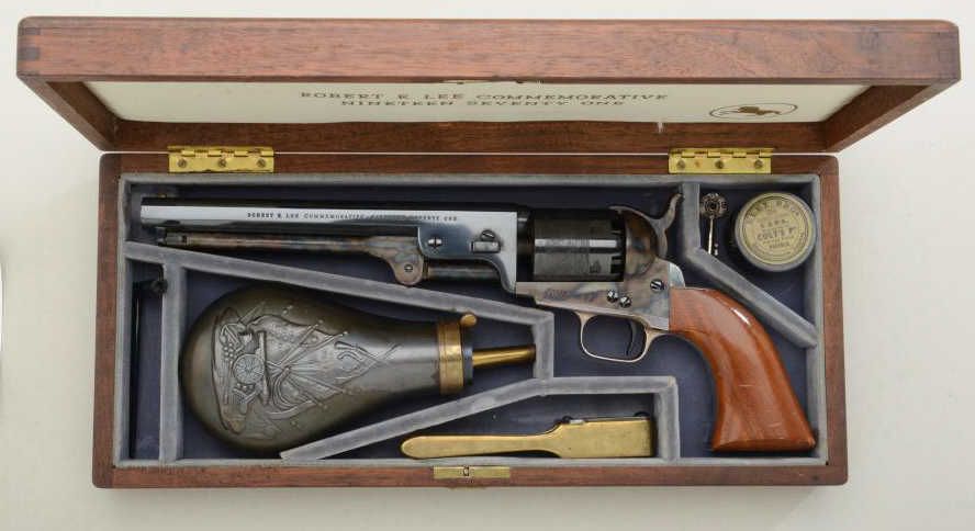 Colt Model 1851 Navy, Robert E. Lee Commemorative Series, .36 cal. percussion, blue and case hardened finish, varnished wood grips, serial #1476, cased with accessories. The revolver shows 99%+ bright originalblue, case hardening and silver finish on straps. The grips show a few storage mars. The accessories are complete and in good condition; the inside of the case shows some fading and small tatters. The latch whichsecures the top to the lock is broken off in the lock. The exterior of the box shows a few marks. Est.: $600-$1,200