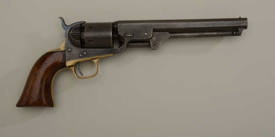Colt Model 1851 Navy percussion revolver, .36 cal., 7-1/2” octagon barrel, blue and case hardened finish, wood grips, #170743. This gun is in overall very good condition showing a plum grey patina on barrel and cylinder,traces of case colors on frame, considerable original cylinder scene on barrel, matching visible serial numbers, crisp action, good bore, good grips. Est.: $1,200-$1,800.