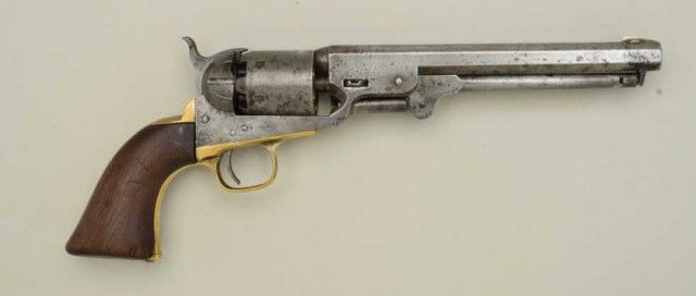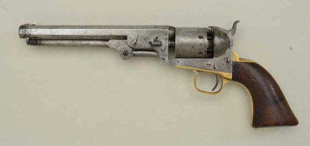 Colt Model 1851 Navy percussion revolver, .36 cal., 7-1/2” octagon barrel, wood grips, #131417. This gun is in overall good condition showing an old cleaning to metal surfaces that is returning to a grey patina,all matching visible serial numbers, traces of original cylinder scene remaining, good action and markings, dark bore, overall good wood grips with scattered wear and old mars right grip front toe shoes a small old loss. Est.: $750-$1,500.