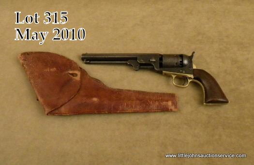 Colt Model 1851 Navy percussion revolver, .36 cal., blue and case hardened finish, wood grips, #148380. This gun is in overall good to very good condition showing a muted blue patina on the barrel with some bright blue around the wedgearea, matching blue patina on the cylinder that shows the majority of its original cylinder scene; muted traces of case colors on the frame and loading lever; good action and bore, all matching visible serial numbers except mismatched wedge and some knackering around the right side of the wedge port; good action and bore, good markings, older replaced brass front sight; wood grips are overall good with some wear and scattered small mars and scratches. A nice ’51 Navy. Accompaniedby a tan leather commercial flap holster in overall good condition, unmarked and appears to be circa 1930’s-40’s Est.: $900-$1,800.