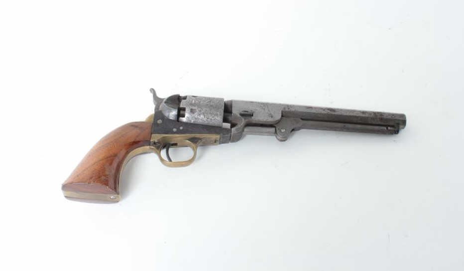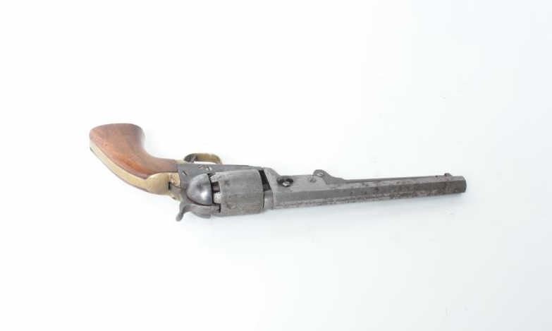 7.5” octagon barrel, brass straps and wood grips are replacements with traces of numbers (mostly removed), S/N 135178, barrel assembly, rammer and cylinder are S/N 113306; overall fair to good with scattered areas of pitting and erosion; tight action, good replacement grips. (Antique). Est.: $600-$1,200.