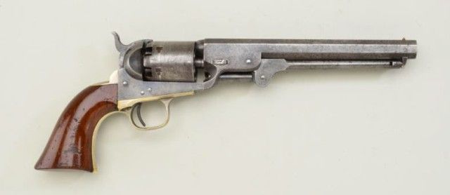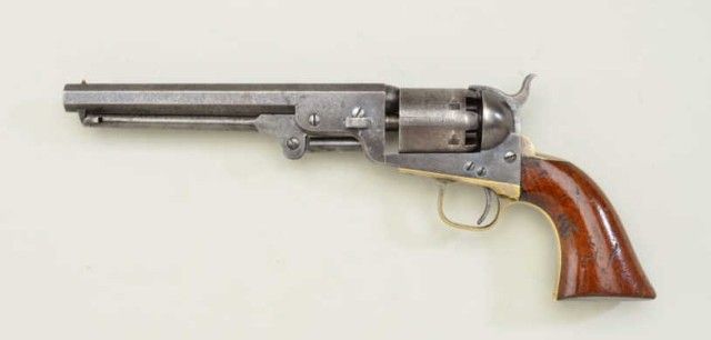 Colt Model 1851 percussion revolver, .36 cal., 7-1/2” octagon barrel, blue and case hardened finish, wood grips, #104138. This gun is in overall very good to fine condition showing scattered original blue in protected areas of barrel, majority of original cylinder scene remaining including crisp engagement date; considerable muted original case colors on the frame and loading lever; patina on this crisp and tight Navy is evenand matching throughout; all matching visible serial numbers, very good bore, crisp action, considerable original silver plating on the trigger guard and strong traces of original silver on backstrap; grips areoverall very good with lots of original finish with old scattered scratches and mars from storage; an overall very nice example of the ’51 Navy that to improve upon would cost considerably more than this estimate. Hasfactory letter stating shipped to J.P. Moores NY May 1861. Est.: $2,500-$4,500.