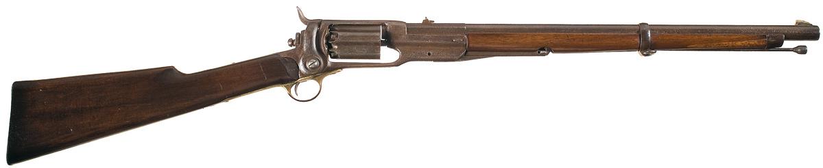 The barrel has subsequently been shortened to its current length of 23 1/4 inches with a replacement front blade sight and two leaf rear sight. There are no visible markings, except for the serial number and "56 CAL" on the brass trigger guard and the serial number on the frame. The visible numbers match. 5-shot fluted cylinder and ramrod. Smooth straight grip stock and full length forearm with a single barrel band and metal cap. The stock has a flat steel buttplate.