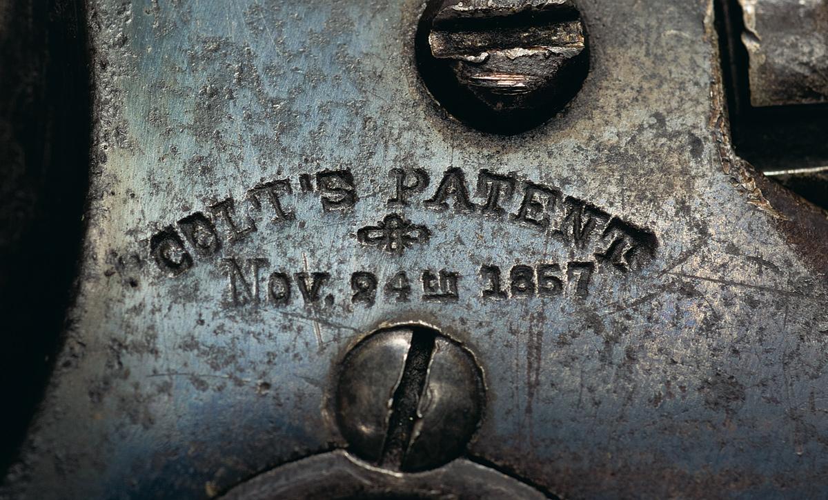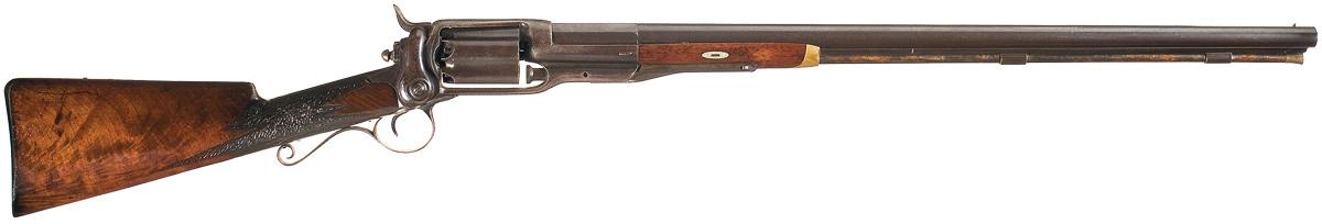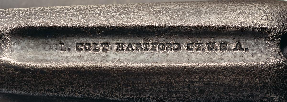 Colt manufactured approximately 1,100 of these revolving shotguns in both 10 and 20 gauge between 1860 and 1863. The top strap is marked, "COL. COLT / HARTFORD CT. U.S.A." , the left side of the frame is marked, "COLT'S PATENT / Nov 24th 1857, the serial number is marked on the bottom of the frame and the faint one line 1850 patent date is marked on one of the cylinder flutes. Brass bead front sight, casehardened hammer and mounted with a smooth forearm and straight grip stock with brass forend, textured wrist and iron shotgun buttplate.