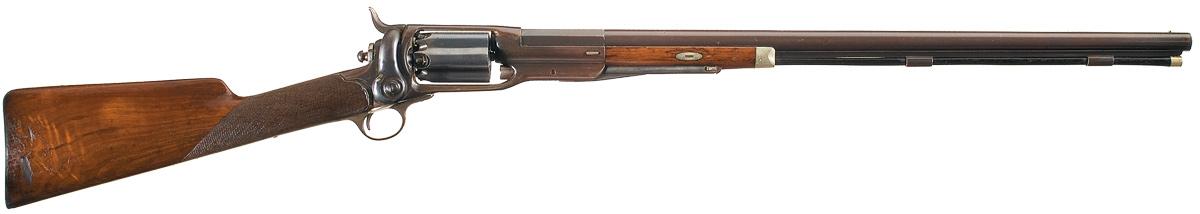 Condition: Very good as partially restored. The barrel, trigger guard and frame have a smooth dark patina with some minor pitting on the frame ahead of the cylinder. The cylinder is reparied and reblued with the patent markings having been re-engraved with some minor pitting. With the exception of two minor cracks on the stock toe, the period custom checkered wood is very good with most of the original varnish remaining and some scattered minor dings, dents and scratches, with relatively crisp checkering. With the exception of the left side frame marking, the markings remain crisp and clear. The action is fine.