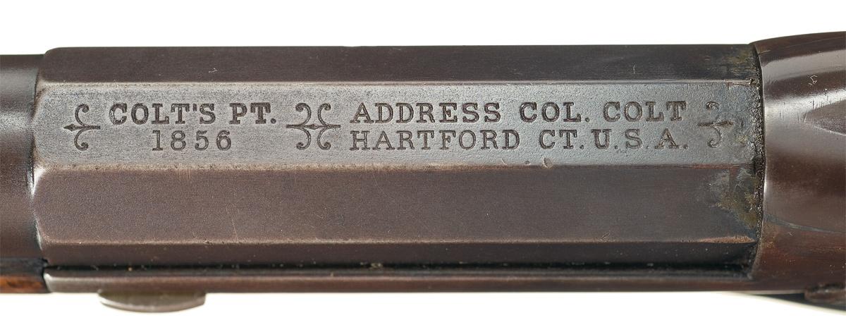 This is a representative example of a Colt small frame Model 1855 Revolving Shotgun manufactured circa 1860 to 1863. The shotgun has a .60 caliber (20 gauge) round barrel with semi-octagonal section at the breech. The barrel has an under-rib with two ramrod pipes and is fitted with a brass front bead sight. The shotgun has a wooden ramrod with flared brass tip. The shotgun has a five-shot fluted cylinder, straight rammer with indented center, small frame with sighting grove on the top strap and round iron trigger guard. The walnut stock has an iron shotgun buttplate. The wedge-fastened forearm has a German silver forearm tip and oval wedge escutcheon. The stock and forearm are straight grain walnut with a varnished finish and non-factory checkered stock wrist. The top of the octagonal section of the barrel is marked "{COLT'S PT. / 1856}" followed by "{ADDRESS COL. COLT / HARTFORD CT. U.S.A.}". The left side of the frame is marked "COLT'S PATENT / NOV.24th 1857" and "PATENTED SEPT. 10th 1850" is stamped in one cylinder flute. The matching serial number is stamped on the underside of the frame, the trigger guard finial and on the toe of the buttplate. The Colt Model 1855 Revolving Shotgun was manufactured in limited numbers, total production for both 10 and 20 gauge was approximately 1100, with the estimated production of small frame (20 gauge) at about 500.