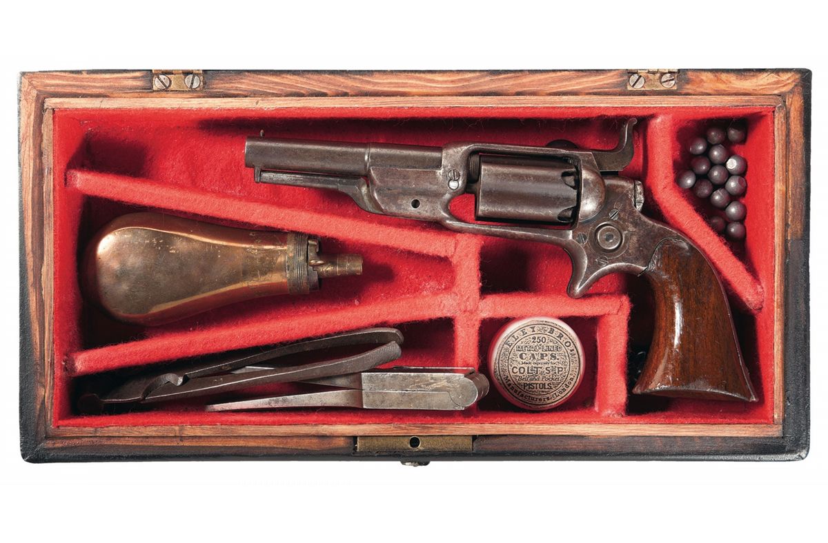 Manufactured in 1861. The barrel has the two line New York address and the fluted cylinder has the 1850 patent date. The barrel is numbered to the gun. Fitted with a one piece grip. The aftermarket partitioned case also holds a powder flask, two bullet molds, lead balls and reproduction Eley Brothers cap tin.