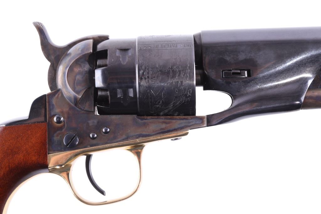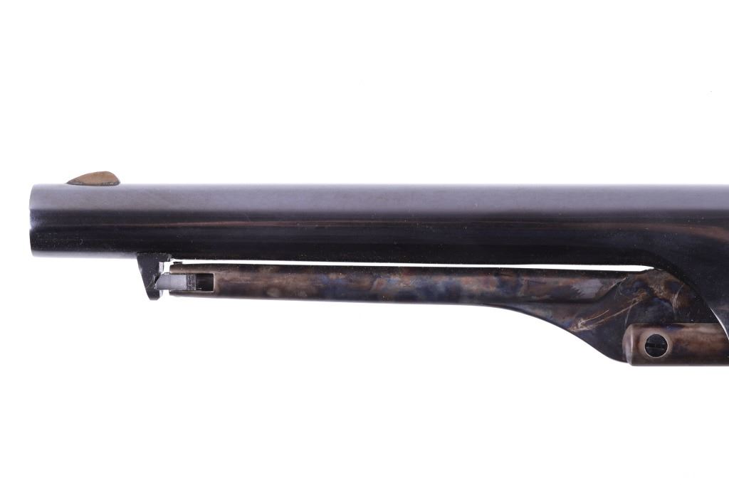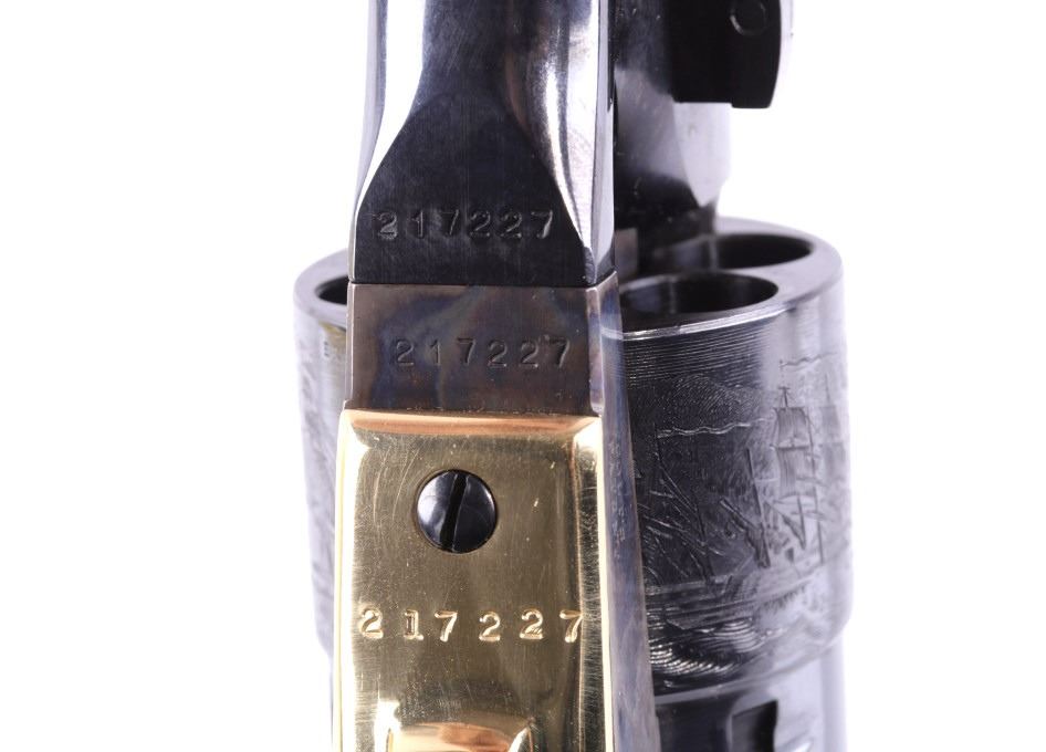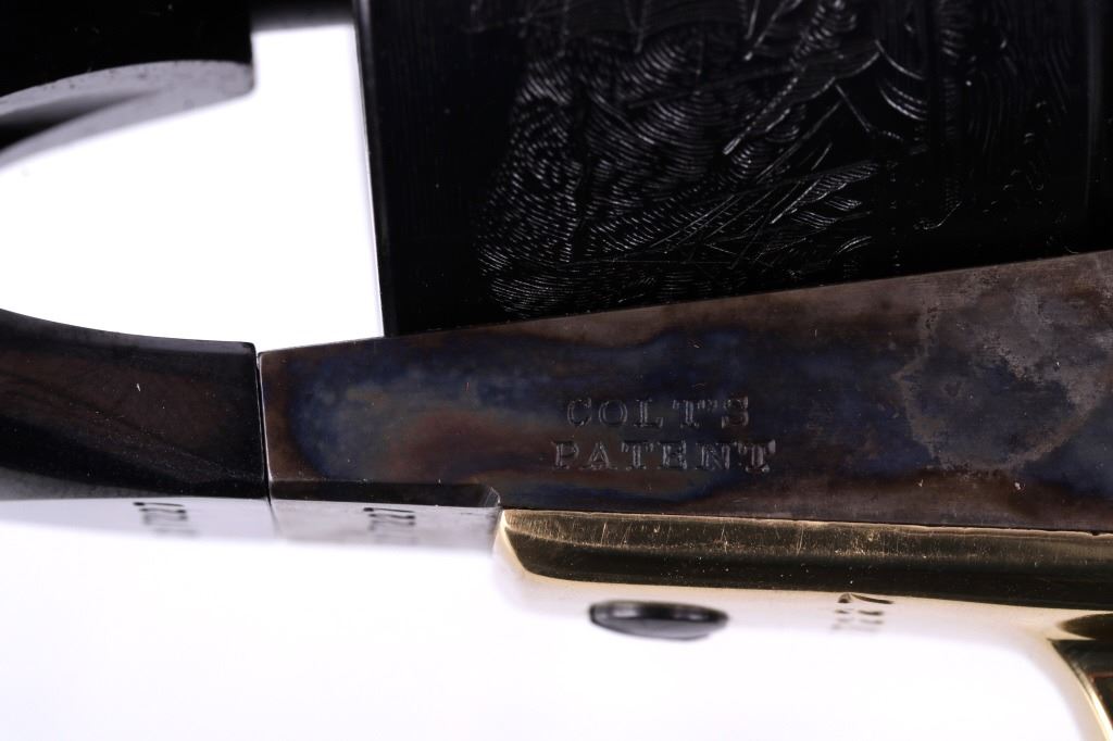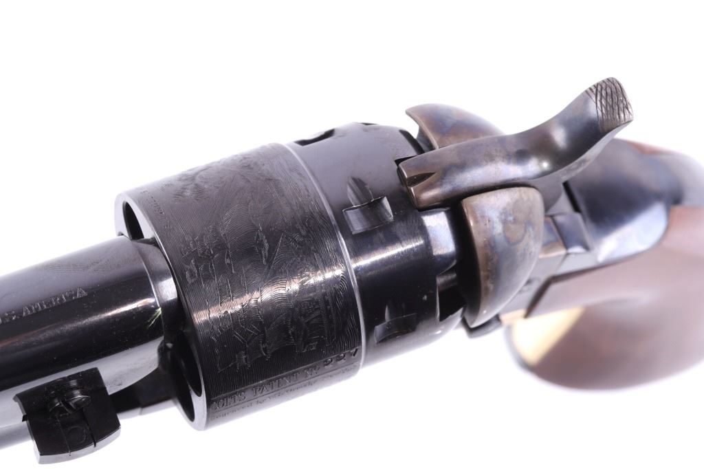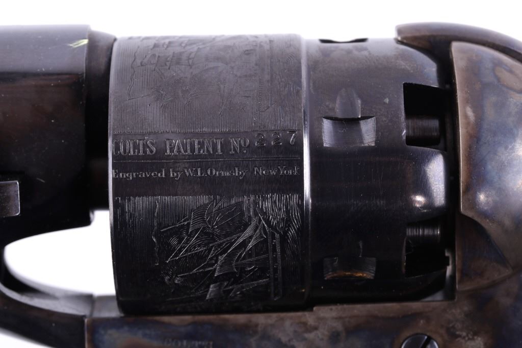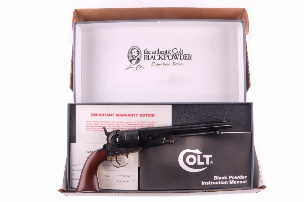 Featured in this lot is a Colt model 1860 percussion cap Army revolver chambered in .44 caliber. The revolver features an 8" barrel, 6 shot cylinder, walnut grips, brass trigger guard, brass blade front sight, and hammer notch rear sight. This was one of the most widely issued and popular revolvers of the Civil War, with many, if not most, going to the West after the war for Indian Wars or frontier service. This example is complete and functioning. It has matching numbers on the back strap, trigger guard, frame, and barrel. Overall, it displays an attractive deep aged patina with no evidence of having been buffed, polished, steel-wooled, or cleaned. This revolver also features the correct 8” barrel with sharp and clear Colt one line address on top, correct small front sight, attached loading lever functions correctly, one piece walnut grips fully intact. It is in excellent overall condition. The cylinder displays an engraved image of sailing ships by W.L. Ormsby and the cylinder is marked "Colt's Patent No. 227 Engraved By W.L. Ormsby New York". The frame, trigger guard, and barrel are marked with matching serial numbers and come with the original box. The revolver displays wonderful condition with tight mechanics and blue'd patina. Serial Number: 217227. Colt Black Powder Series firearm manufactured by Colt in the original box, qualifies as an Antique / Black Powder pistol but is a more modern manufacture, per the original condition and cardboard and paperwork.
