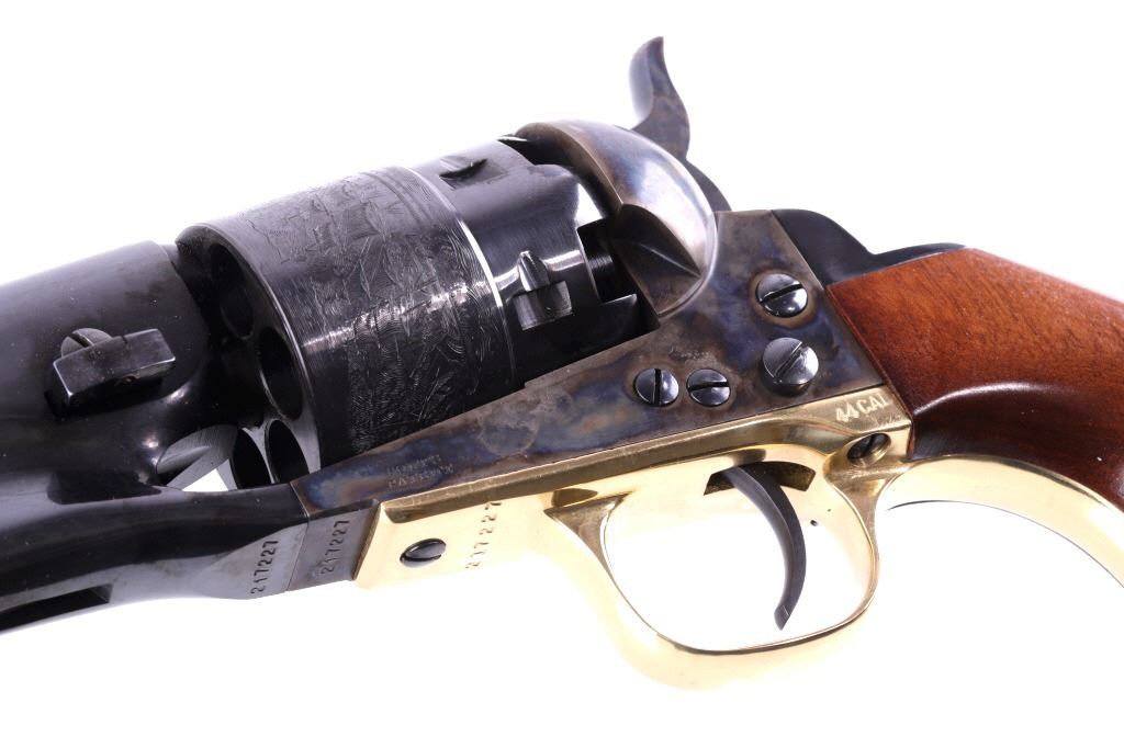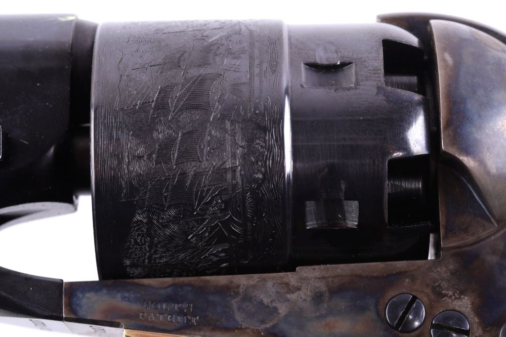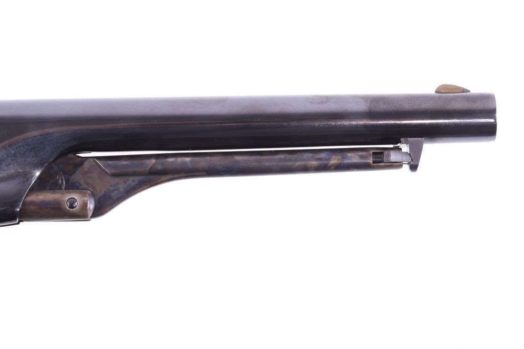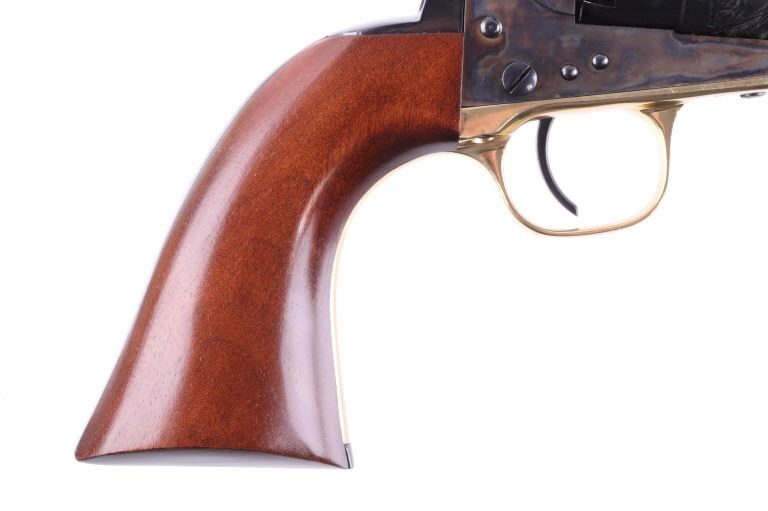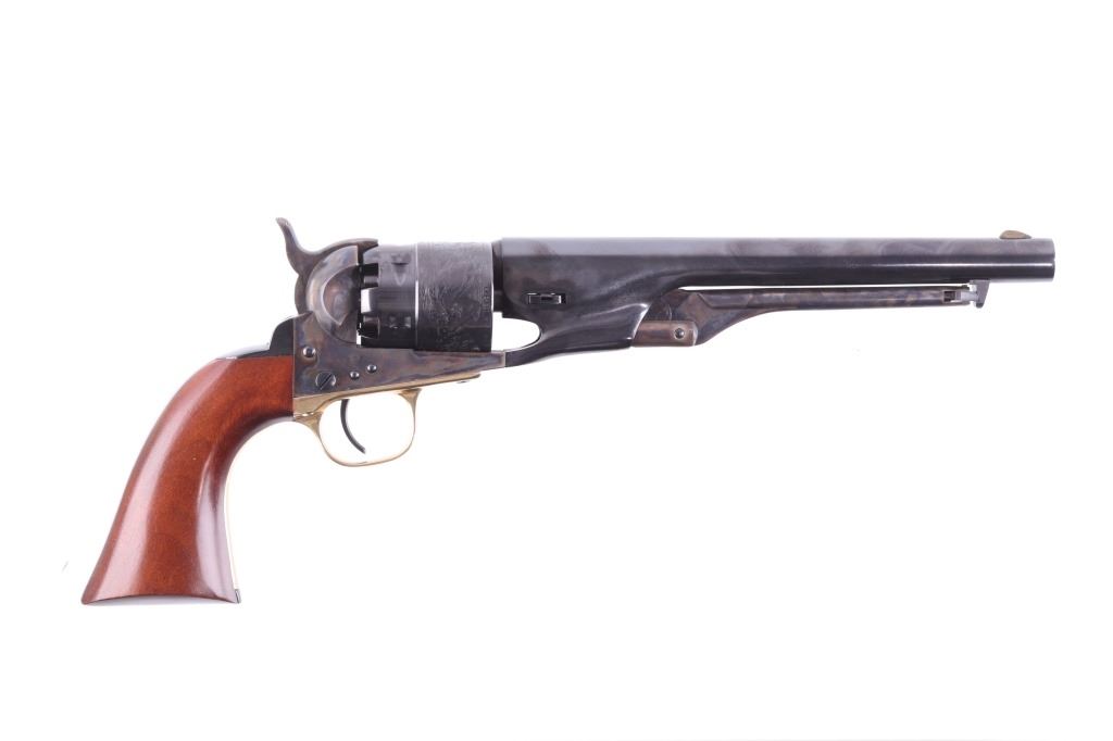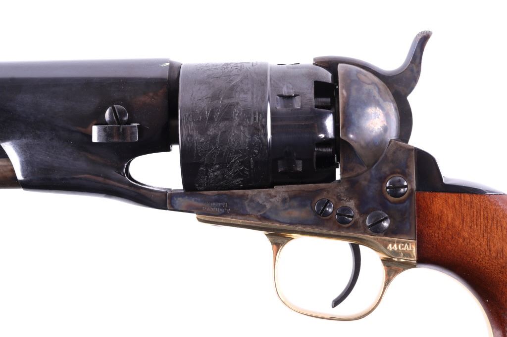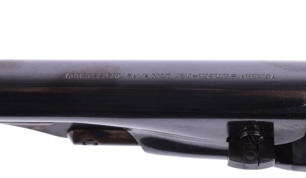 Featured in this lot is a Colt model 1860 percussion cap Army revolver chambered in .44 caliber. The revolver features an 8" barrel, 6 shot cylinder, walnut grips, brass trigger guard, brass blade front sight, and hammer notch rear sight. This was one of the most widely issued and popular revolvers of the Civil War, with many, if not most, going to the West after the war for Indian Wars or frontier service. This example is complete and functioning. It has matching numbers on the back strap, trigger guard, frame, and barrel. Overall, it displays an attractive deep aged patina with no evidence of having been buffed, polished, steel-wooled, or cleaned. This revolver also features the correct 8” barrel with sharp and clear Colt one line address on top, correct small front sight, attached loading lever functions correctly, one piece walnut grips fully intact. It is in excellent overall condition. The cylinder displays an engraved image of sailing ships by W.L. Ormsby and the cylinder is marked "Colt's Patent No. 227 Engraved By W.L. Ormsby New York". The frame, trigger guard, and barrel are marked with matching serial numbers and come with the original box. The revolver displays wonderful condition with tight mechanics and blue'd patina. Serial Number: 217227. Colt Black Powder Series firearm manufactured by Colt in the original box, qualifies as an Antique / Black Powder pistol but is a more modern manufacture, per the original condition and cardboard and paperwork.