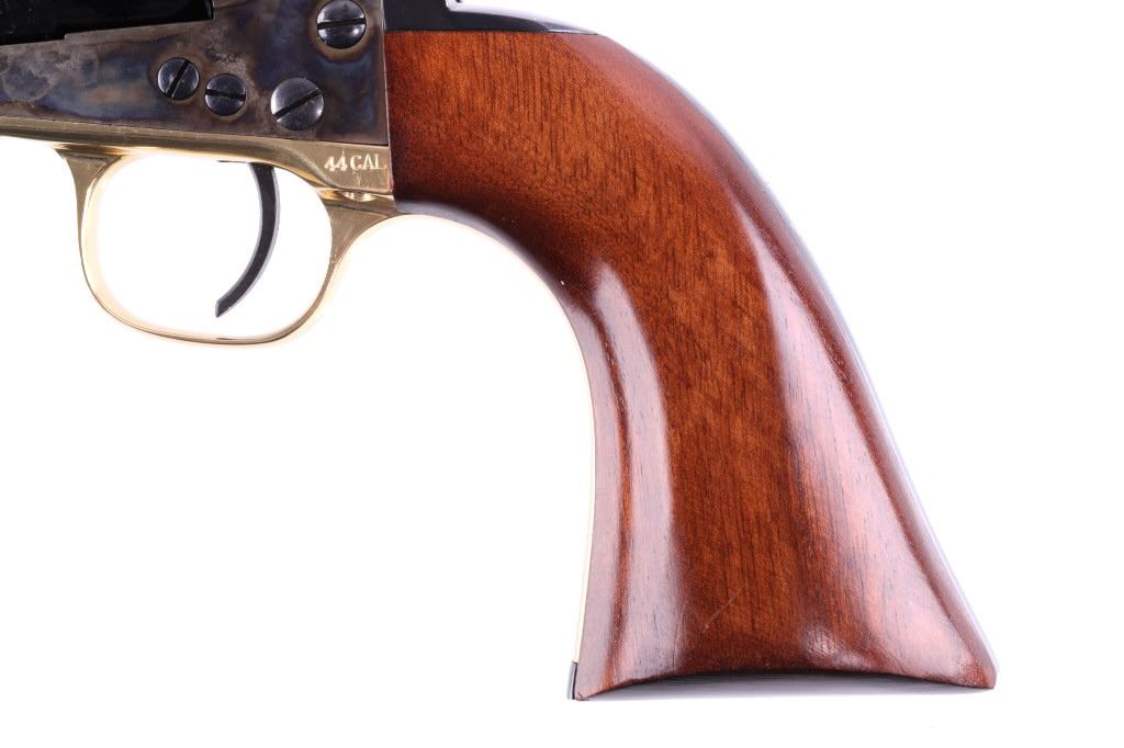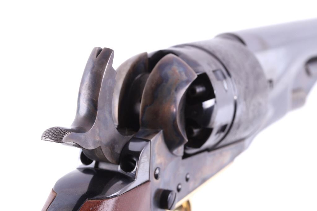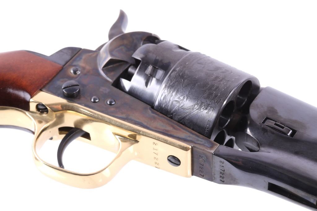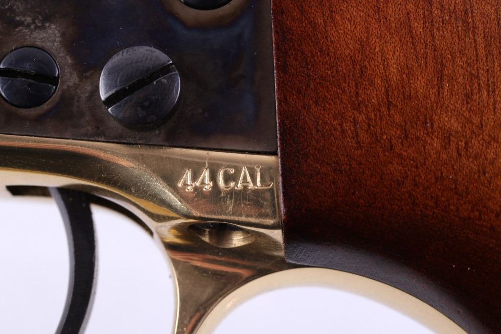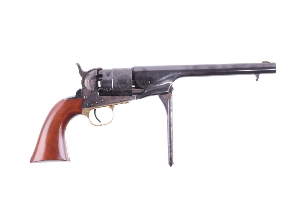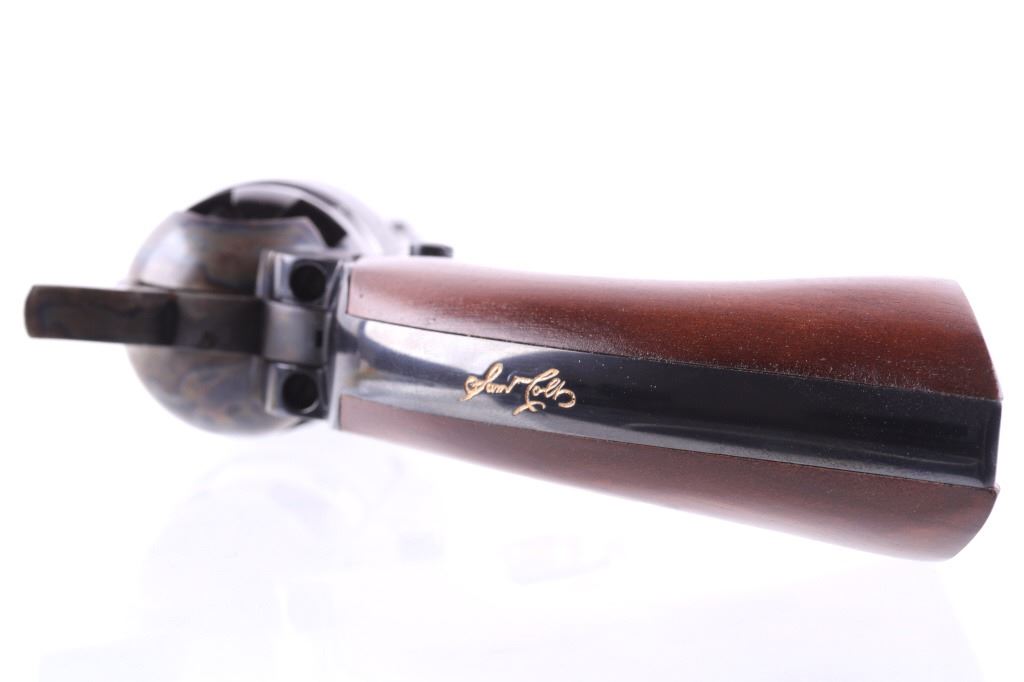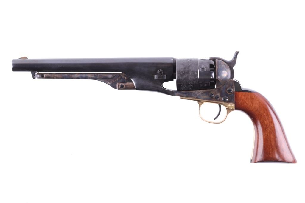 Featured in this lot is a Colt model 1860 percussion cap Army revolver chambered in .44 caliber. The revolver features an 8" barrel, 6 shot cylinder, walnut grips, brass trigger guard, brass blade front sight, and hammer notch rear sight. This was one of the most widely issued and popular revolvers of the Civil War, with many, if not most, going to the West after the war for Indian Wars or frontier service. This example is complete and functioning. It has matching numbers on the back strap, trigger guard, frame, and barrel. Overall, it displays an attractive deep aged patina with no evidence of having been buffed, polished, steel-wooled, or cleaned. This revolver also features the correct 8” barrel with sharp and clear Colt one line address on top, correct small front sight, attached loading lever functions correctly, one piece walnut grips fully intact. It is in excellent overall condition. The cylinder displays an engraved image of sailing ships by W.L. Ormsby and the cylinder is marked "Colt's Patent No. 227 Engraved By W.L. Ormsby New York". The frame, trigger guard, and barrel are marked with matching serial numbers and come with the original box. The revolver displays wonderful condition with tight mechanics and blue'd patina. Serial Number: 217227. Colt Black Powder Series firearm manufactured by Colt in the original box, qualifies as an Antique / Black Powder pistol but is a more modern manufacture, per the original condition and cardboard and paperwork.